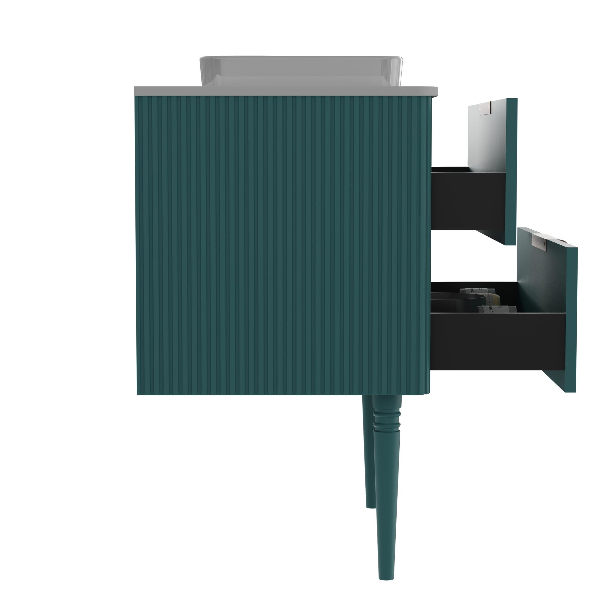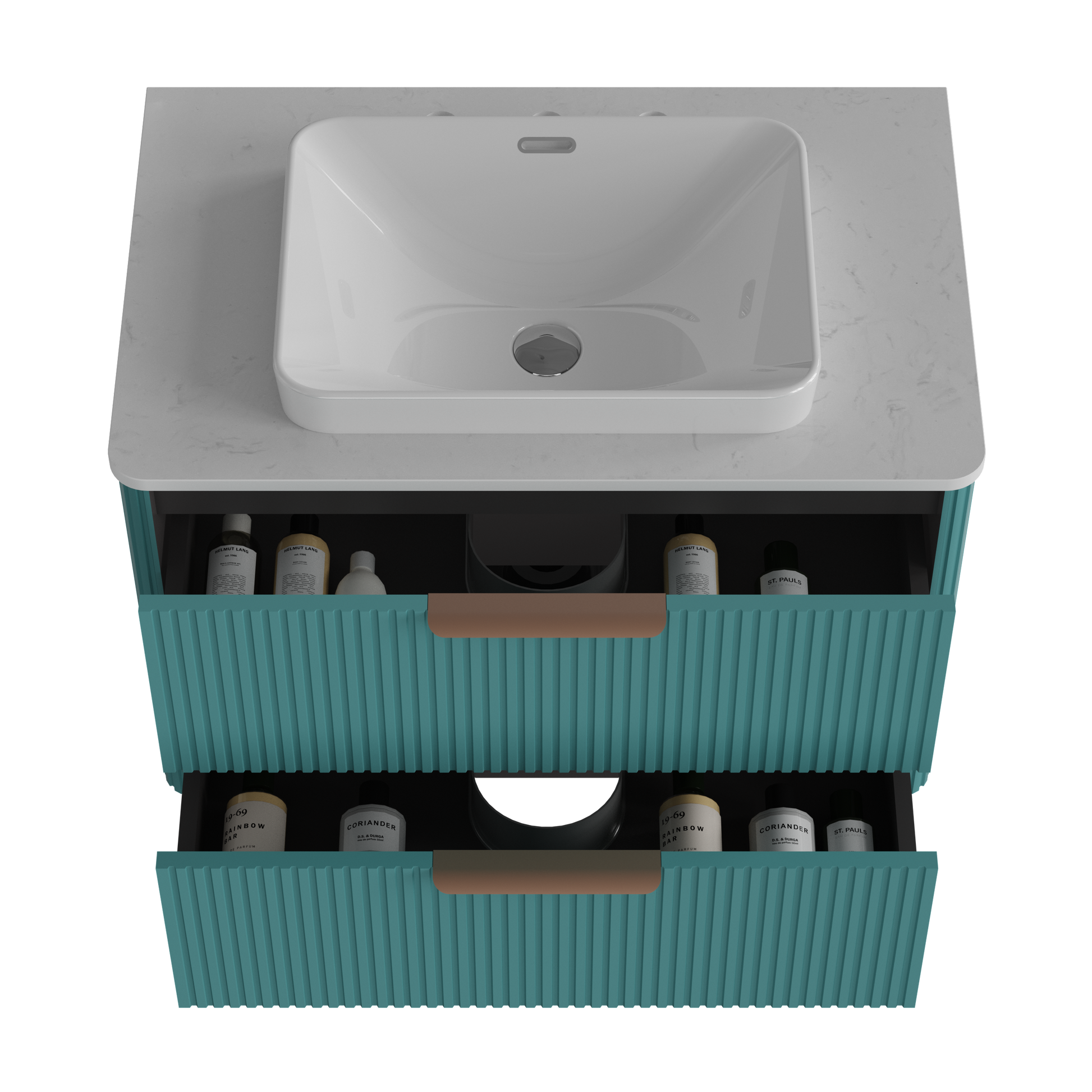 This modern and versatile bathroom vanity can be used as either a freestanding or wall-mounted unit, offering flexibility to fit your bathroom layout. Its elegant grille design with rounded corners combines beauty and safety, redefining bathroom aesthetics. Made from E1 grade eco-friendly panels with a smoked oak laminated surface, it ensures superior water resistance and delivers an exceptional tactile and visual experience. The antique bronze handles blend modern and classic styles seamlessly, while the double-drawer design with ultra-thin U-shaped drainage holes offers ample storage space to keep essentials organized and within reach. Built for durability and convenience, the vanity features DTC hidden soft-closing bottom rails and hinges for smooth and silent operation, has passed rigorous 48-hour salt spray testing for rust resistance, and each drawer can hold up to 55 lbs.