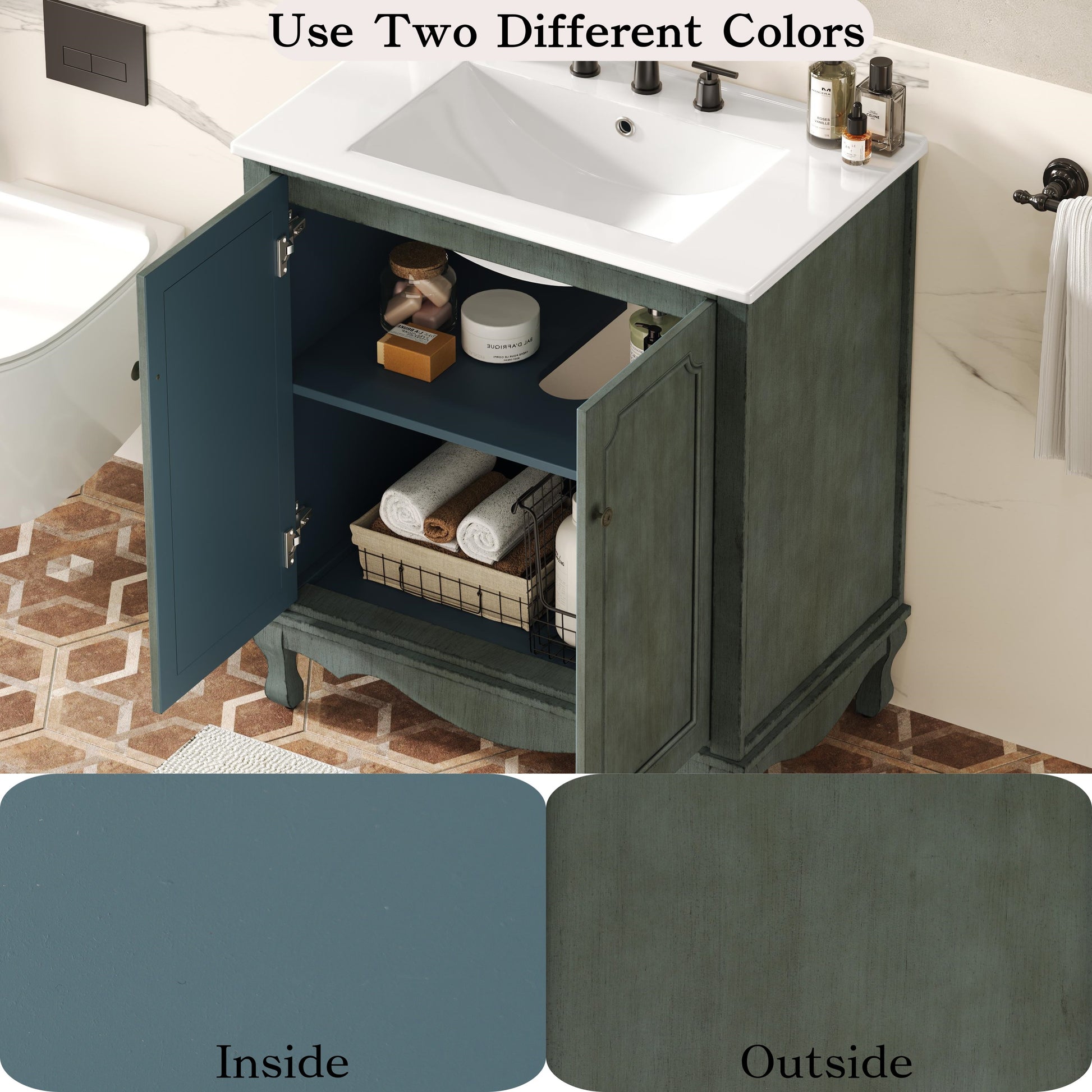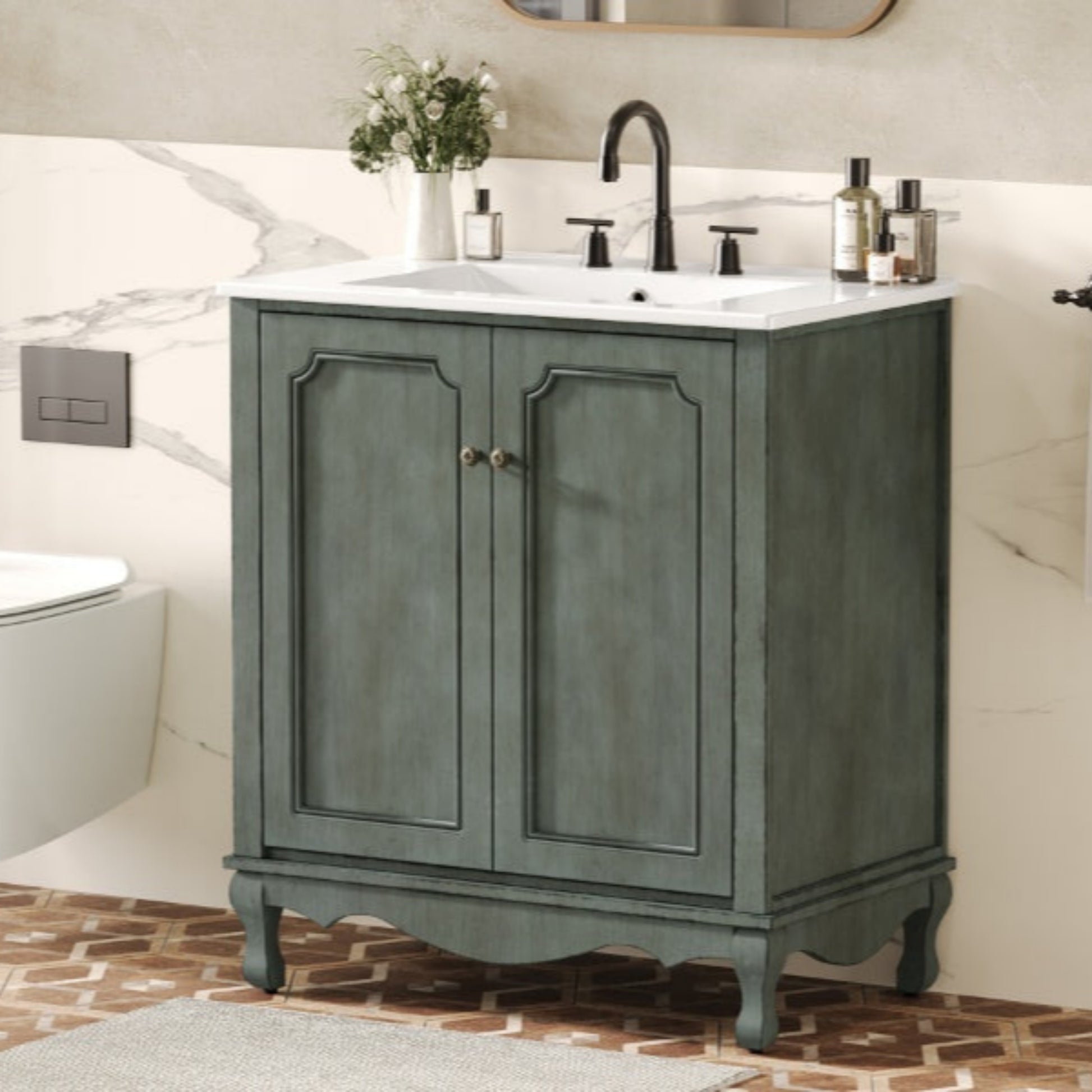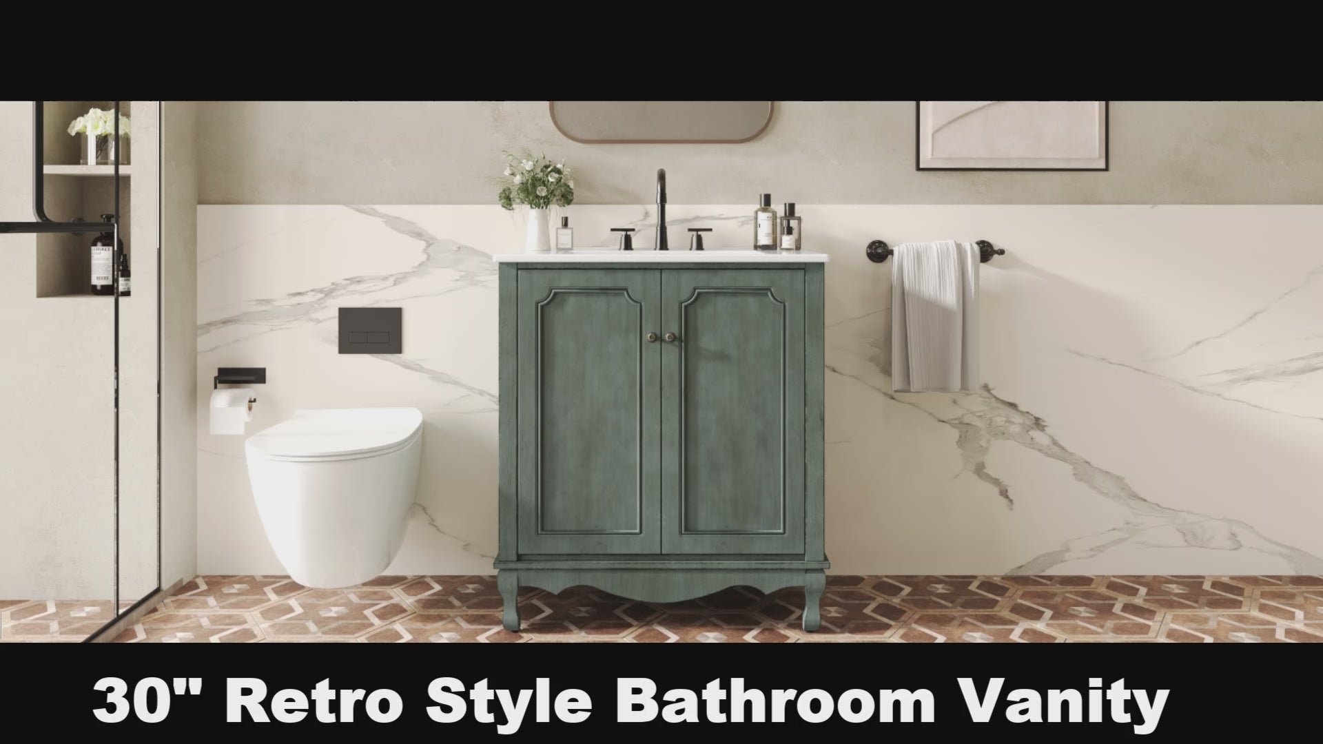This 30-inch vintage bathroom vanity features an elegant antique blue finish with retro-style panel doors and exquisite bronze handles, perfectly blending classic charm with modern practicality. It includes a high-quality rectangular ceramic sink that is glossy, anti-spill, scratch-resistant, and easy to maintain. The soft-close doors open to reveal adjustable shelves for customizable storage, while sturdy solid wood legs ensure stability and durability. With eco-friendly low-formaldehyde paint, pre-drilled faucet holes, and a pre-cut back panel for easy plumbing access, this vanity offers both style and convenience. Its combination of timeless design and functional details makes it an ideal centerpiece for traditional, farmhouse, or eclectic bathrooms.