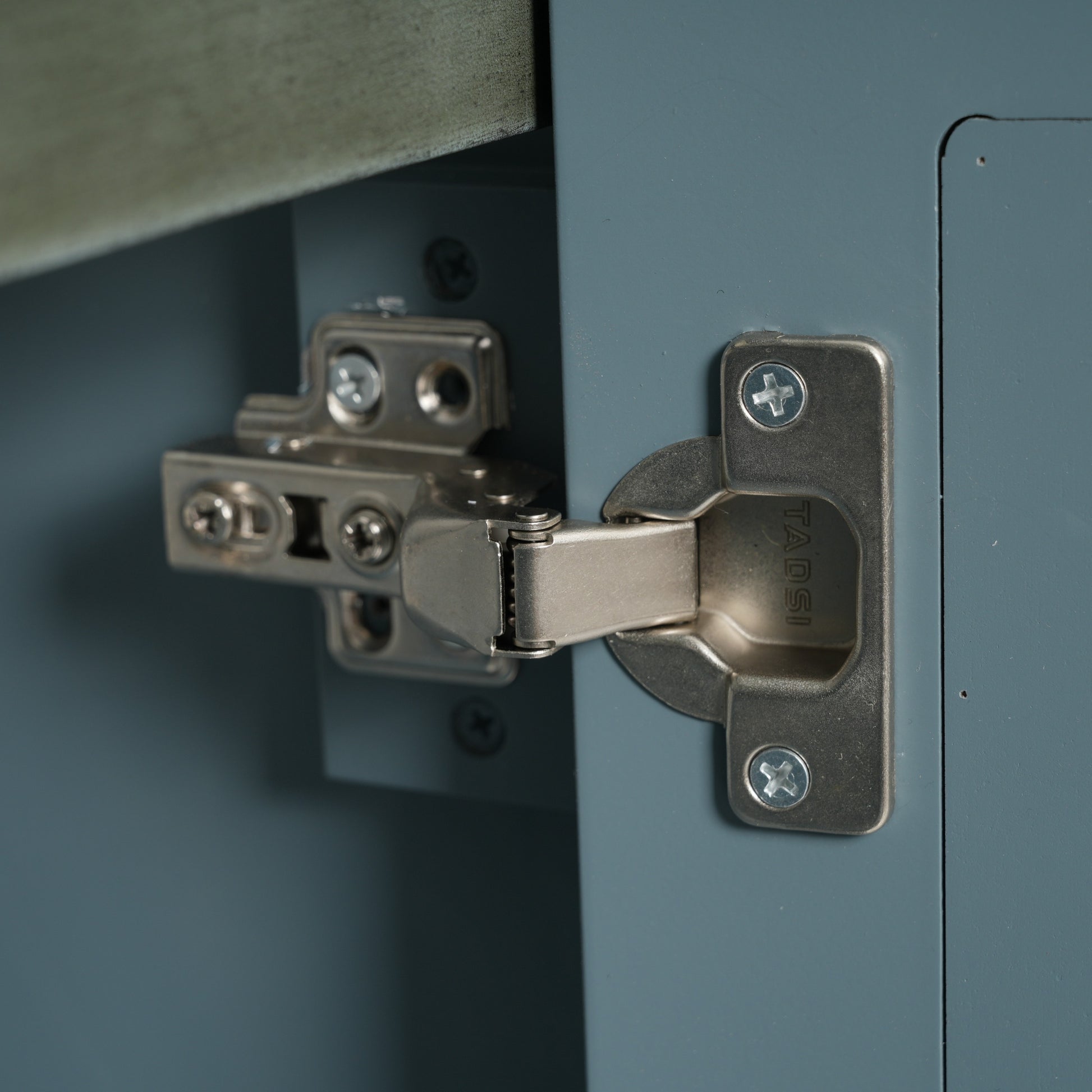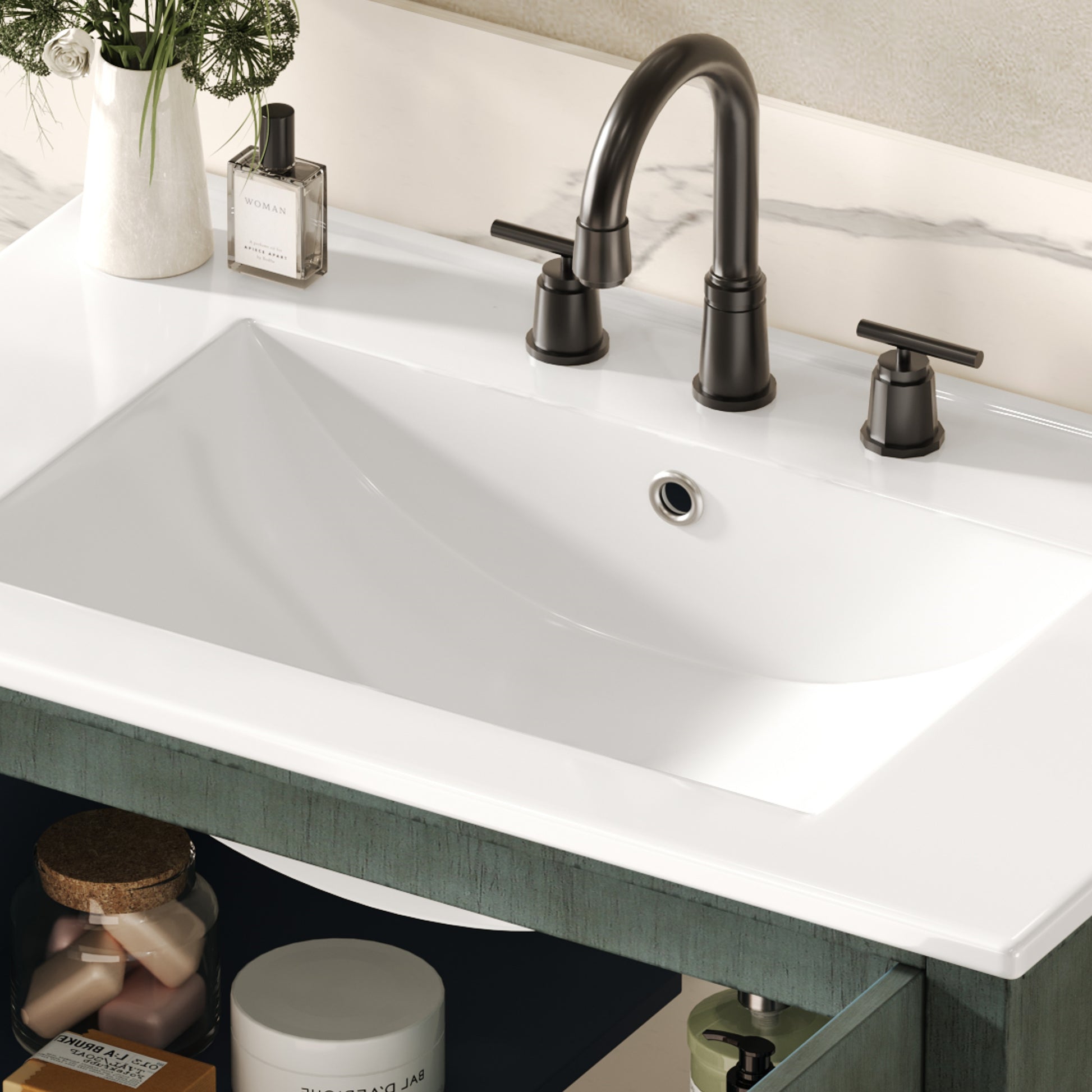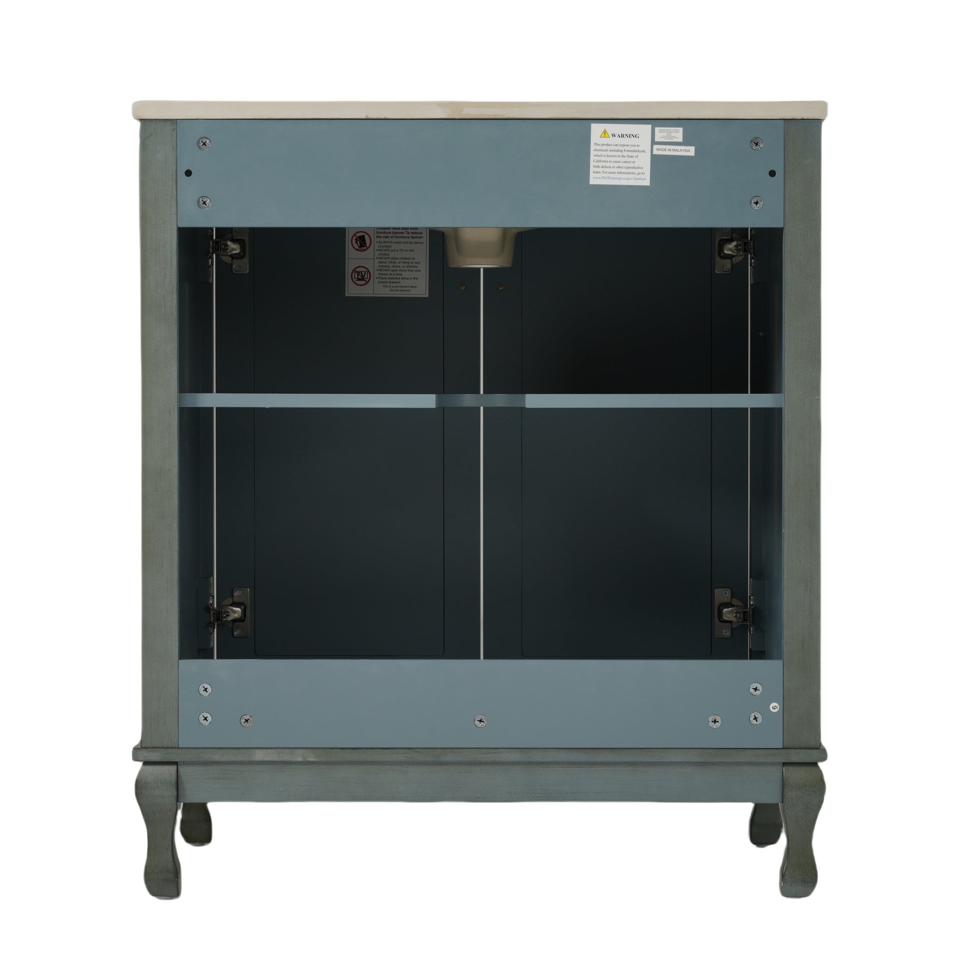 This 30-inch vintage bathroom vanity features an elegant antique blue finish with retro-style panel doors and exquisite bronze handles, perfectly blending classic charm with modern practicality. It includes a high-quality rectangular ceramic sink that is glossy, anti-spill, scratch-resistant, and easy to maintain. The soft-close doors open to reveal adjustable shelves for customizable storage, while sturdy solid wood legs ensure stability and durability. With eco-friendly low-formaldehyde paint, pre-drilled faucet holes, and a pre-cut back panel for easy plumbing access, this vanity offers both style and convenience. Its combination of timeless design and functional details makes it an ideal centerpiece for traditional, farmhouse, or eclectic bathrooms.