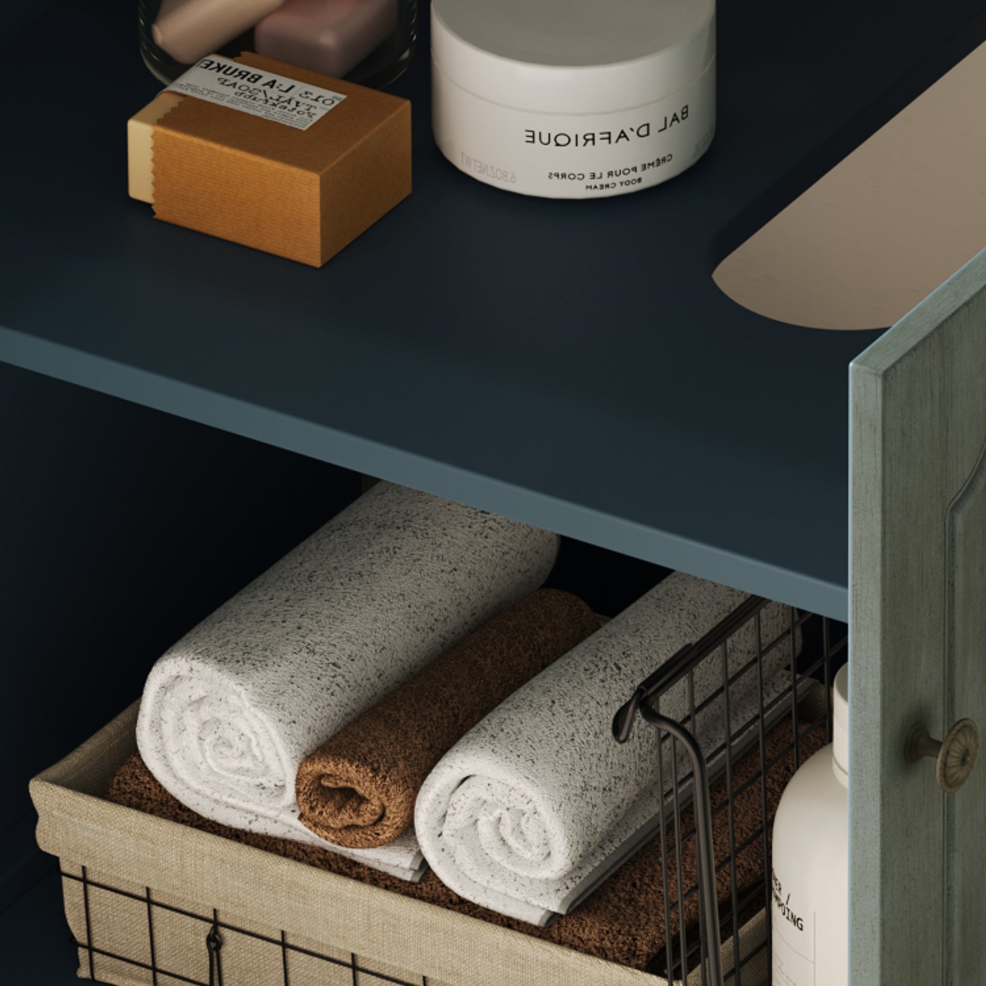Adjustable shelves behind soft close doors fit towels toiletries and cleaning items