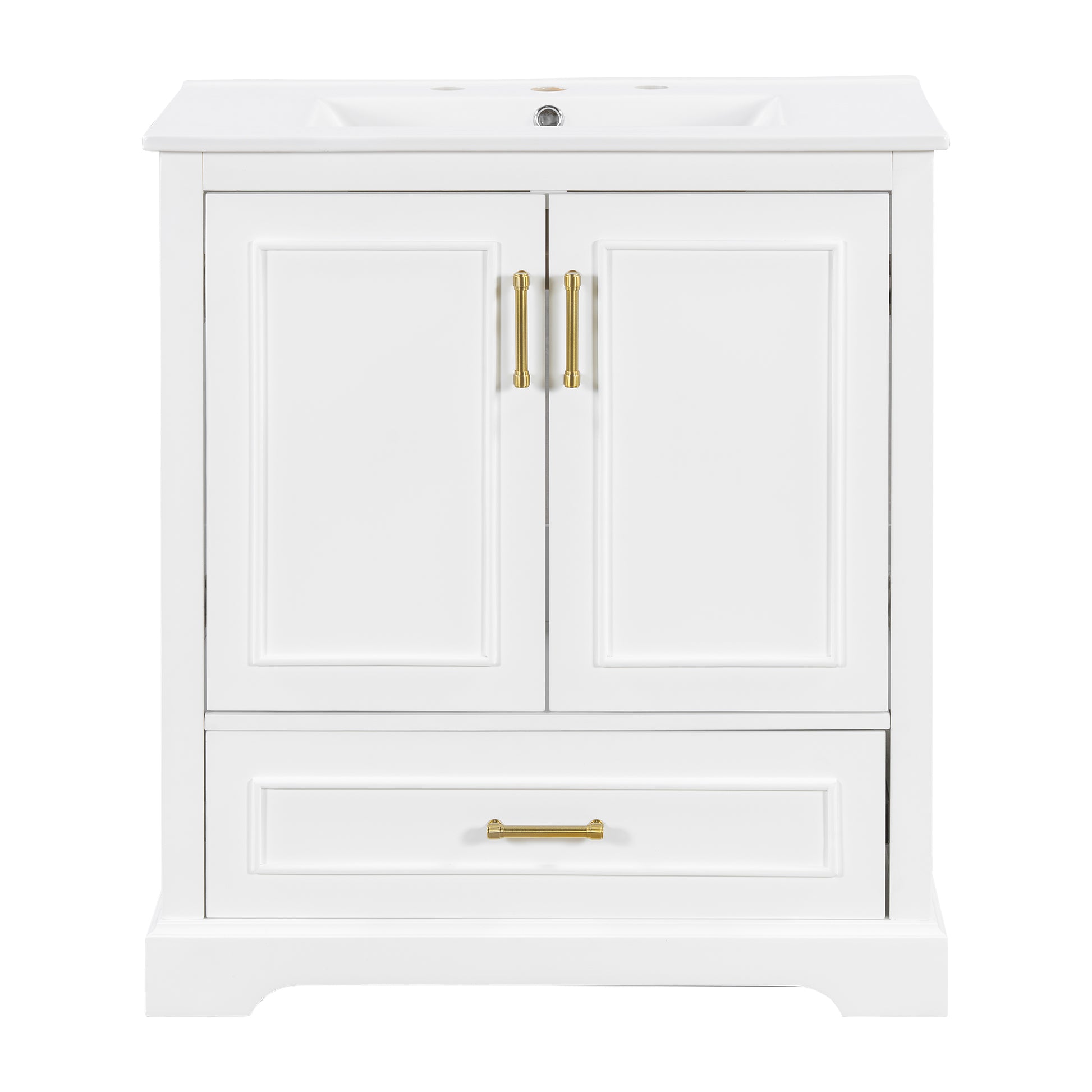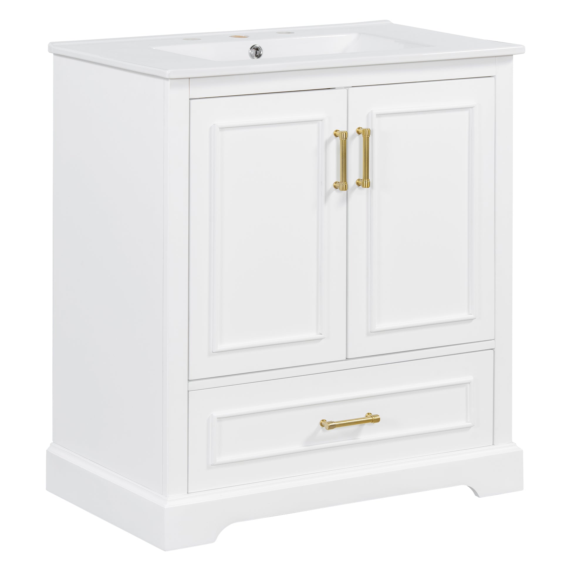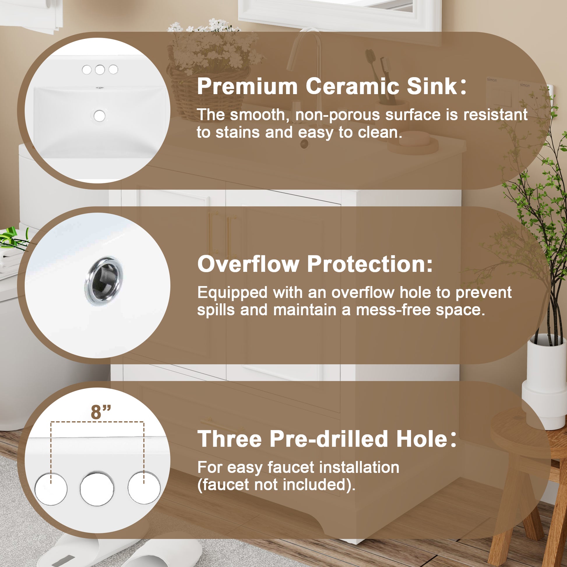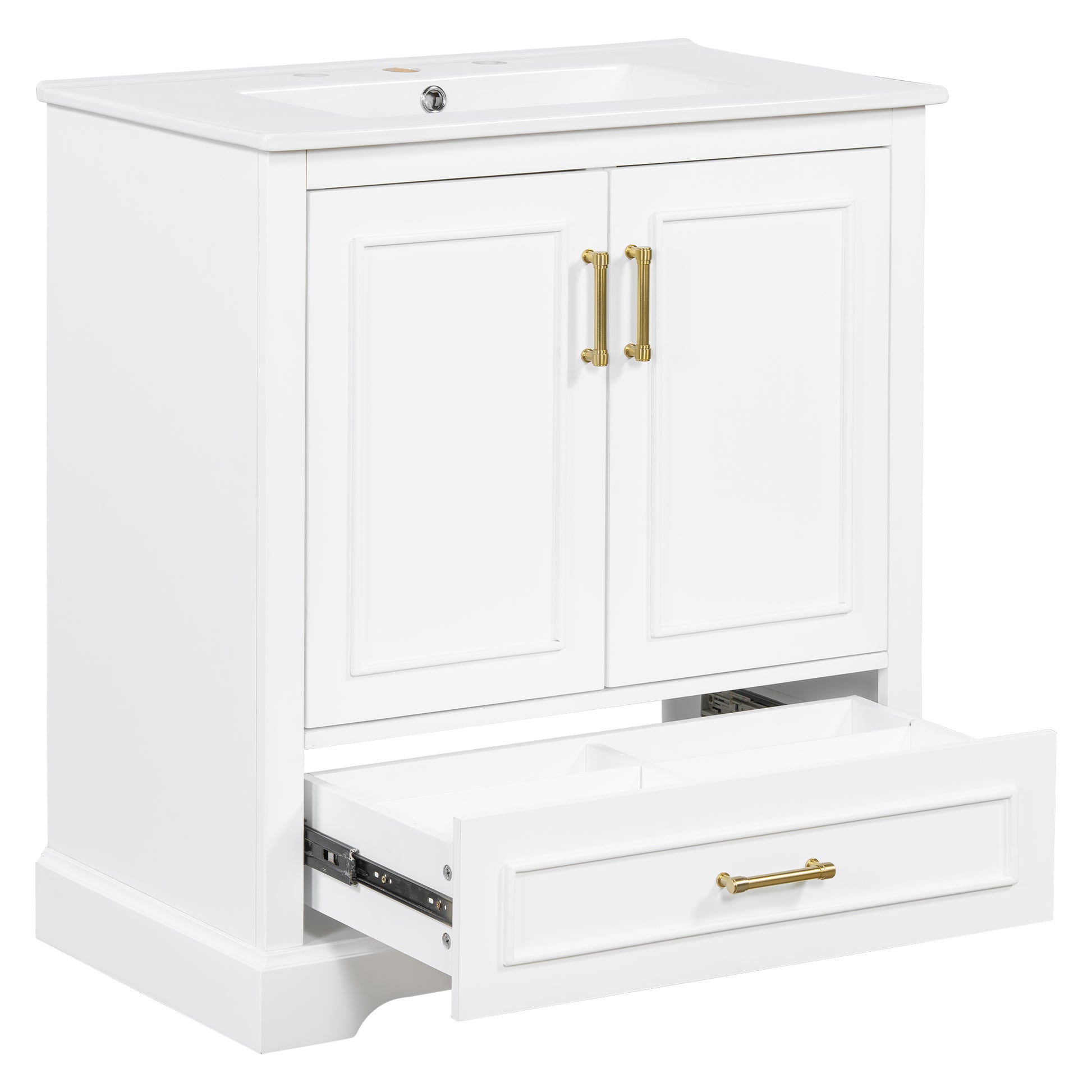 30 Inch White Bathroom Vanity with Ceramic Sink Solid Wood Frame MDF Divider Drawer 2 Soft Close Doors with Double Door Shelves
