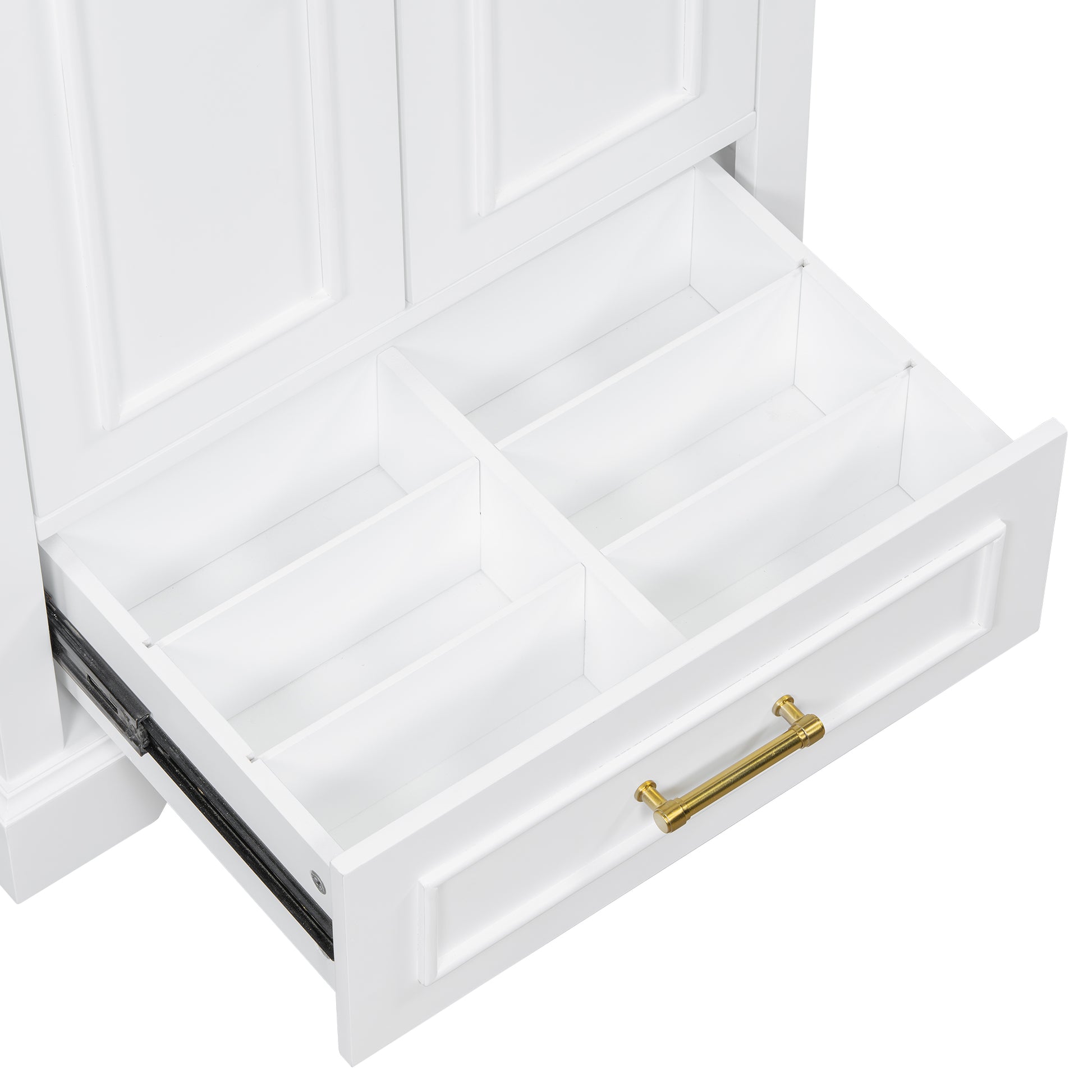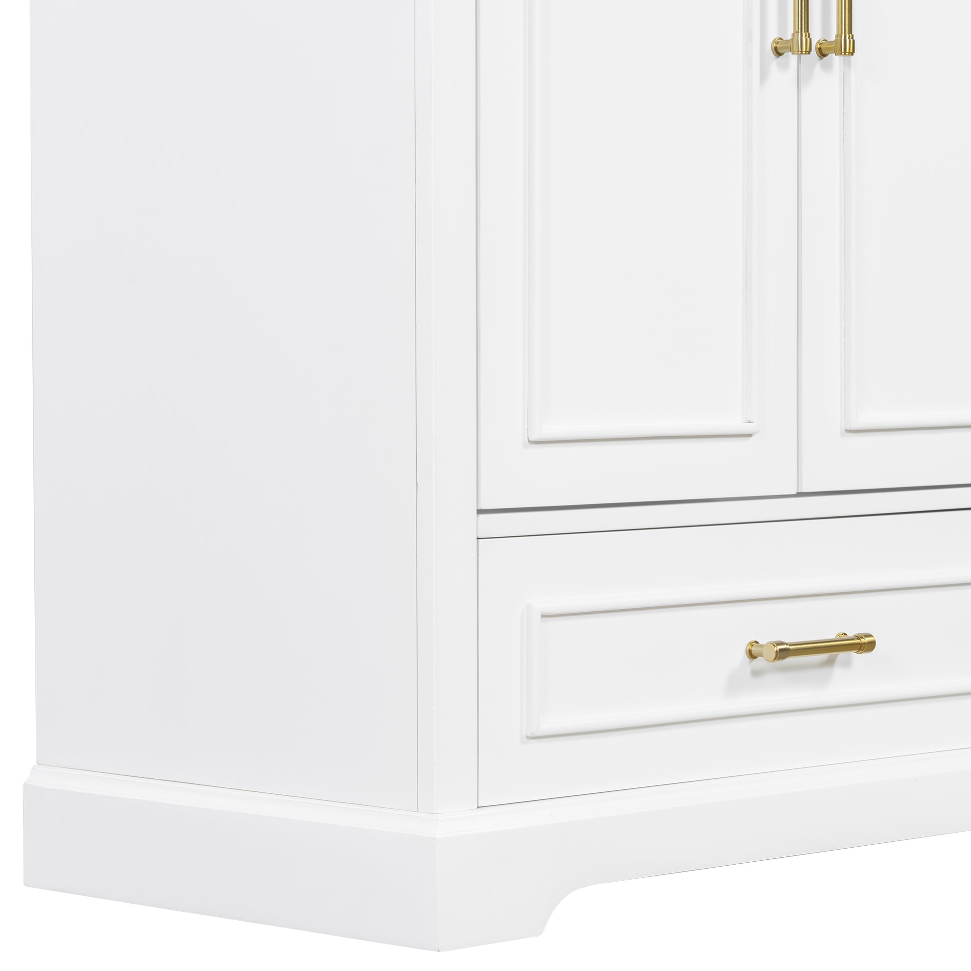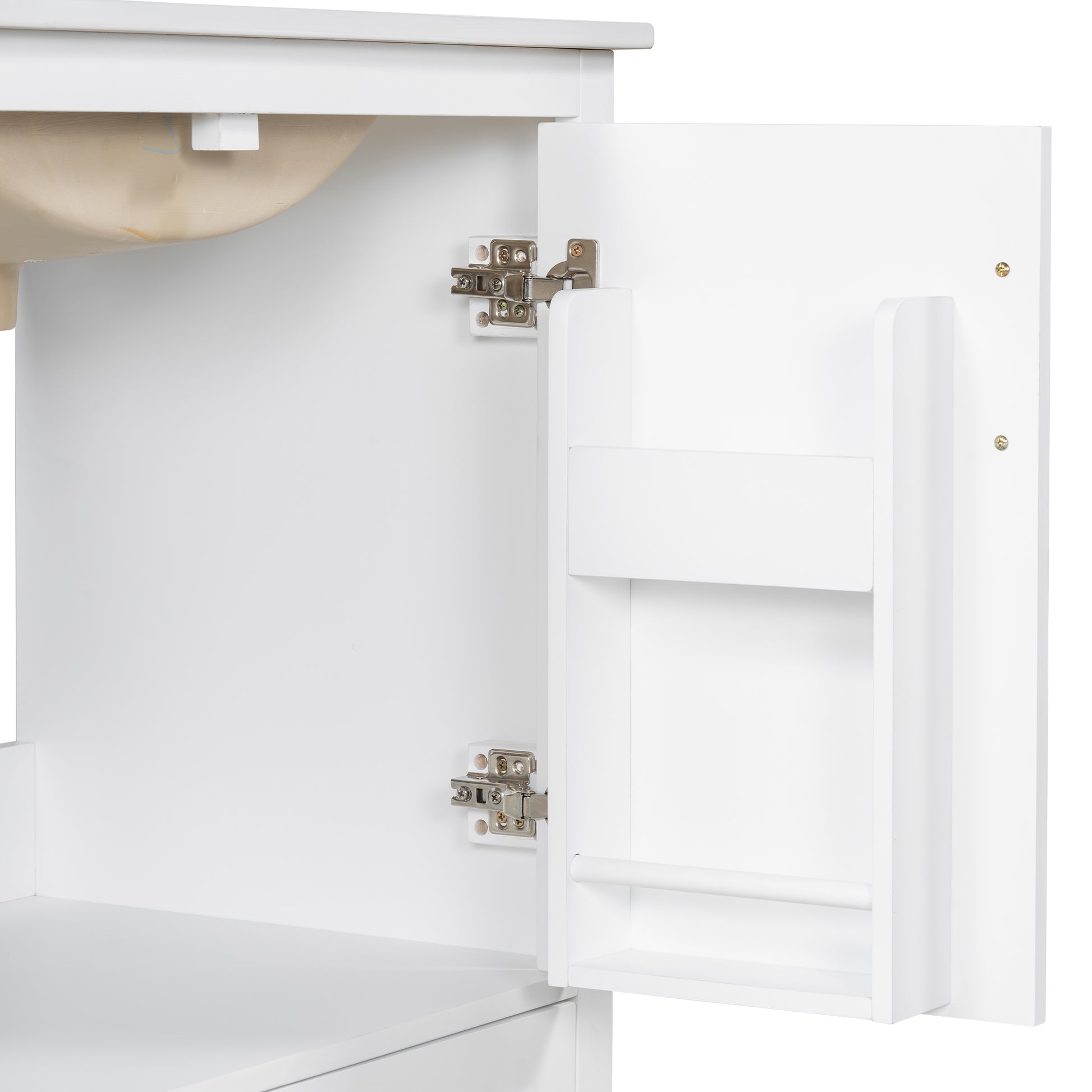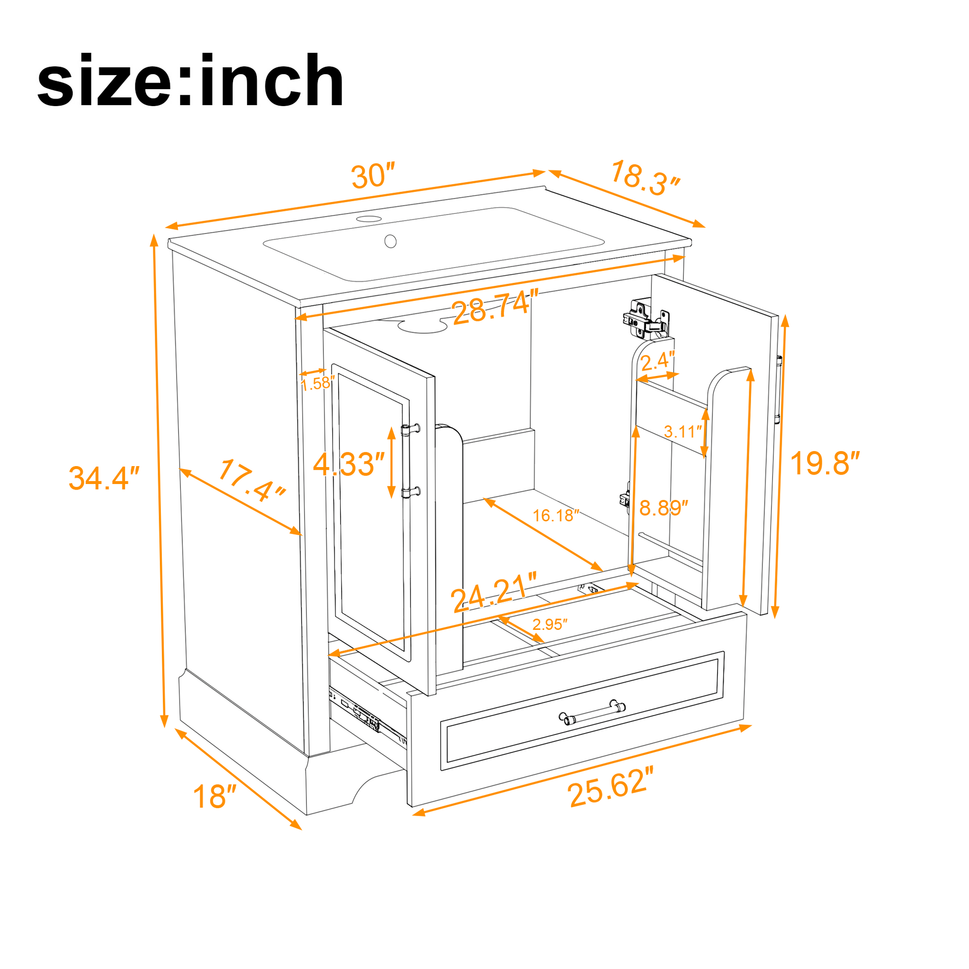 30 Inch White Bathroom Vanity with Ceramic Sink Solid Wood Frame MDF Divider Drawer 2 Soft Close Doors with Double Door Shelves