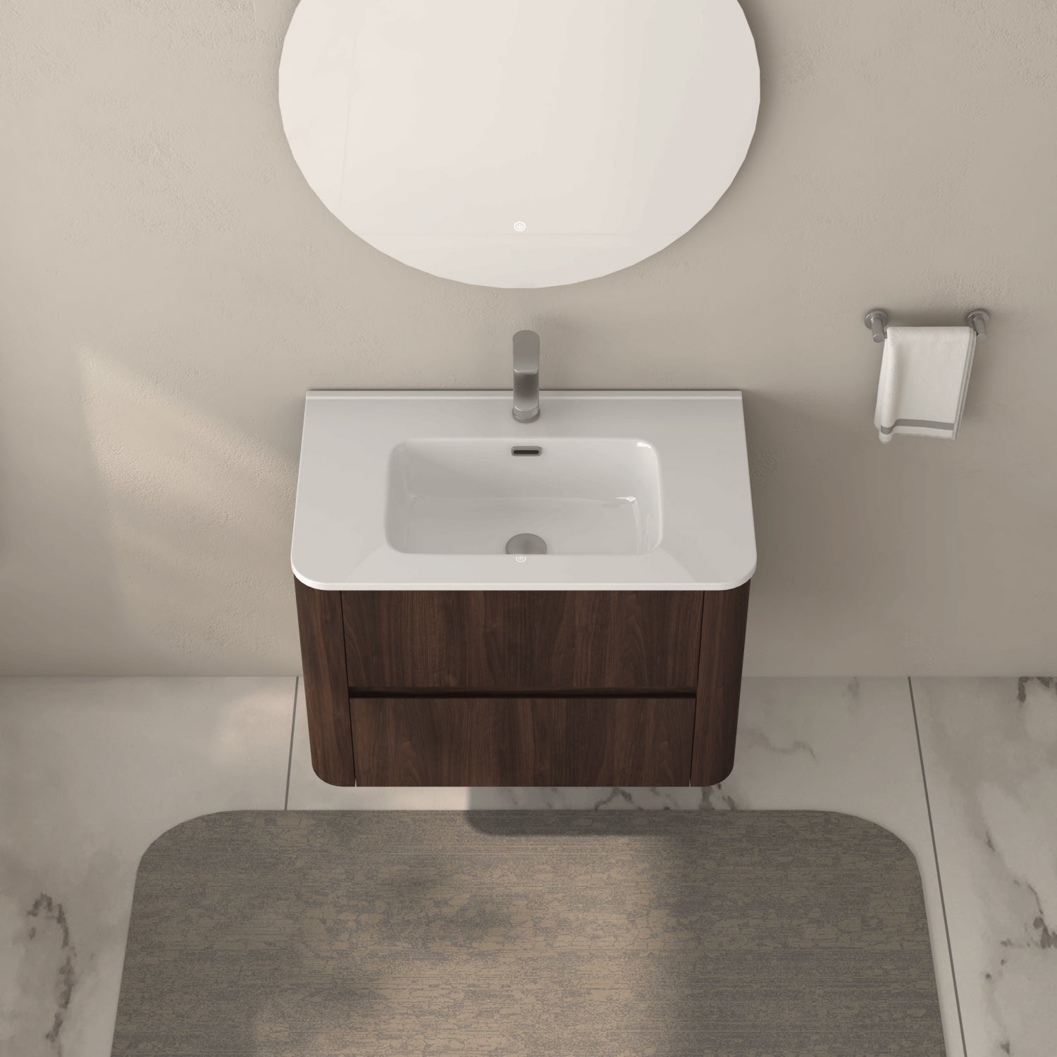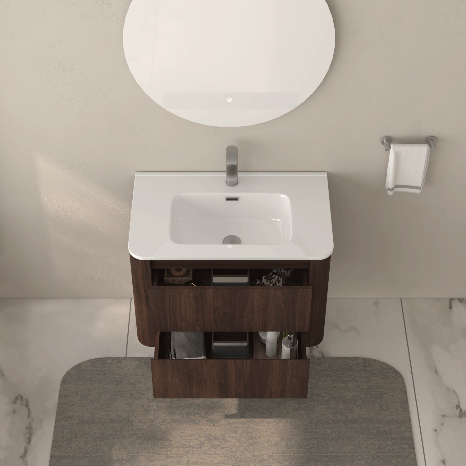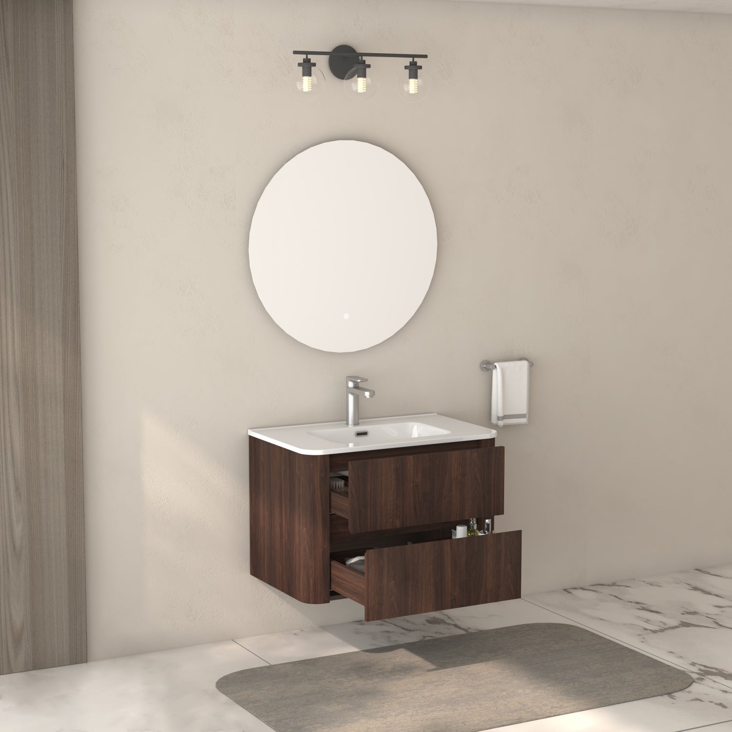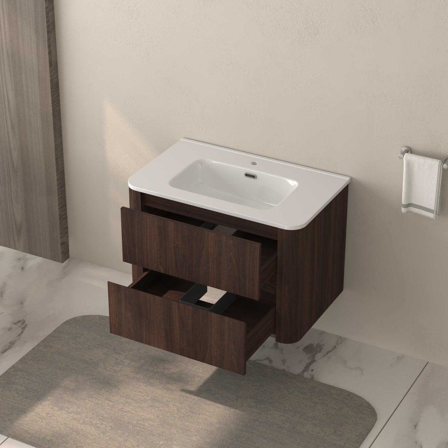 Upgrade your bathroom with this 30" floating vanity in a sophisticated Dark Walnut finish. Featuring two deep soft-close drawers, it offers ample organized storage for toiletries, cosmetics, and daily essentials. The premium integrated ceramic sink is impact-resistant, stain-proof, and easy to clean. Built from moisture-resistant plywood, this vanity is designed to withstand humid bathroom environments without warping or swelling. Its wall-mounted installation not only frees floor space for easier cleaning but also enhances modern, minimalist interiors. Pre-assembled for quick and hassle-free installation. (Faucet, drain, and mirror not included).