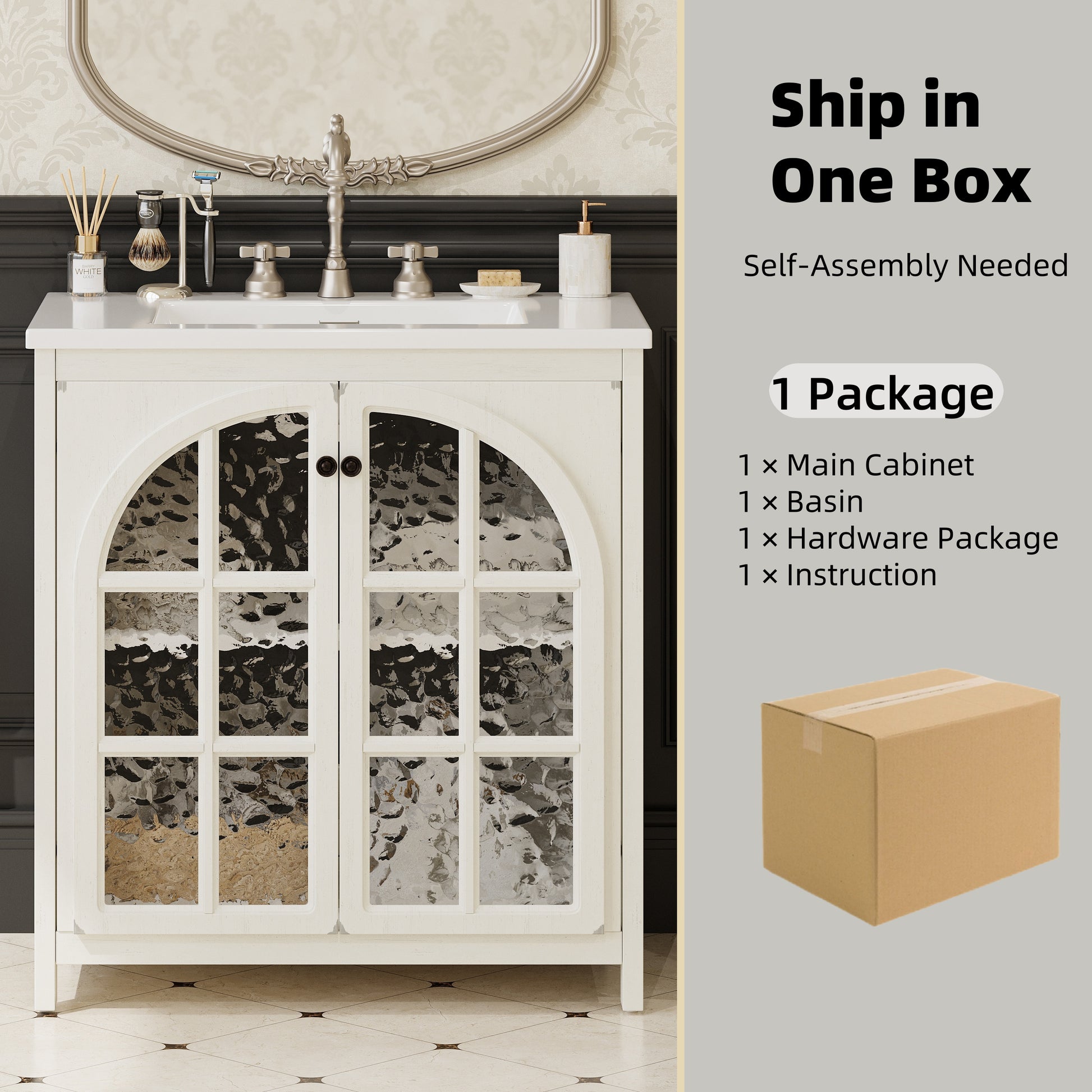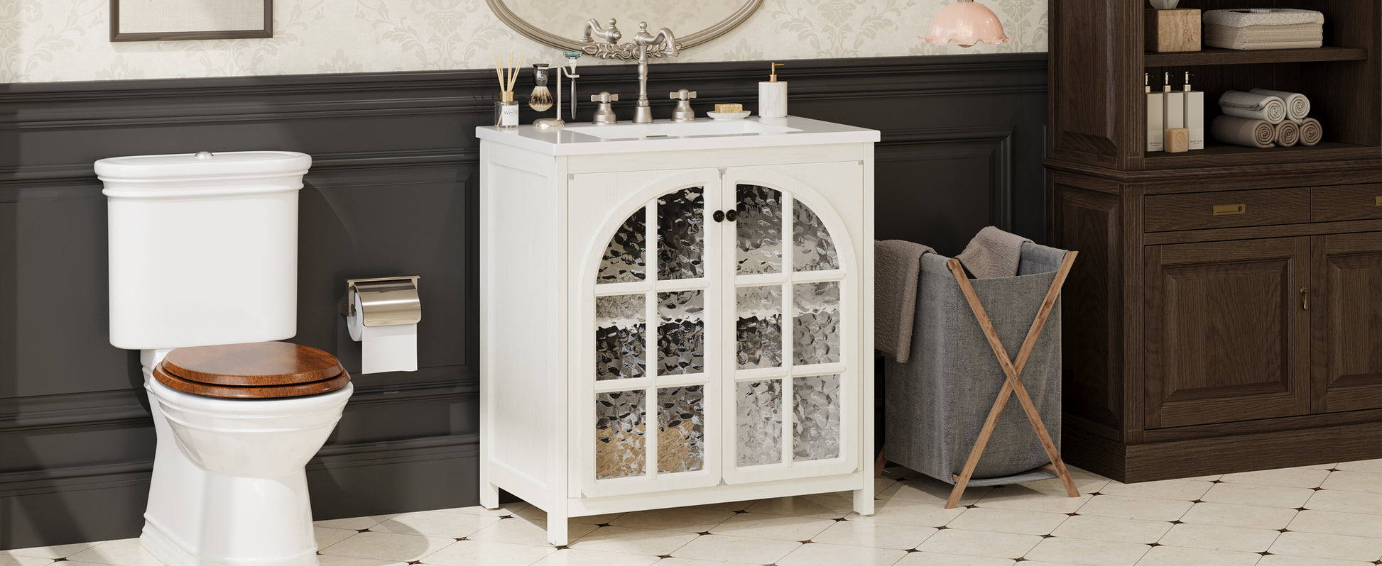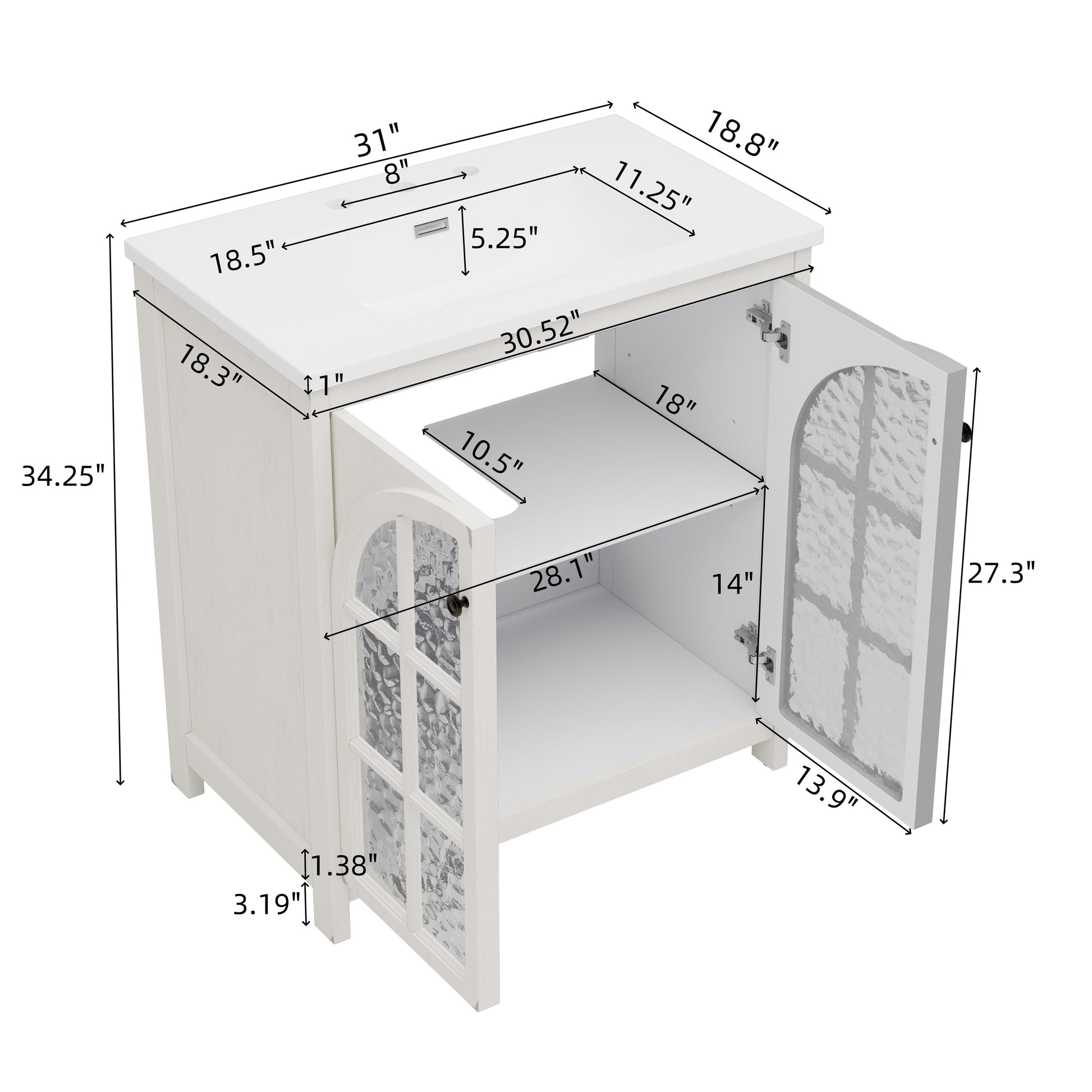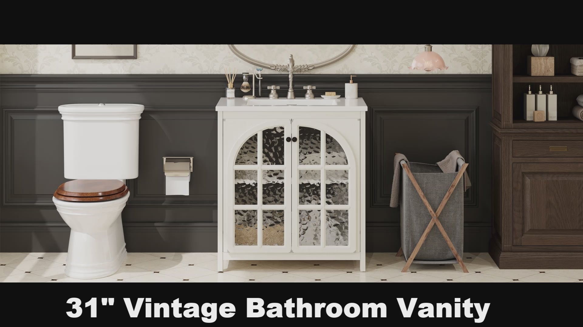 This 31-inch vintage bathroom vanity, finished in antique white, combines timeless elegance with practical design. It features a high-quality rectangular ceramic sink with a deep 5.25" basin, glossy surface resistant to stains and scratches, and a pre-drilled faucet hole for easy installation. The vanity offers spacious storage with two soft-close doors and adjustable shelves, keeping essentials organized. Safe tempered glass enhances durability and safety, making it resistant to impacts. Measuring 31"L × 18.8"W × 34.25"H and supporting up to 120 lbs, this vanity is ideal for small to medium bathrooms seeking a blend of vintage charm, durability, and functionality.