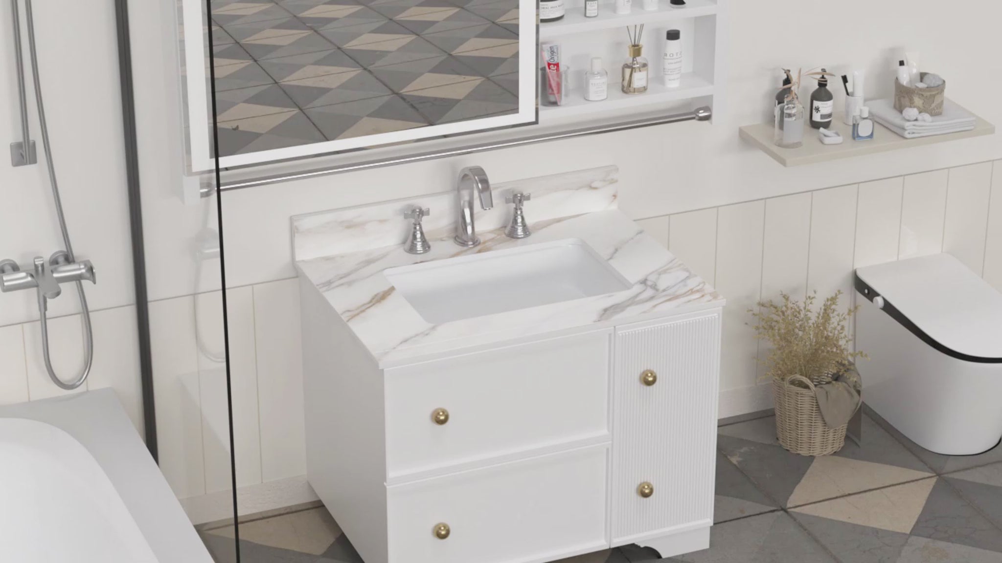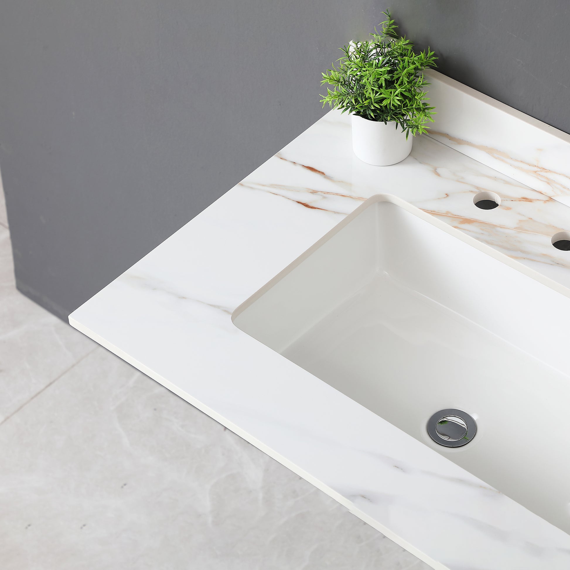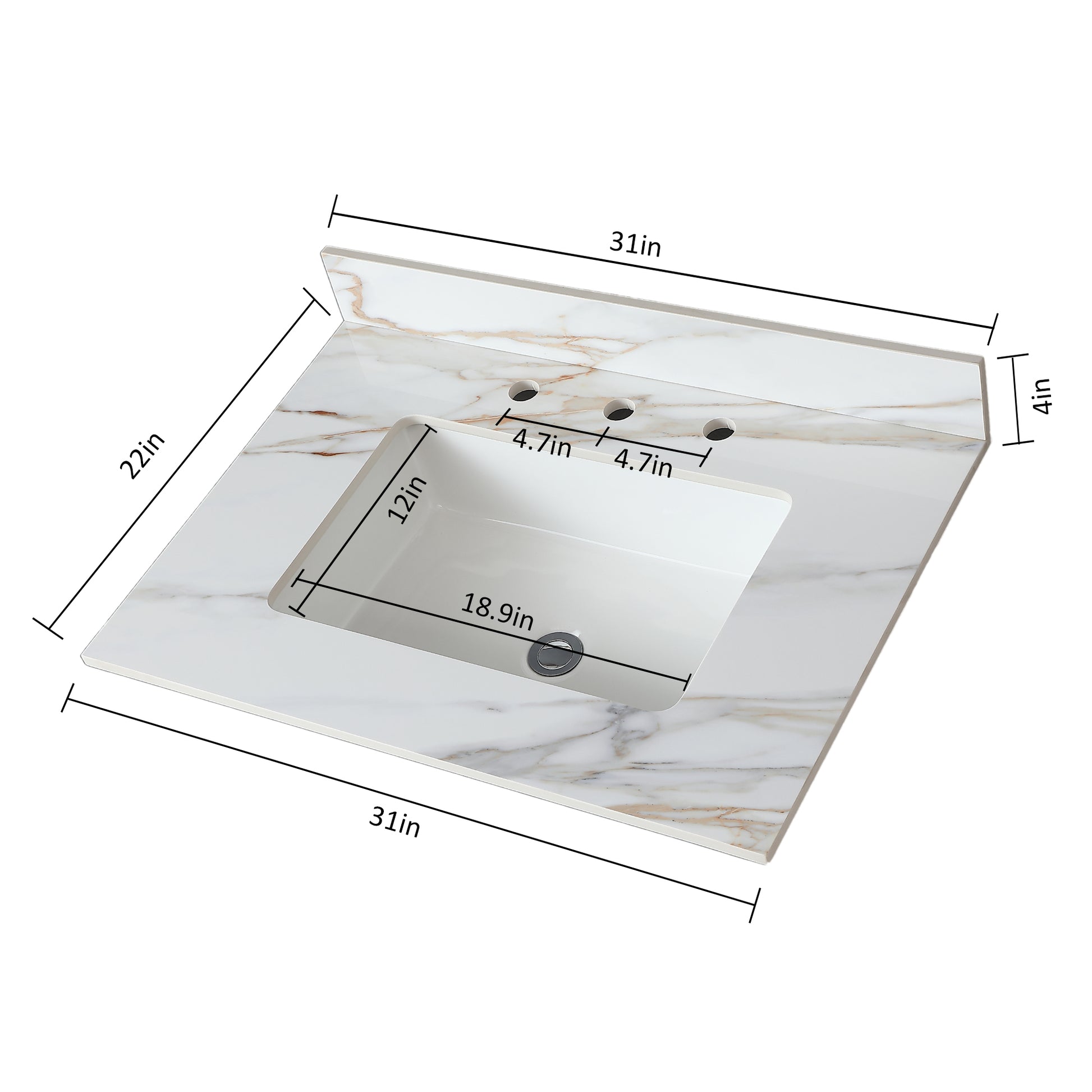Upgrade your bathroom with this stylish 31-inch marble vanity top, featuring a Carrara white finish with subtle veins. The integrated undermount rectangular sink and a 4-inch high backsplash combine functionality and style. The 4-inch high rear baffle + anti-overflow hole + anti-drip edge effectively protects the wall and countertop.this vanity top is designed to fit most standard vanity cabinets. Its sintered stone construction ensures durability, resistance to stains, and ease of maintenance, making it a perfect choice for modern bathrooms.