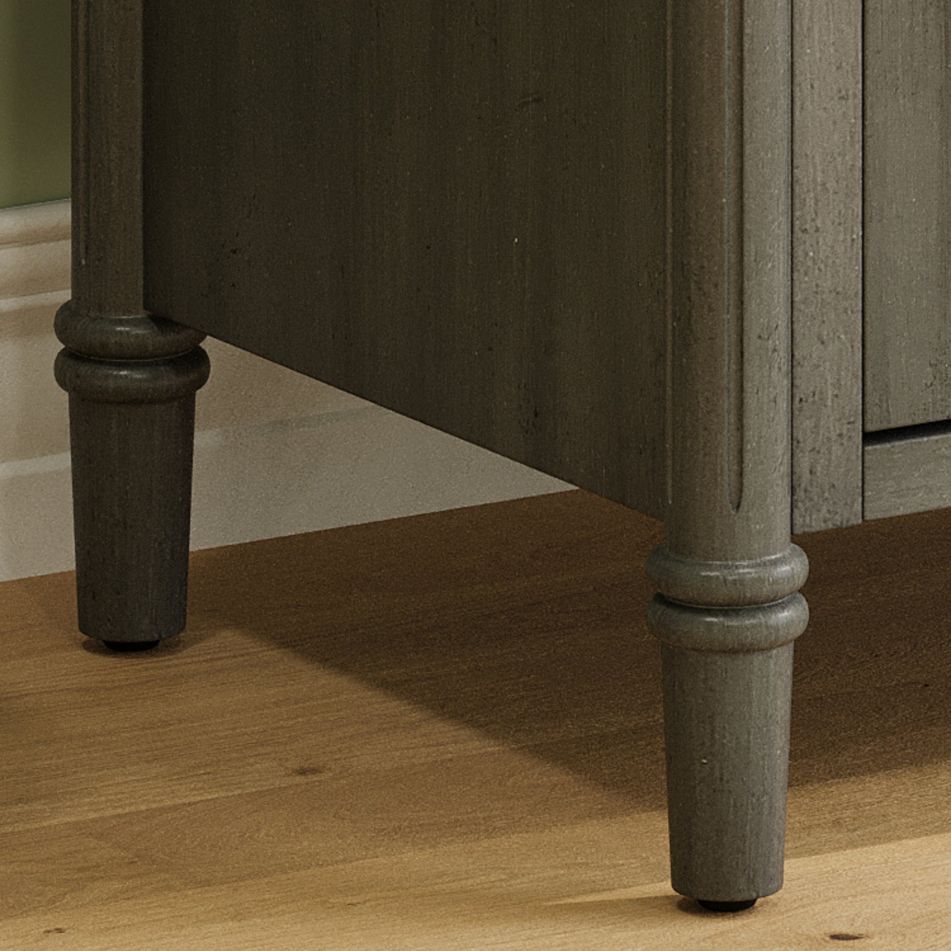 Antique gray finish with crafted panel doors adds retro elegance to any bathroom