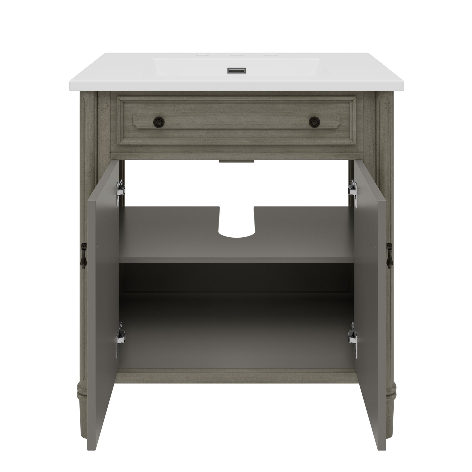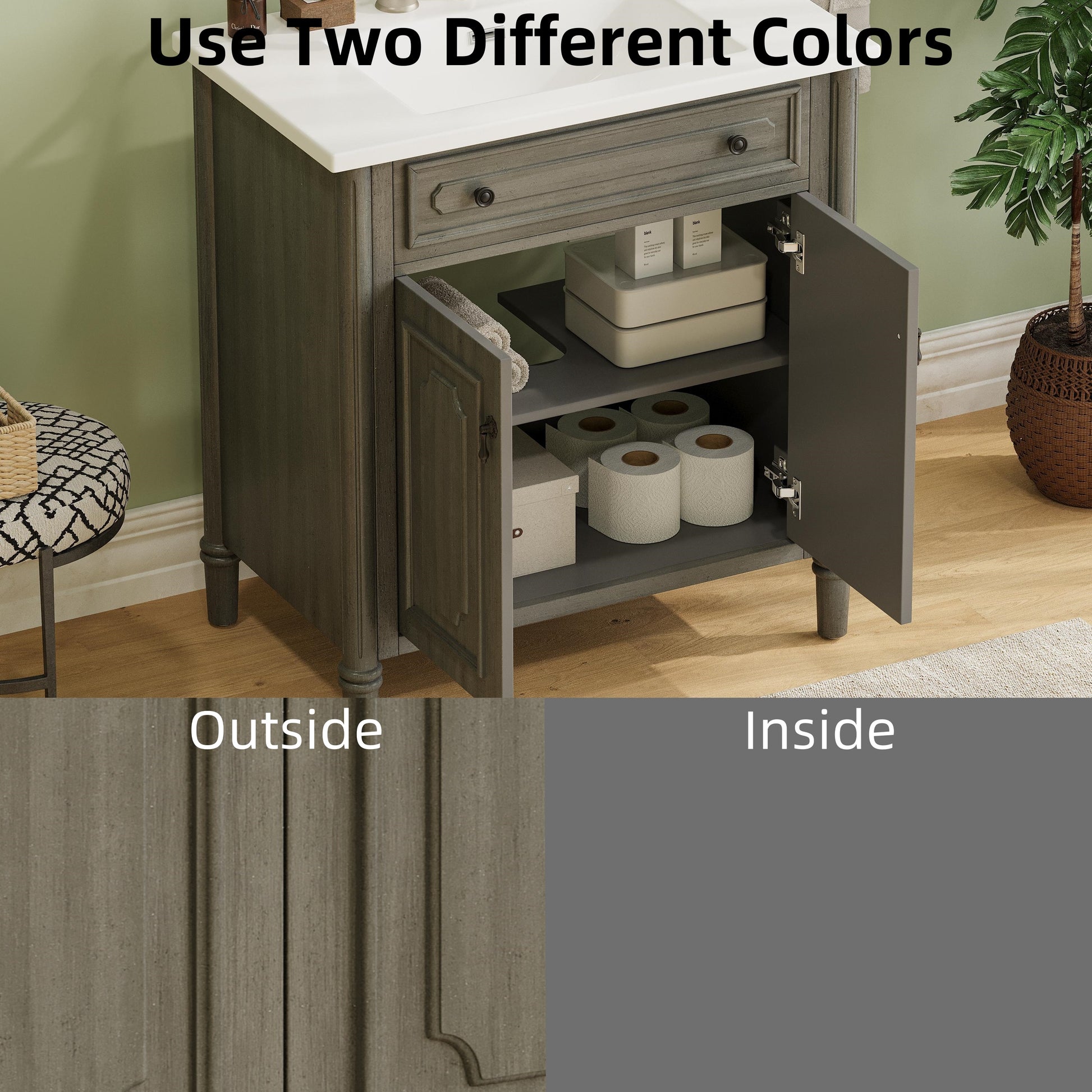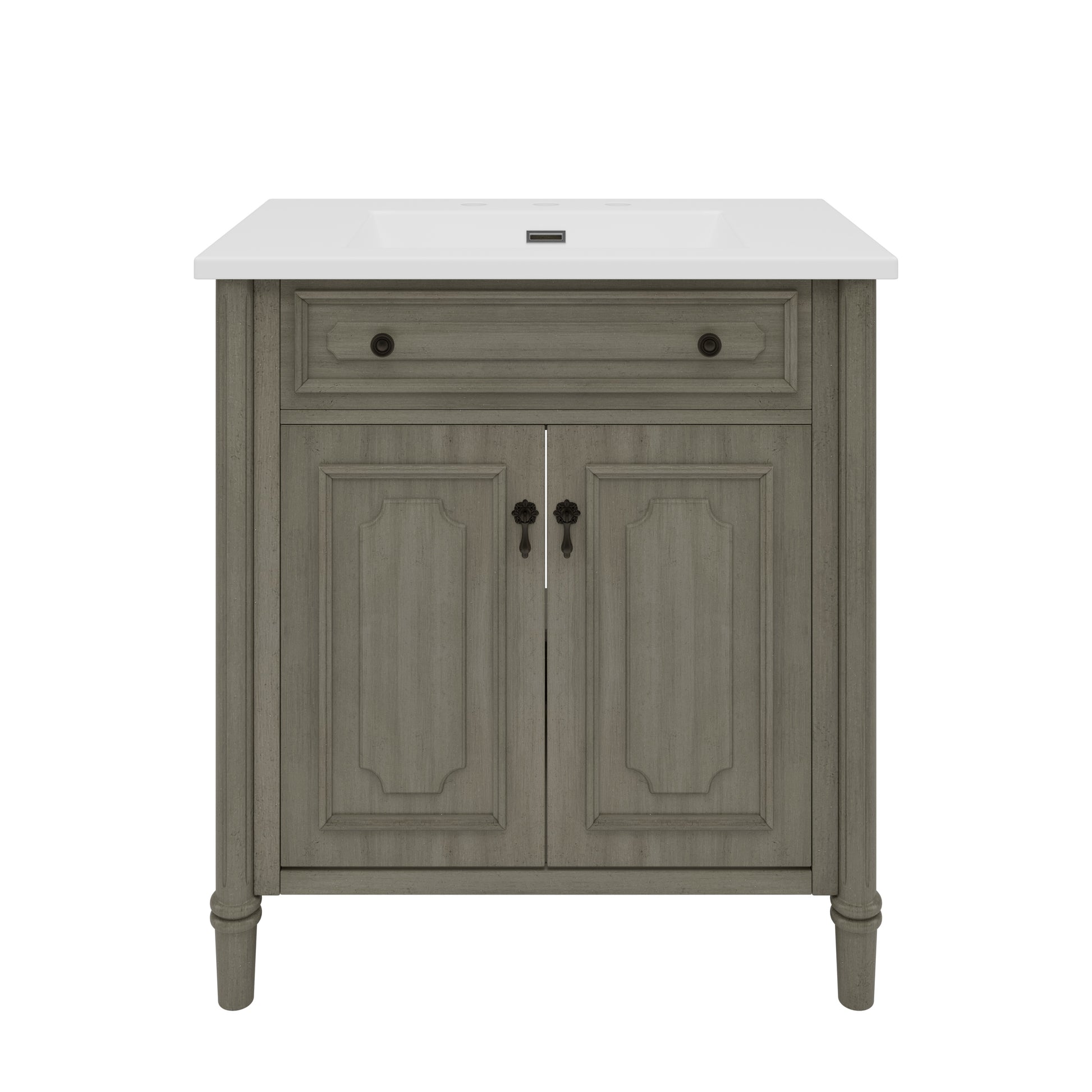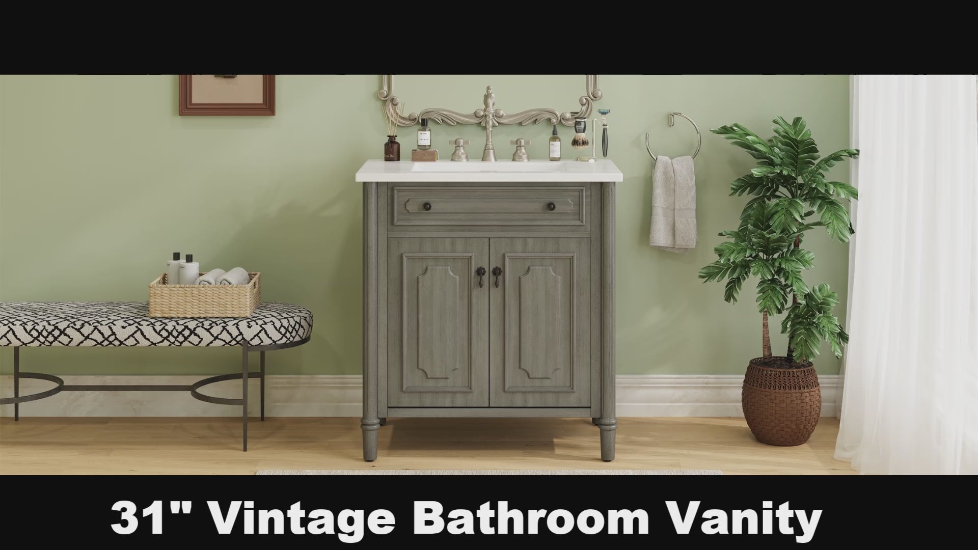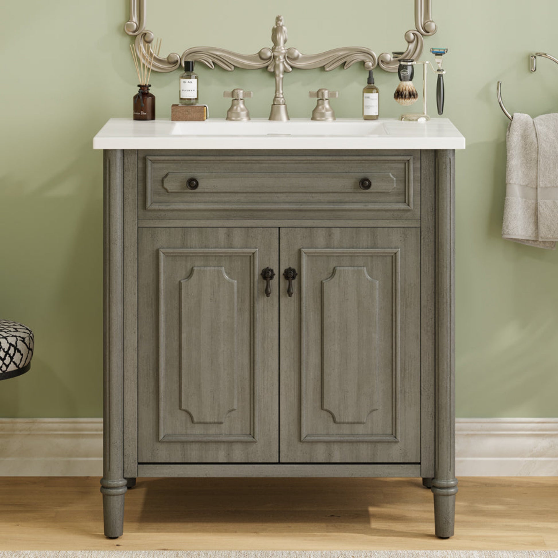 This 31-inch vintage bathroom vanity combines timeless elegance with practical functionality. Featuring an antique gray finish, panel-style doors, and antique pulls, it enhances traditional, farmhouse, or eclectic bathroom styles. The integrated rectangular ceramic sink offers durability, stain resistance, and easy cleaning, while the spacious cabinet with adjustable shelves provides customizable storage. Built with solid wood legs and a reinforced frame for stability, the vanity also includes a pre-cut back panel for hassle-free plumbing installation. With a raised-leg design for easy cleaning and a weight capacity of 120 lbs, it offers both style and long-lasting durability.