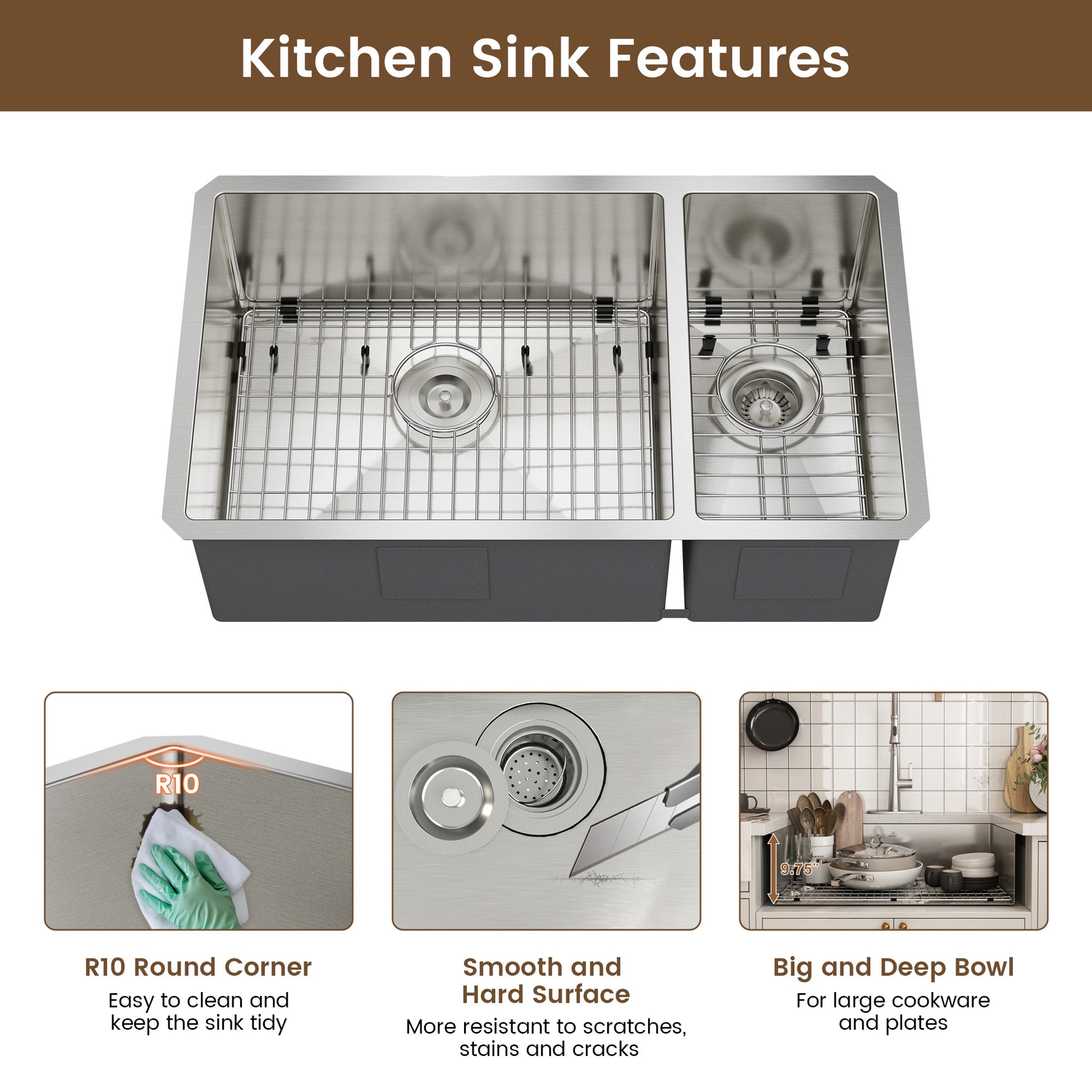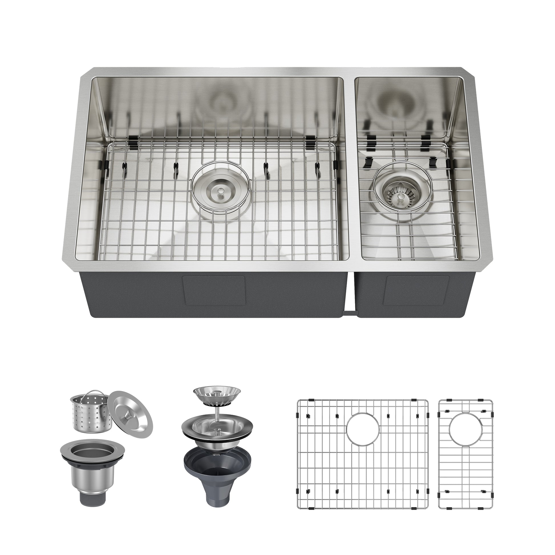 32 in. Undermount 60/40 Double Bowl 18-Gauge Stainless Steel Kitchen Sink with Bottom Grids and Strainer Basket