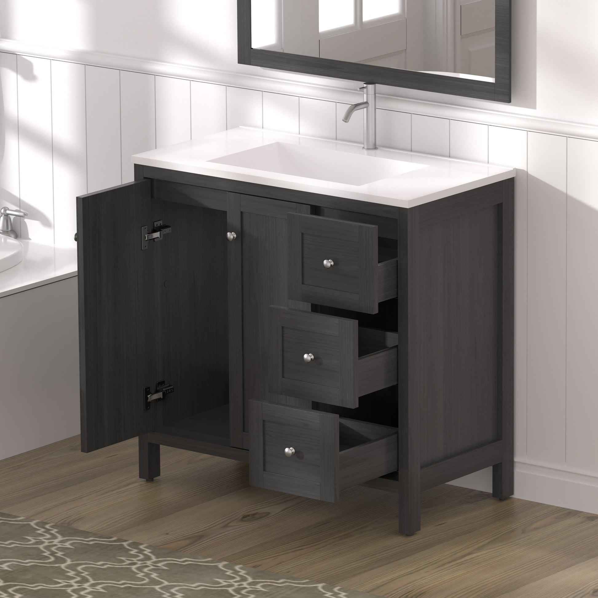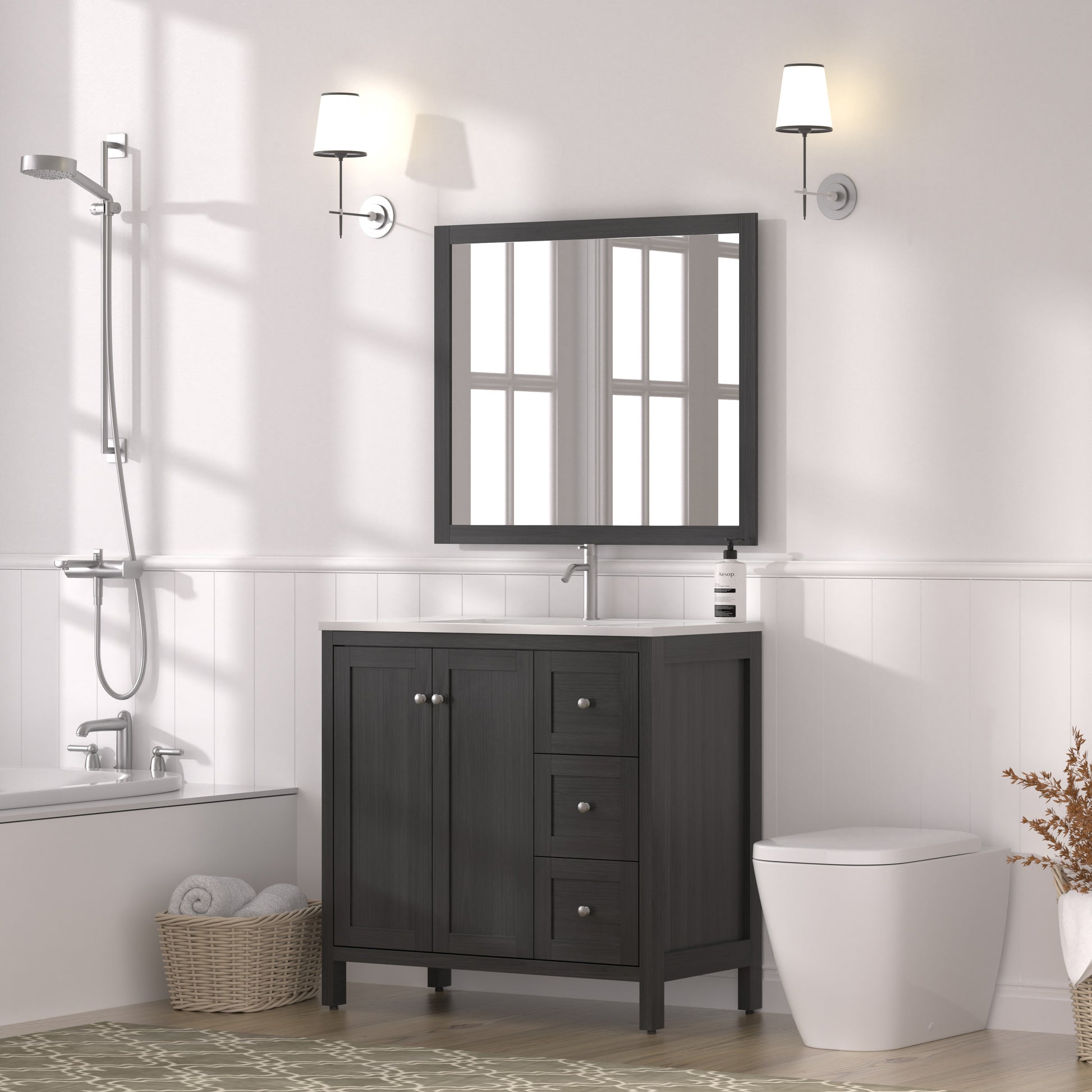 Upgrade your bathroom with this 35.5" modern vanity, designed to combine style, functionality, and durability in a compact footprint. Featuring a sophisticated Munich Black finish and a premium SMC resin basin, it offers a splash-proof, easy-to-clean surface. The solid plywood frame resists warping and cracking, ensuring lasting performance. Ample storage is provided by a spacious cabinet and three smooth-glide drawers, all equipped with soft-close hinges to eliminate noise and slamming. Easy to assemble in about one hour, this vanity arrives with a pre-installed basin for faster setup. Faucet and drain assembly are sold separately, allowing you to personalize your look.