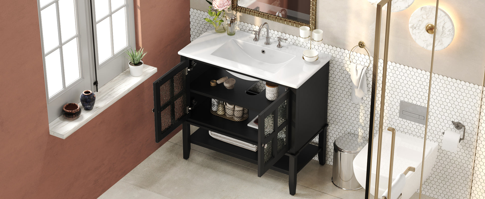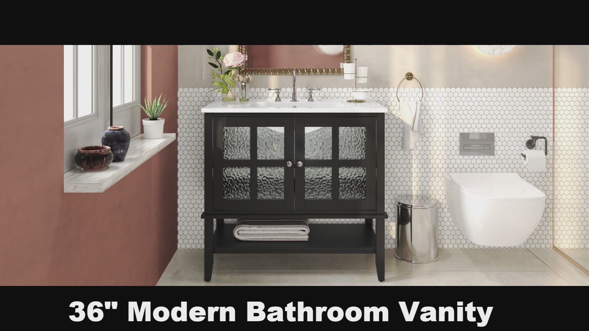 36 Inch Bathroom Vanity with Ceramic Sink Adjustable Shelf Solid Wood Legs Soft Close Hinges Black