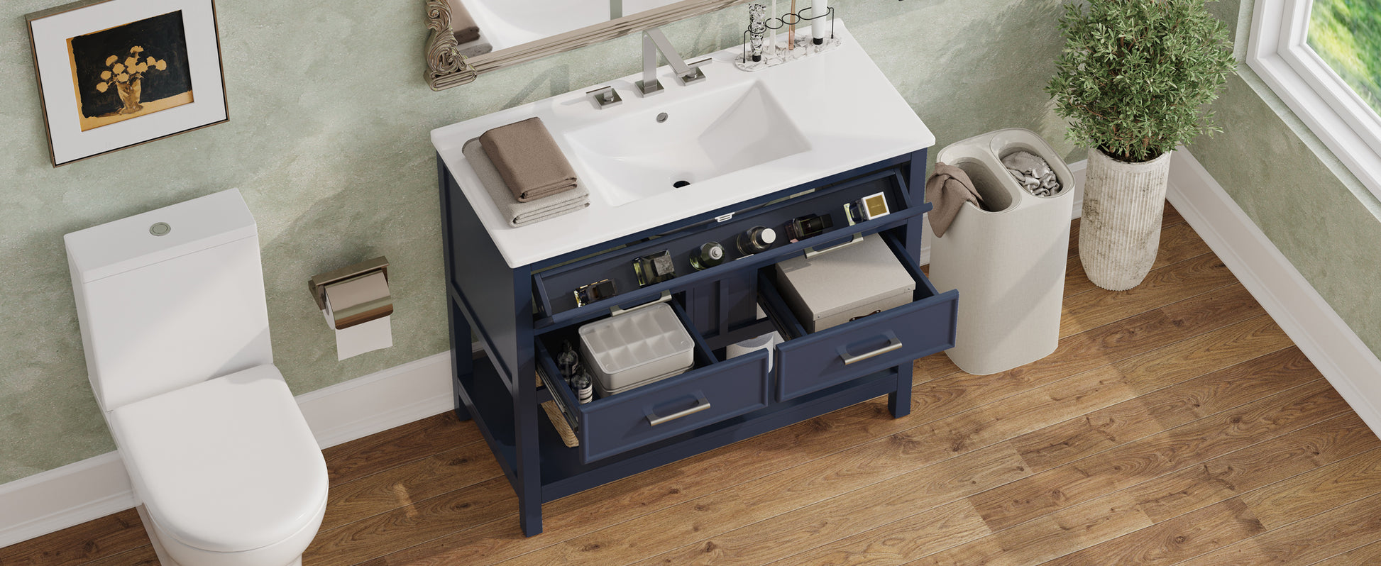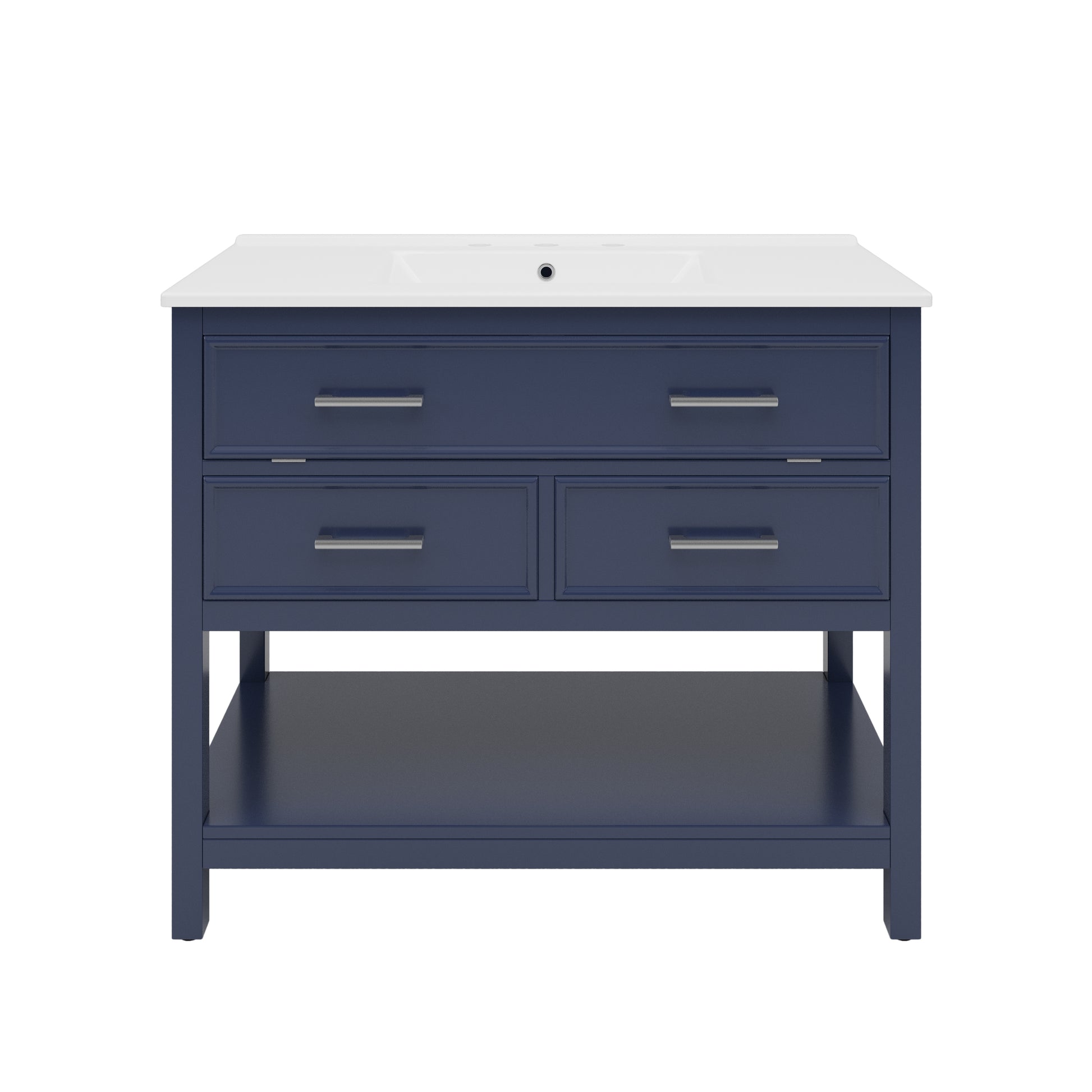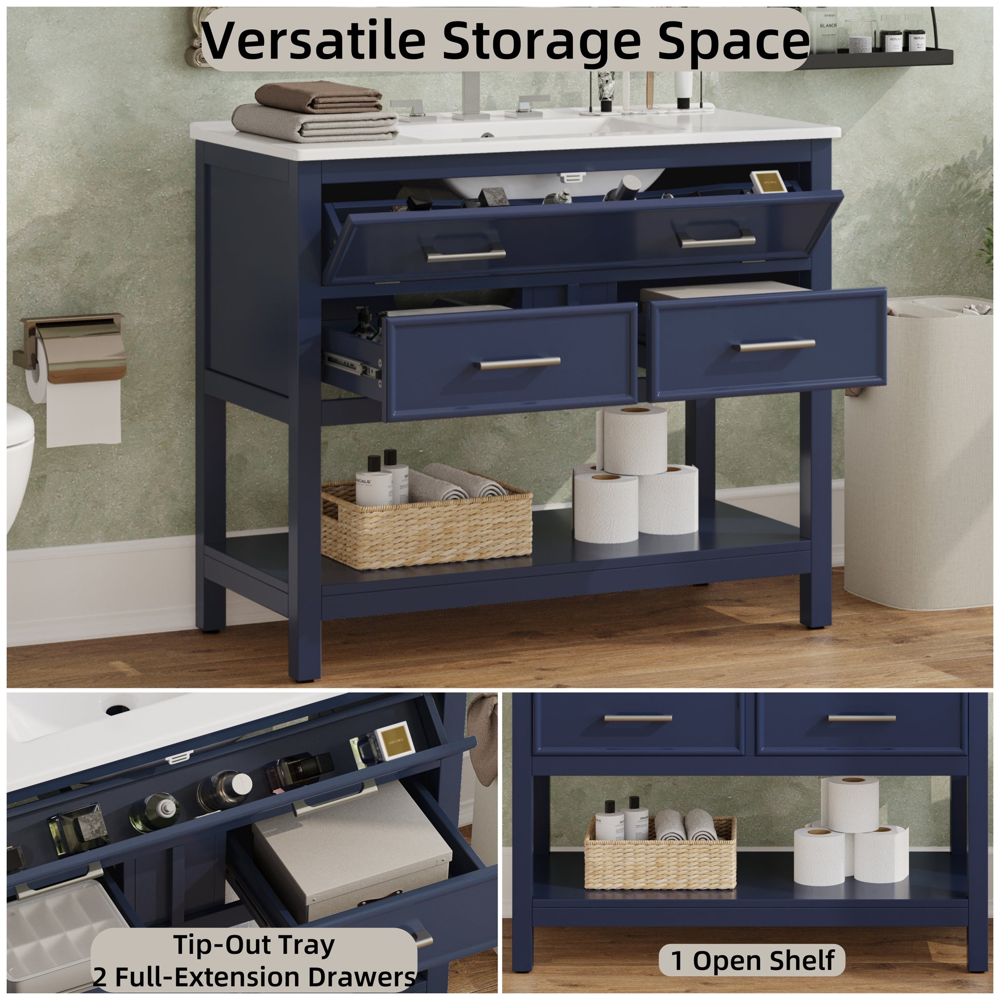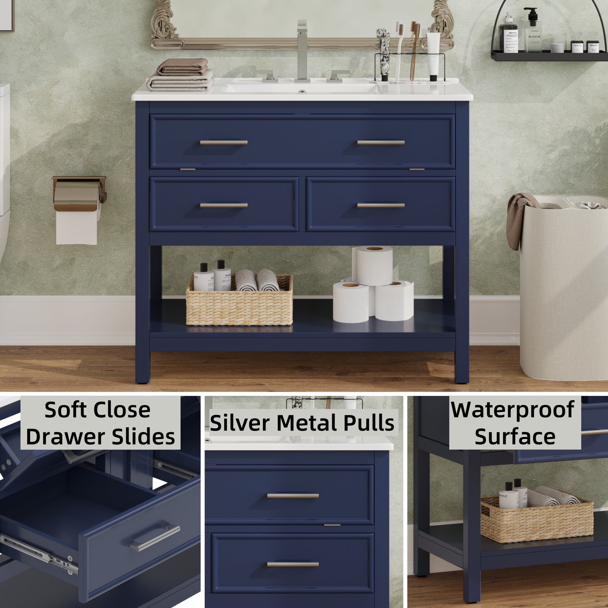36 Inch Bathroom Vanity with Ceramic Sink Tip Out Tray Full Extension Drawers Soft Close Blue