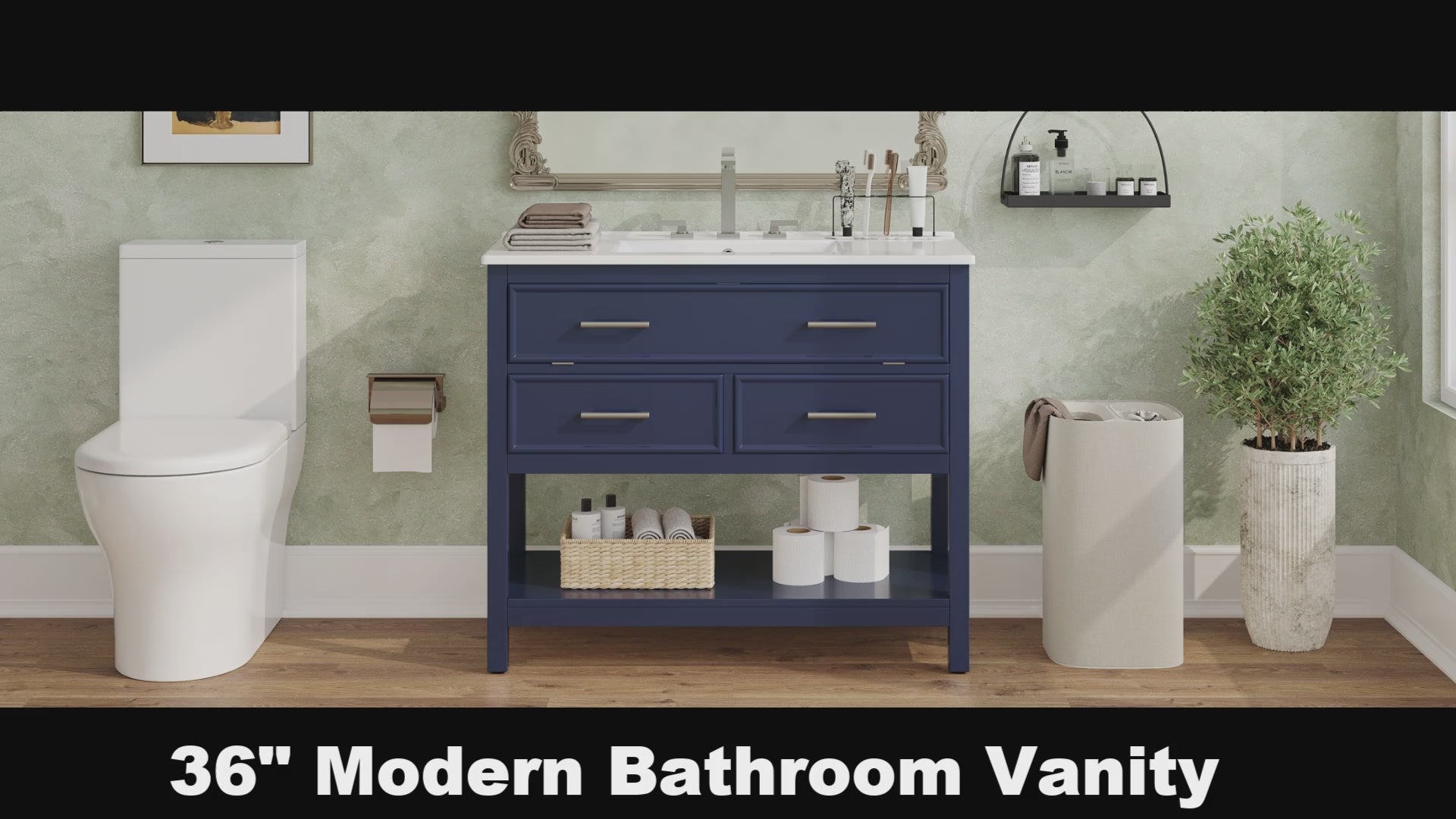 This 36" bathroom vanity is designed for both elegance and functionality, shipped in one box for easy self-assembly. It features a separate ceramic basin with 8" pre-drilled faucet holes, an anti-spill hole, a glossy easy-to-clean countertop, and a 4.25" depth basin for daily practicality. Storage is optimized with a 15° angled tip-out tray for quick-access items, two full-extension soft-close drawers, and an open bottom shelf for towels or décor. Silver metal pulls add a refined touch, while the waterproof surface ensures durability against stains. With a sturdy structure supporting up to 150 lbs, this vanity blends modern sophistication, efficient organization, and long-lasting performance—perfect for both contemporary and classic bathrooms.