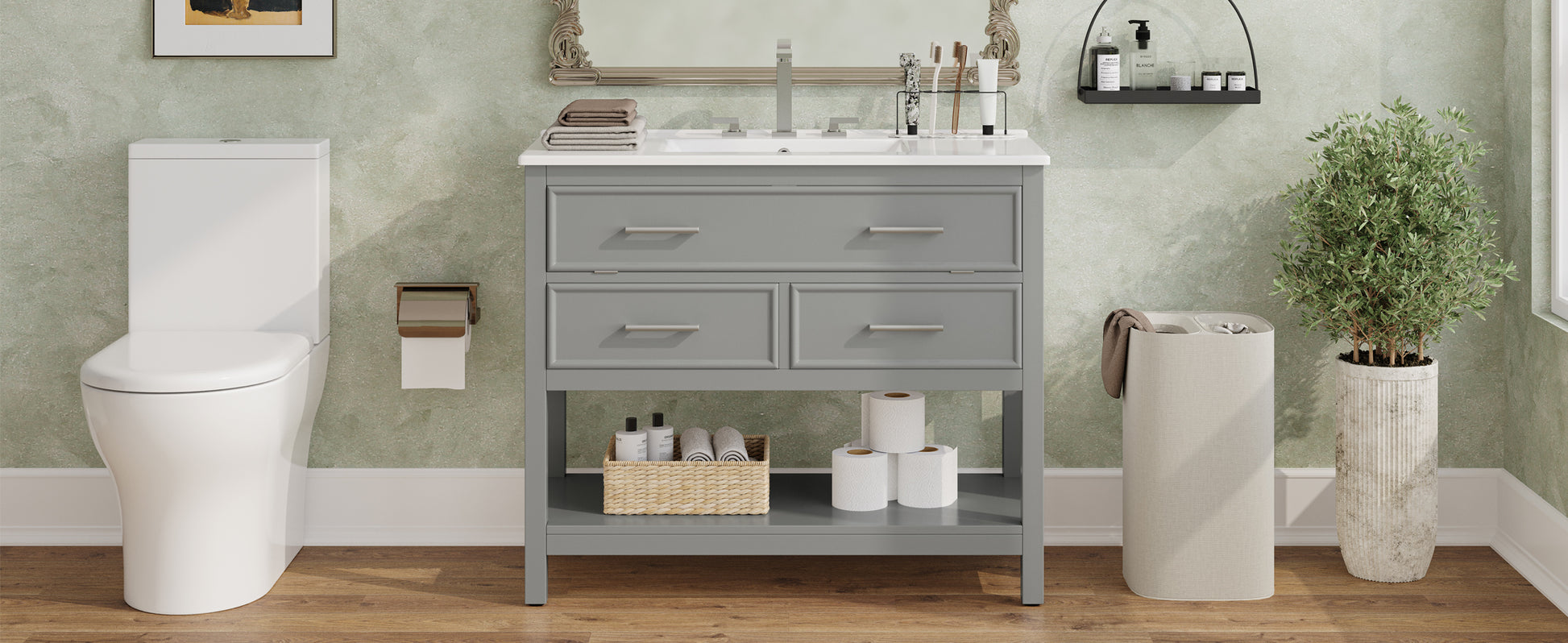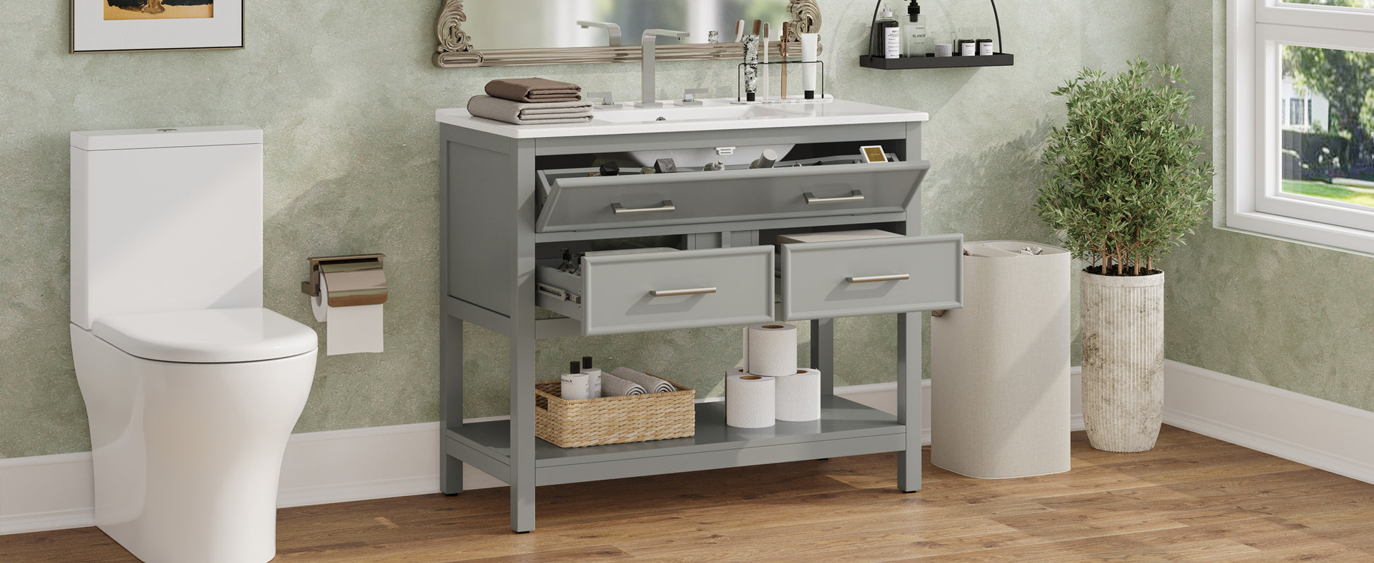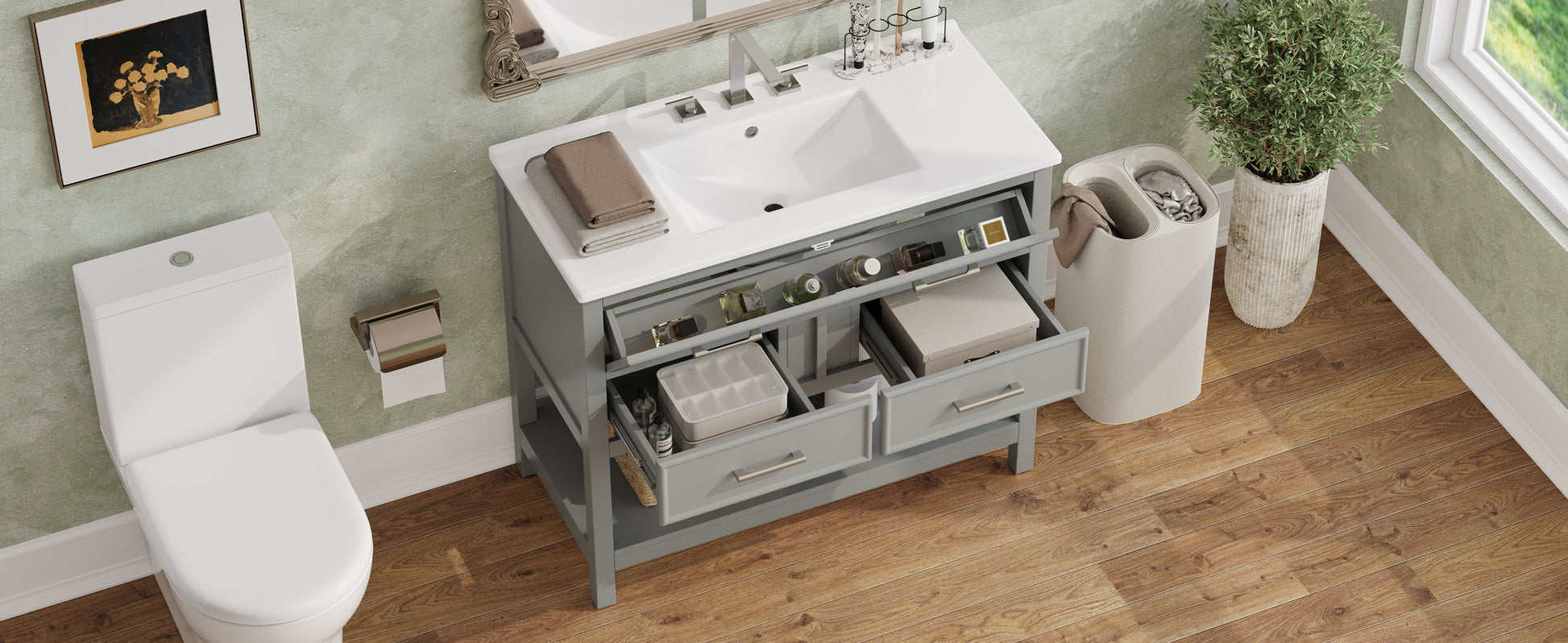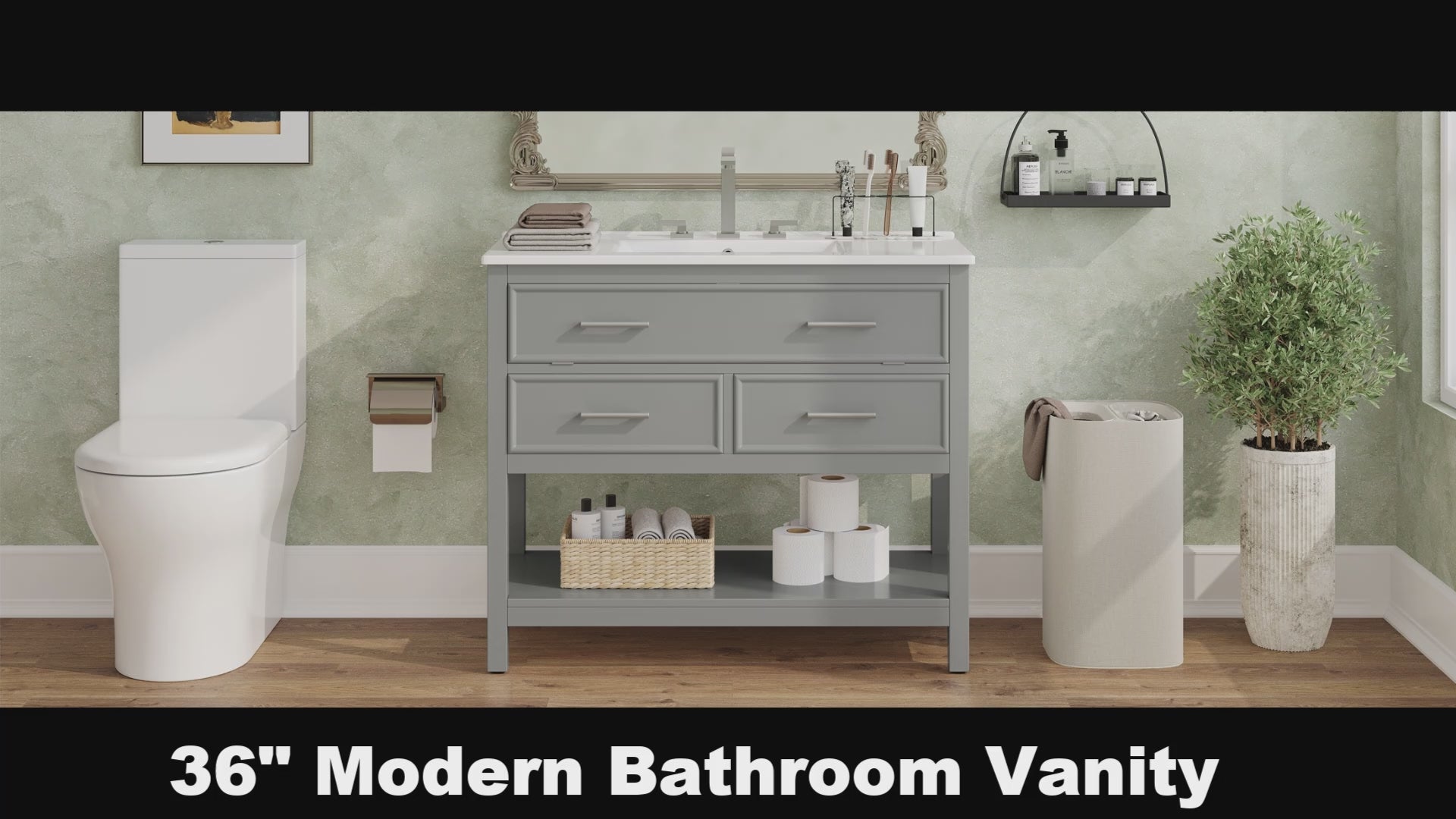 36 Inch Bathroom Vanity with Ceramic Sink Tip Out Tray Full Extension Drawers Soft Close Gray