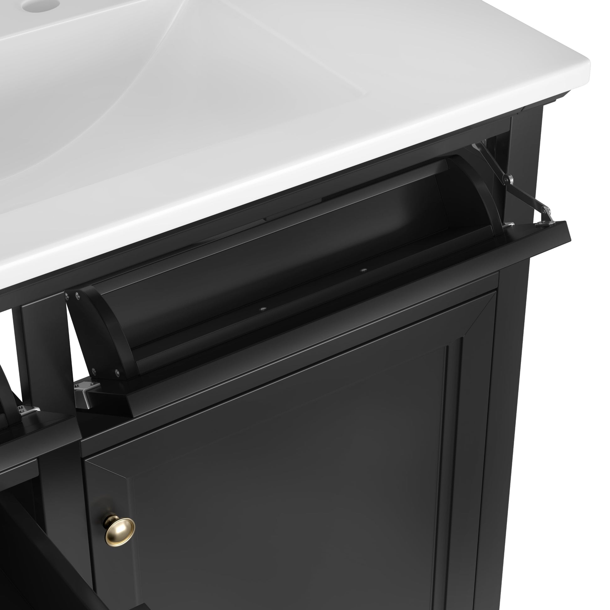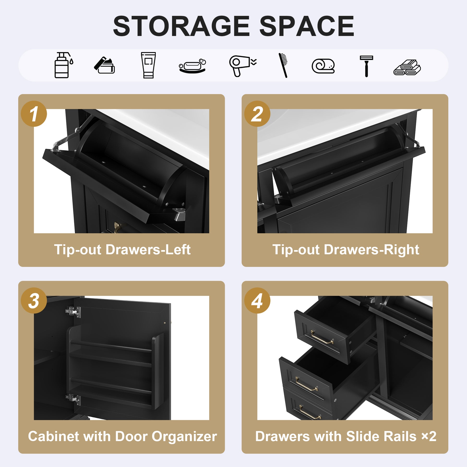 This 36-inch freestanding bathroom vanity brings timeless elegance and practical functionality to any bathroom. Featuring a classic black cabinet paired with a crisp white ceramic sink, it creates a modern contrast that suits both contemporary and traditional interiors. Built with MDF, solid rubber wood, and a smooth ceramic basin, the vanity ensures durability and long-lasting performance with a weight capacity of up to 200 lbs.The smart storage layout includes four smooth-gliding drawers and a soft-close cabinet door with adjustable interior shelves, offering versatile organization for toiletries and daily essentials. The integrated ceramic sink is seamless, easy to clean, and pre-drilled for an 8-inch widespread faucet (faucet not included), making installation simple and convenient.Additional thoughtful details include soft-close metal hinges, integrated drawer handles, and a leg-leveling base for stability on uneven floors. With its premium painted finish, heavy-duty construction, and easy rear plumbing access, this vanity is ideal for bathrooms, powder rooms, or guest baths, offering both refined style and reliable function in one complete package.
