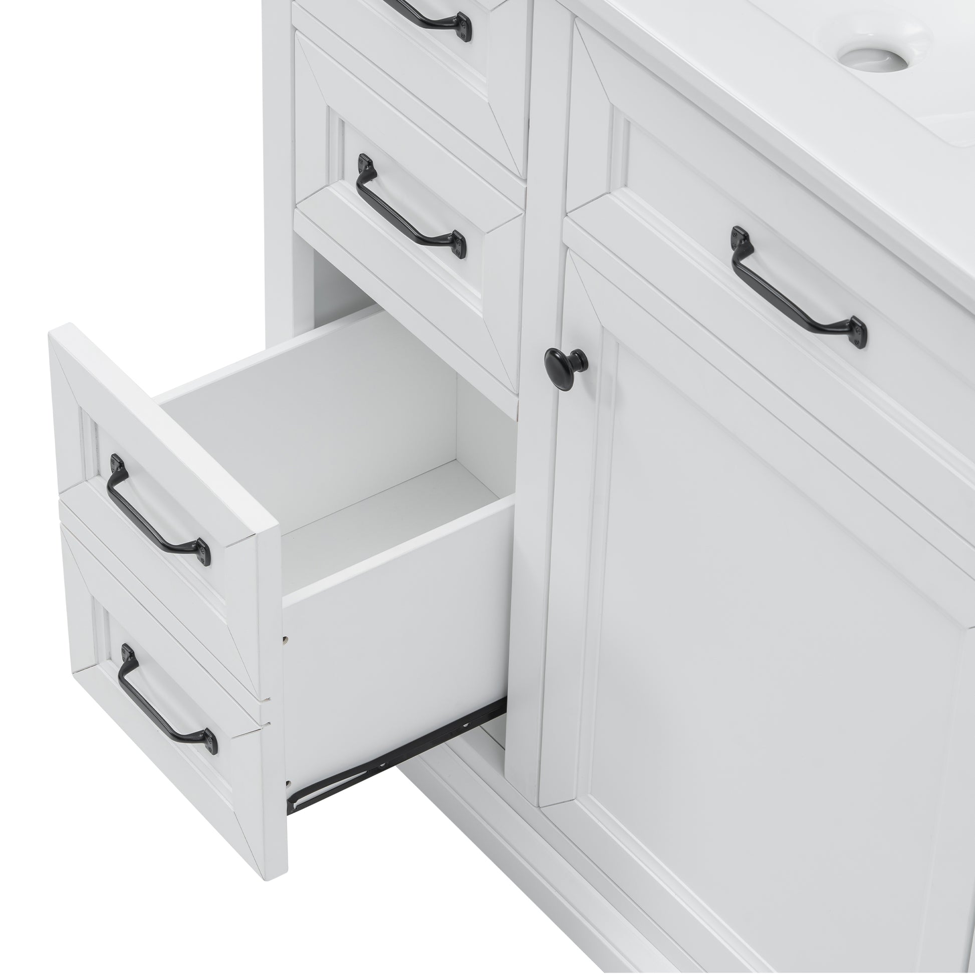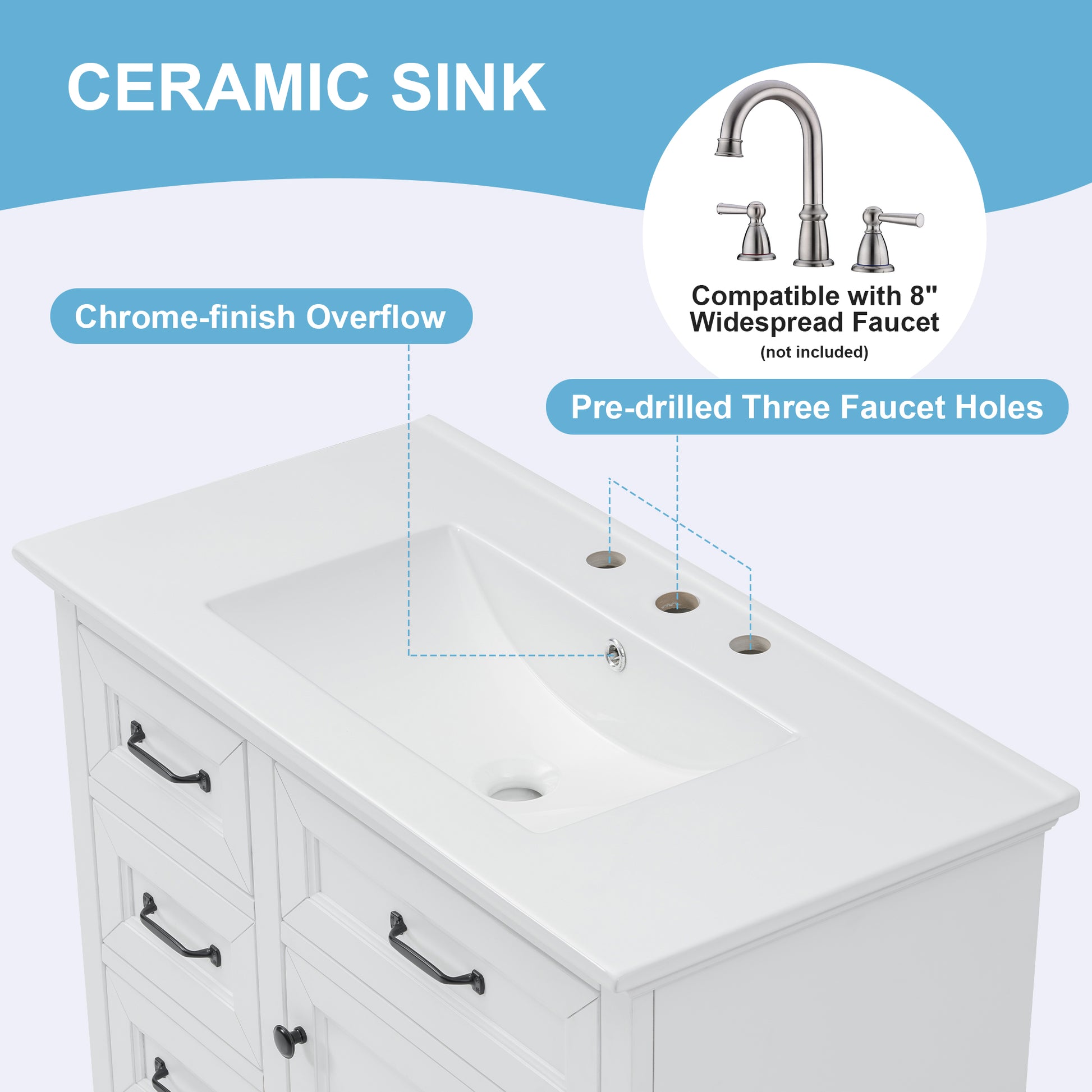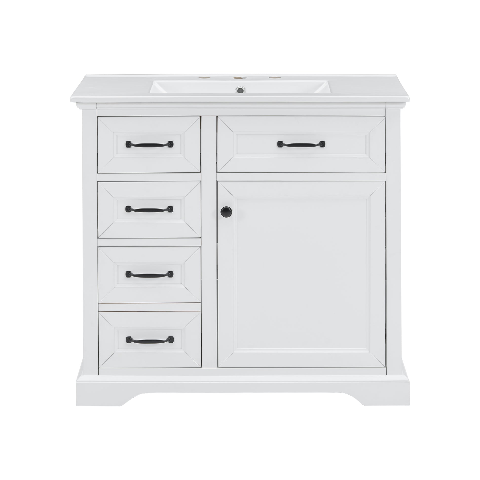 This 36-inch freestanding bathroom vanity combines modern elegance with functional design, making it a stylish centerpiece for any bathroom. Crafted from MDF, solid rubber wood, and topped with a smooth ceramic sink, it offers durability, a sleek painted finish, and a 200 lbs weight capacity. The smart storage layout includes four smooth-gliding drawers and a soft-close cabinet door with interior shelves, ensuring efficient organization for toiletries and daily essentials. The integrated ceramic basin features a seamless surface that is easy to clean and comes pre-drilled with 8-inch widespread faucet holes for quick installation (faucet not included). With thoughtful details like integrated handles, metal glides, leg-leveling design, and soft-close hinges, this vanity blends practicality with refined style. Ideal for master bathrooms, guest baths, or powder rooms, it delivers long-lasting value and convenience in one complete package.