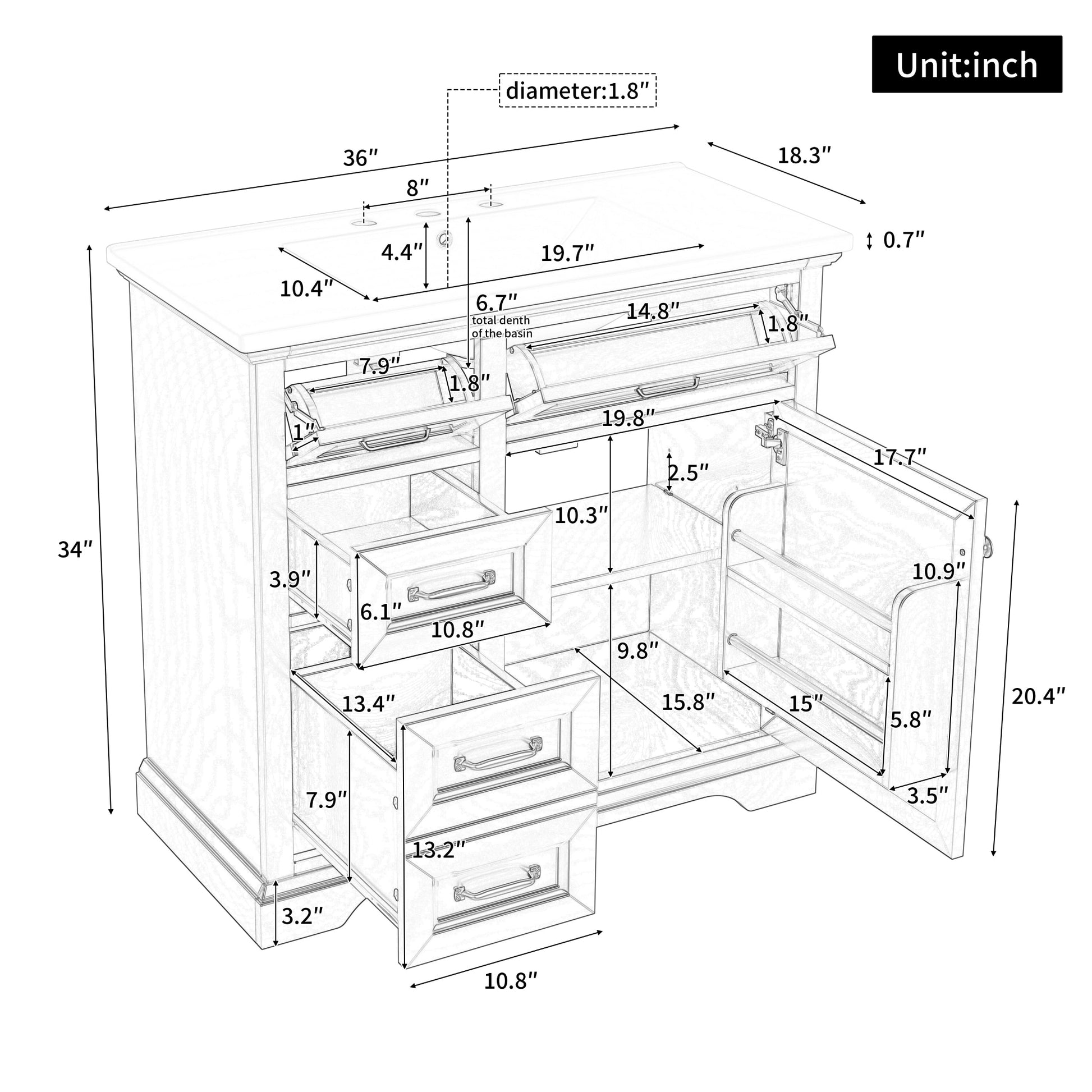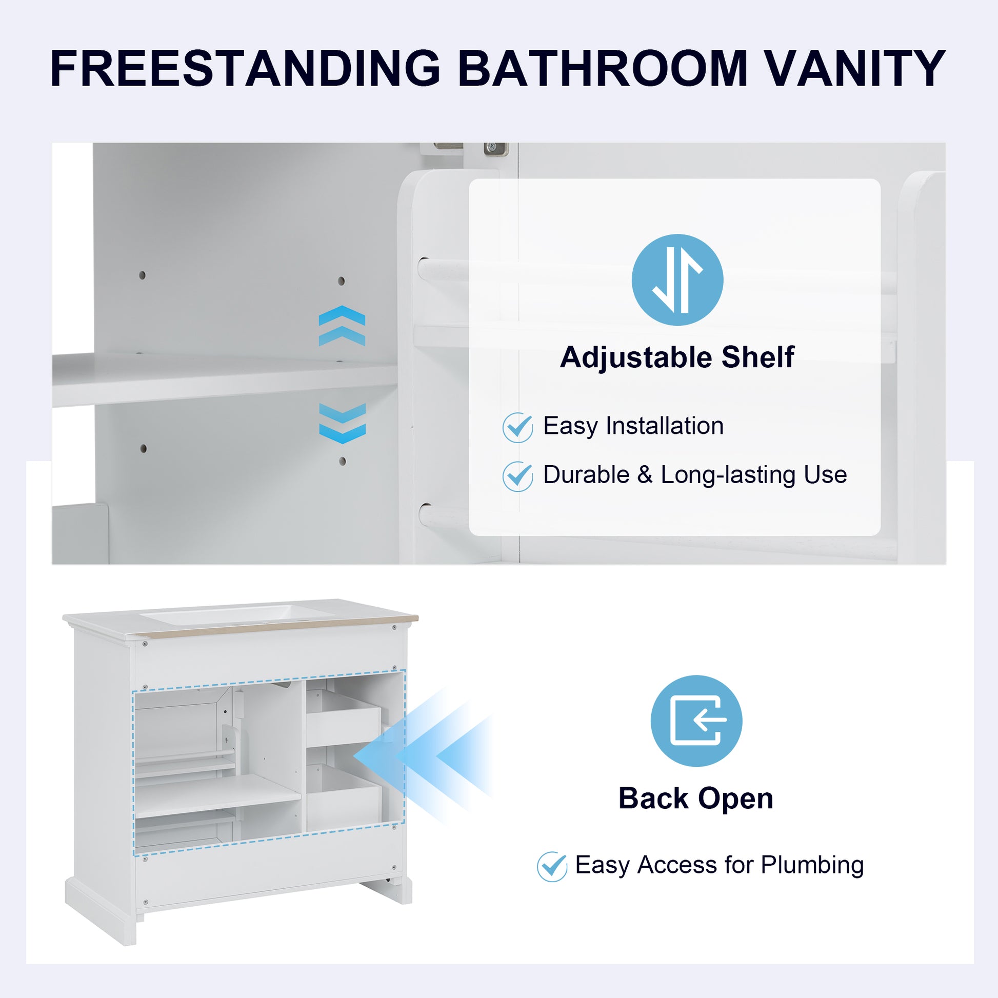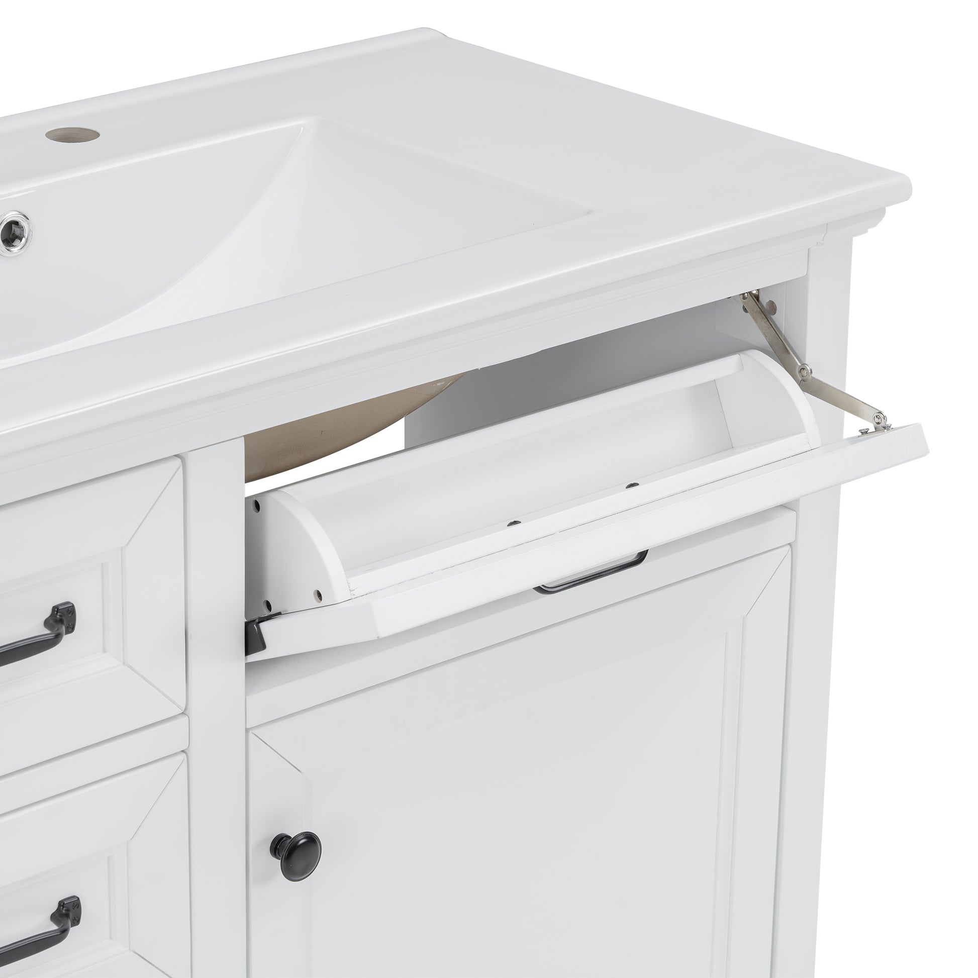 This 36-inch freestanding bathroom vanity combines modern elegance with functional design, making it a stylish centerpiece for any bathroom. Crafted from MDF, solid rubber wood, and topped with a smooth ceramic sink, it offers durability, a sleek painted finish, and a 200 lbs weight capacity. The smart storage layout includes four smooth-gliding drawers and a soft-close cabinet door with interior shelves, ensuring efficient organization for toiletries and daily essentials. The integrated ceramic basin features a seamless surface that is easy to clean and comes pre-drilled with 8-inch widespread faucet holes for quick installation (faucet not included). With thoughtful details like integrated handles, metal glides, leg-leveling design, and soft-close hinges, this vanity blends practicality with refined style. Ideal for master bathrooms, guest baths, or powder rooms, it delivers long-lasting value and convenience in one complete package.