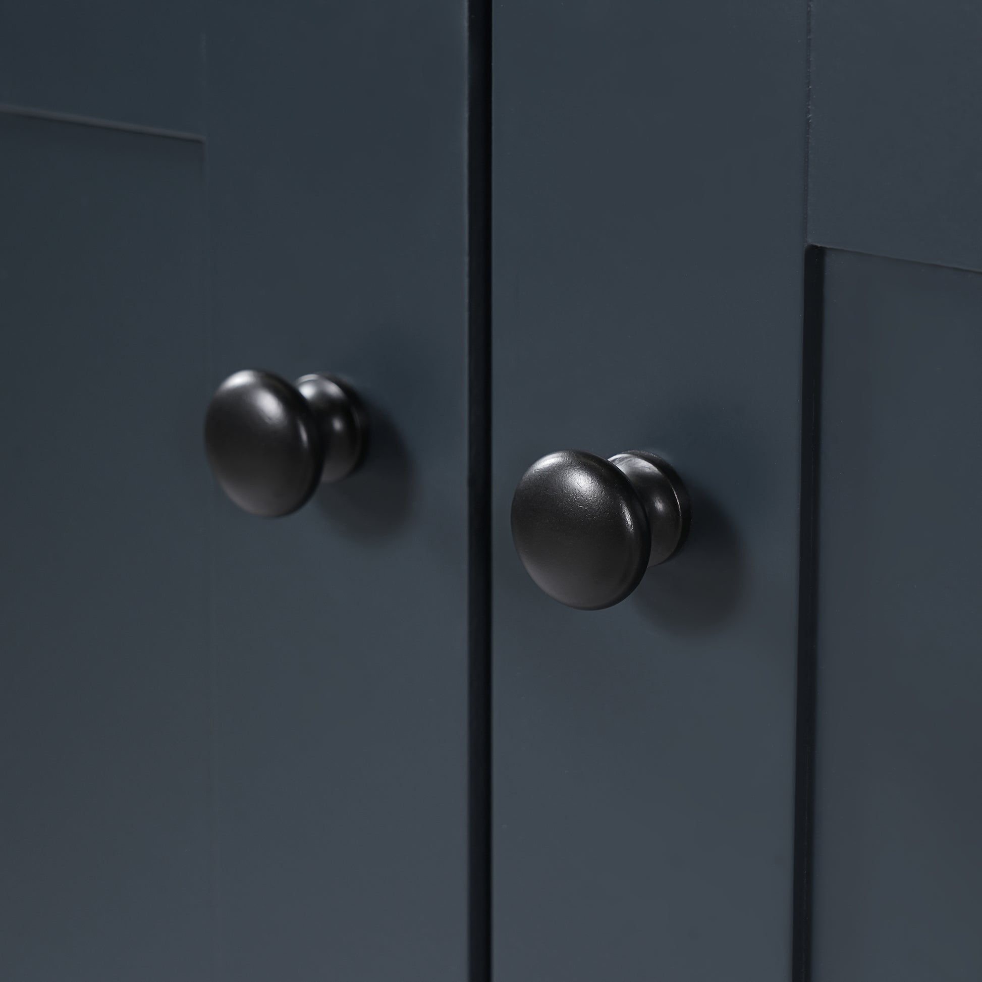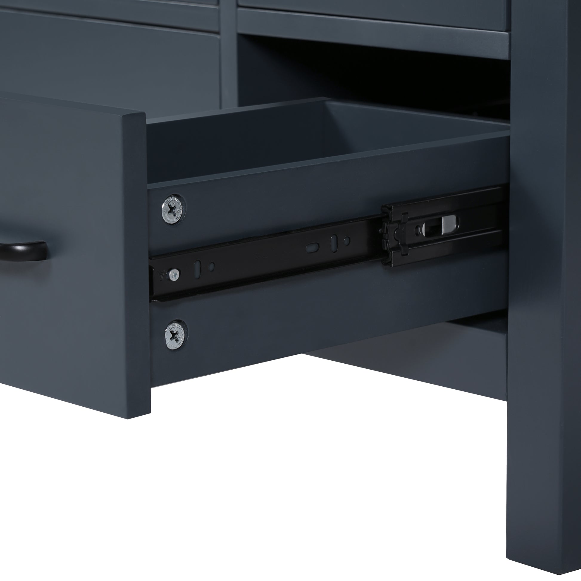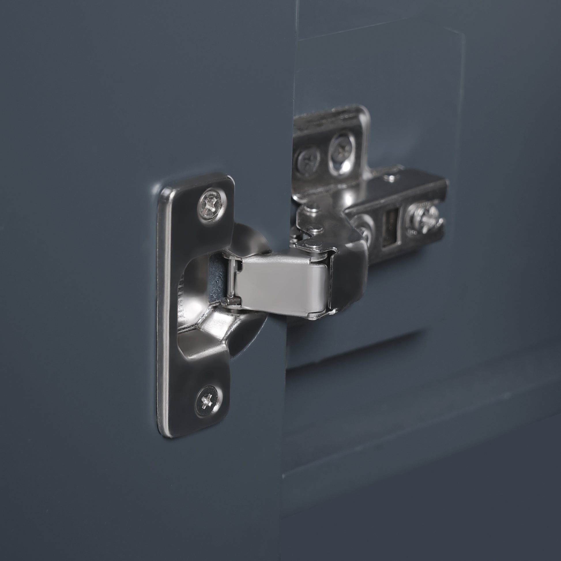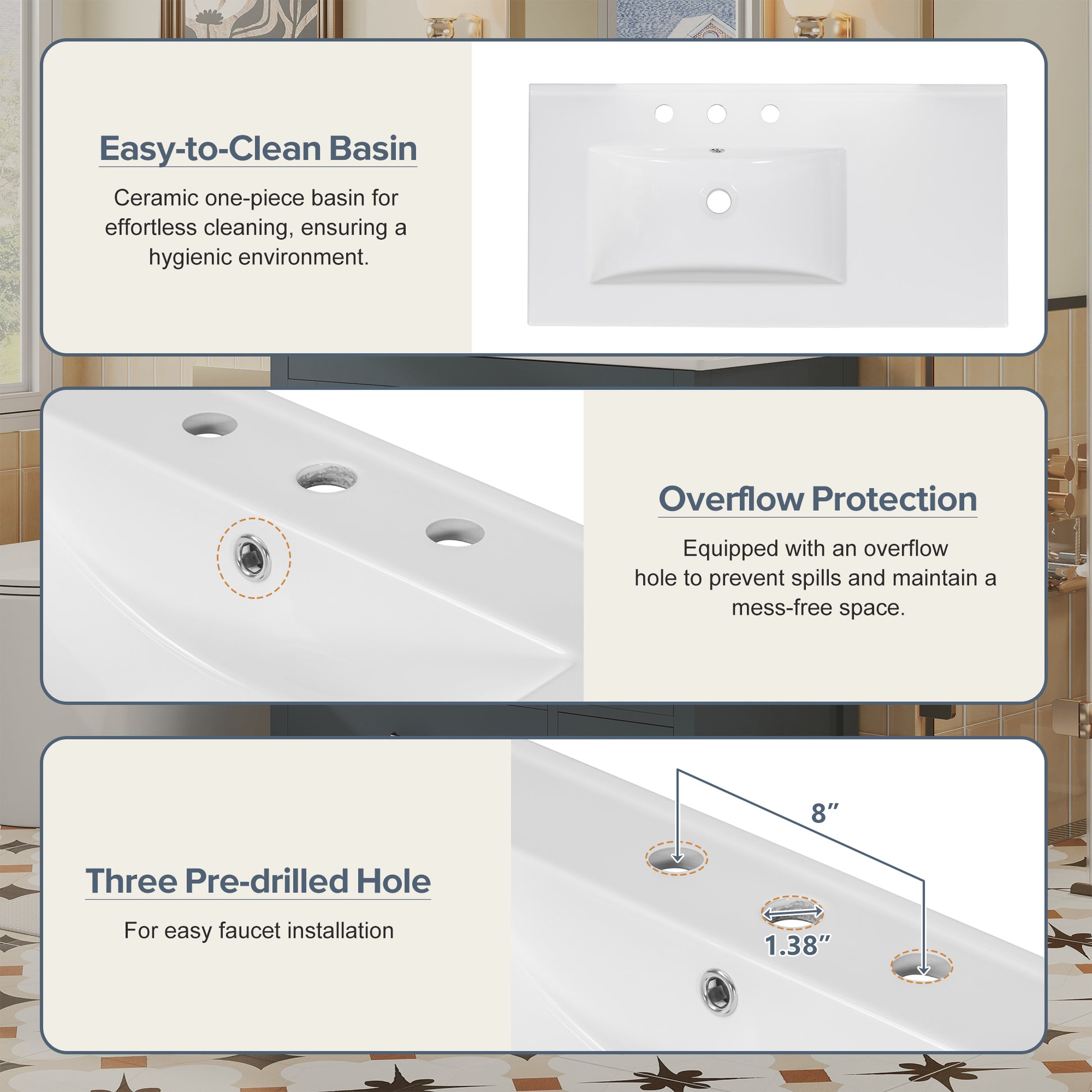 This 36-inch blue bathroom vanity combines modern elegance with practical storage, making it a stylish and functional centerpiece for your bathroom. Featuring a smooth ceramic sink with overflow protection and three pre-drilled faucet holes, it is durable, easy to clean, and convenient to install. The vanity includes two soft-close doors, five drawers, and chic black handles, offering abundant space to keep toiletries, towels, and essentials neatly organized while adding a refined touch to your space.