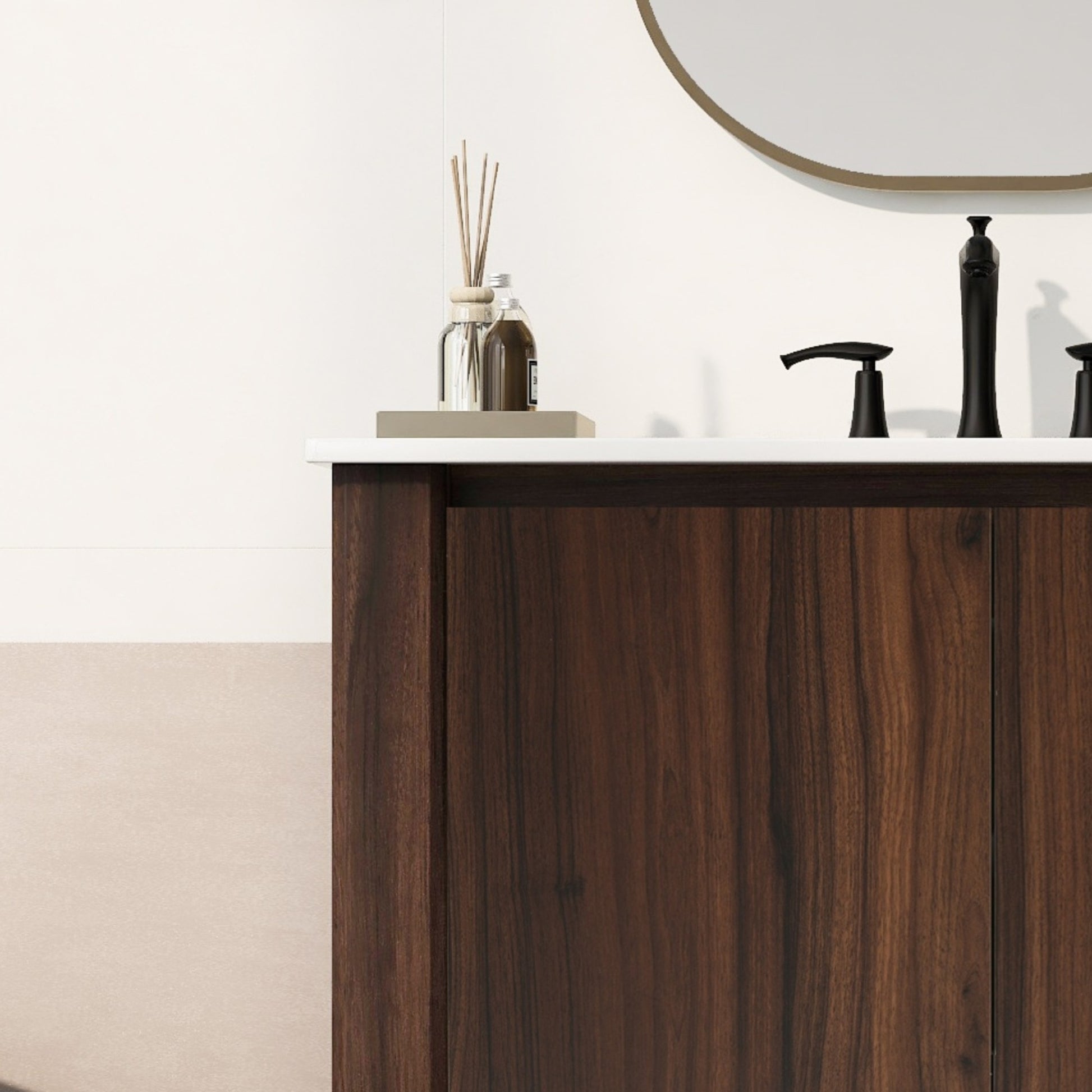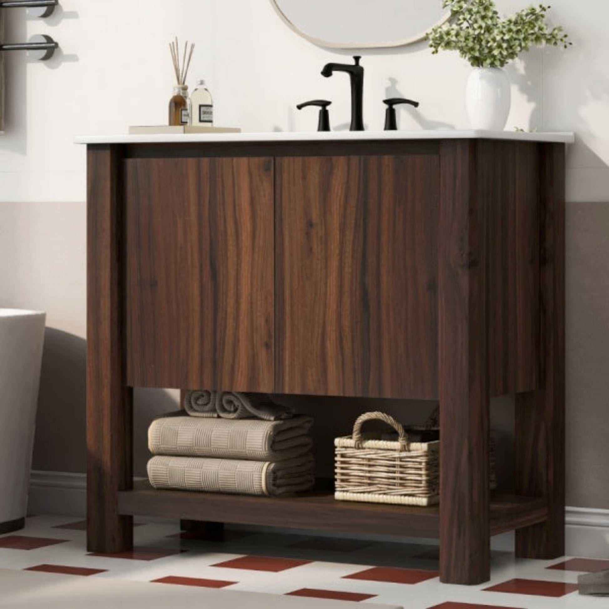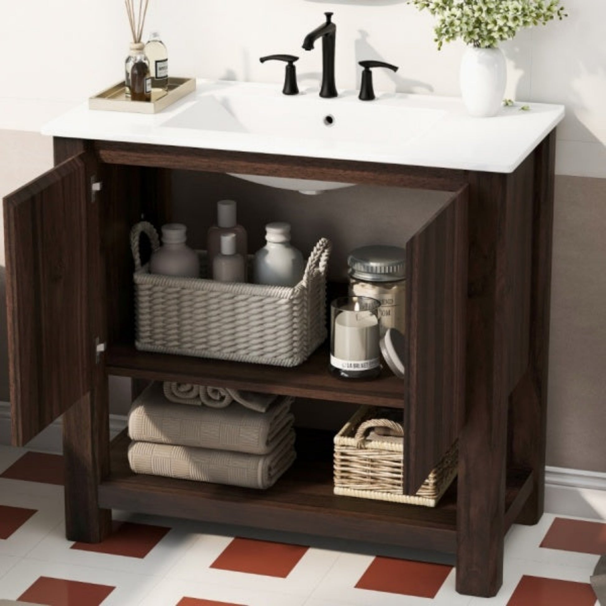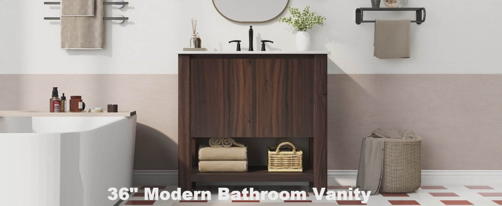 This 36-inch bathroom vanity combines modern style with practical functionality. It features a durable ceramic sink with a glossy, scratch-resistant surface, anti-spill hole, and pre-drilled faucet holes for easy installation. The vanity offers ample storage with a spacious cabinet, adjustable soft-close doors, and an open bottom shelf for towels or décor. Its 45° free-handle design provides a sleek, safe, and minimalist look, while sturdy legs ensure stability and long-lasting use. Compact yet functional, this vanity is ideal for smaller bathrooms, offering both elegance and convenience with easy-to-clean surfaces and a stylish, versatile design.