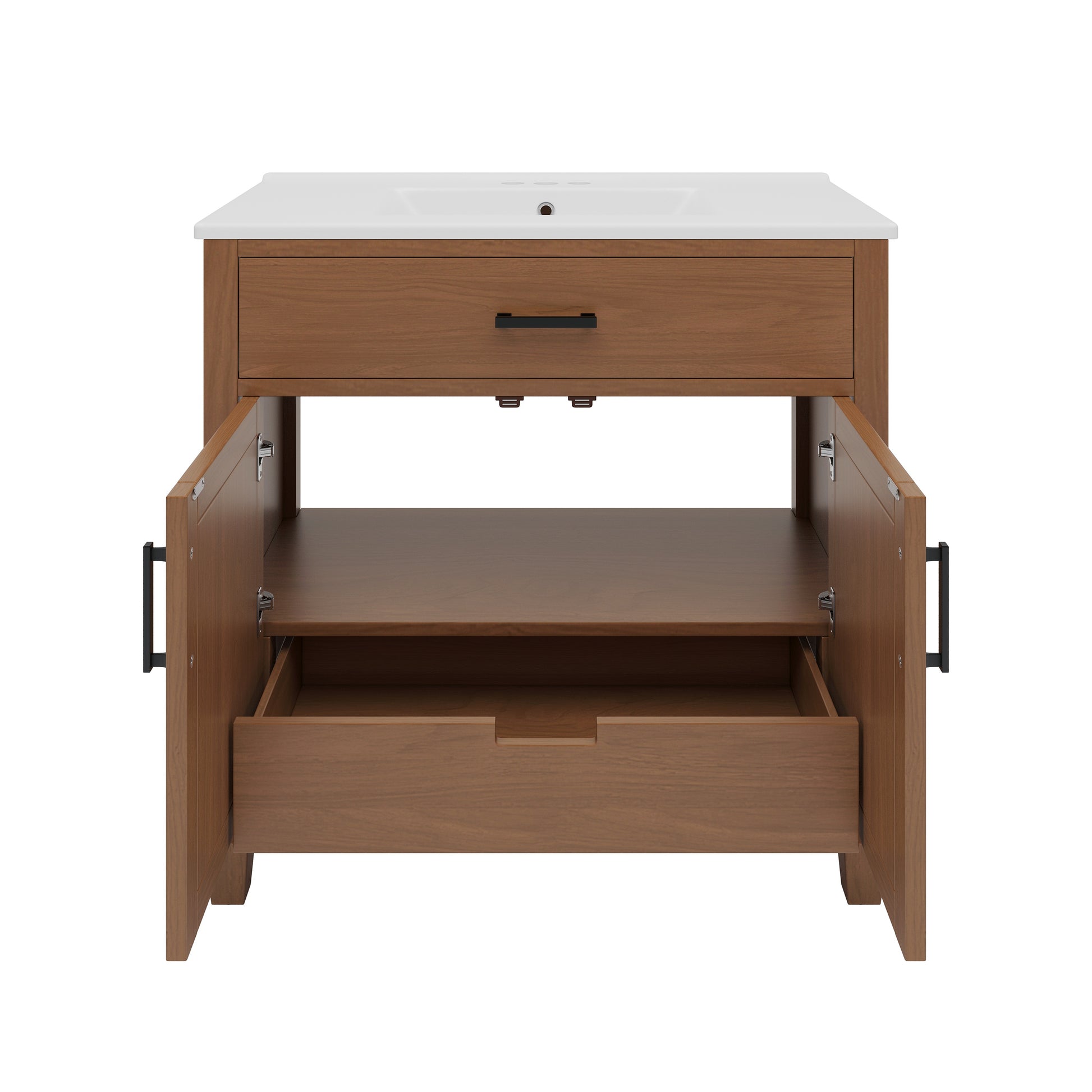 36 Inch Rattan Bathroom Vanity with Ceramic Sink Soft Close Doors and Drawers Solid Wood Legs Brown