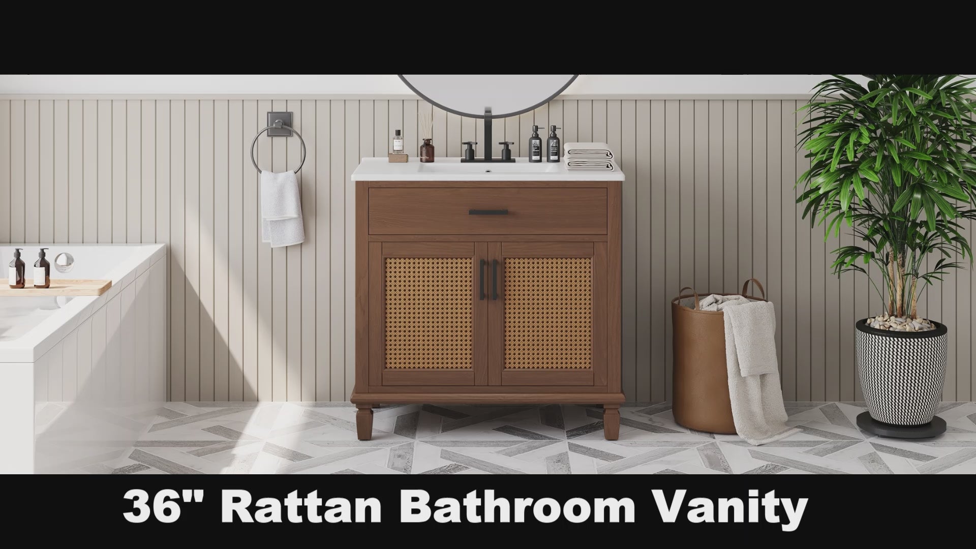 This 36" Rattan Bathroom Vanity blends timeless elegance with practicality, featuring handwoven rattan doors and a glossy ceramic sink for a perfect contrast of textures. It stands out with water-resistant solid wood legs, silent-close drawers, and ample storage space that keeps your essentials organized. Combining artisan craftsmanship with functionality, this vanity transforms your bathroom into a relaxing retreat.