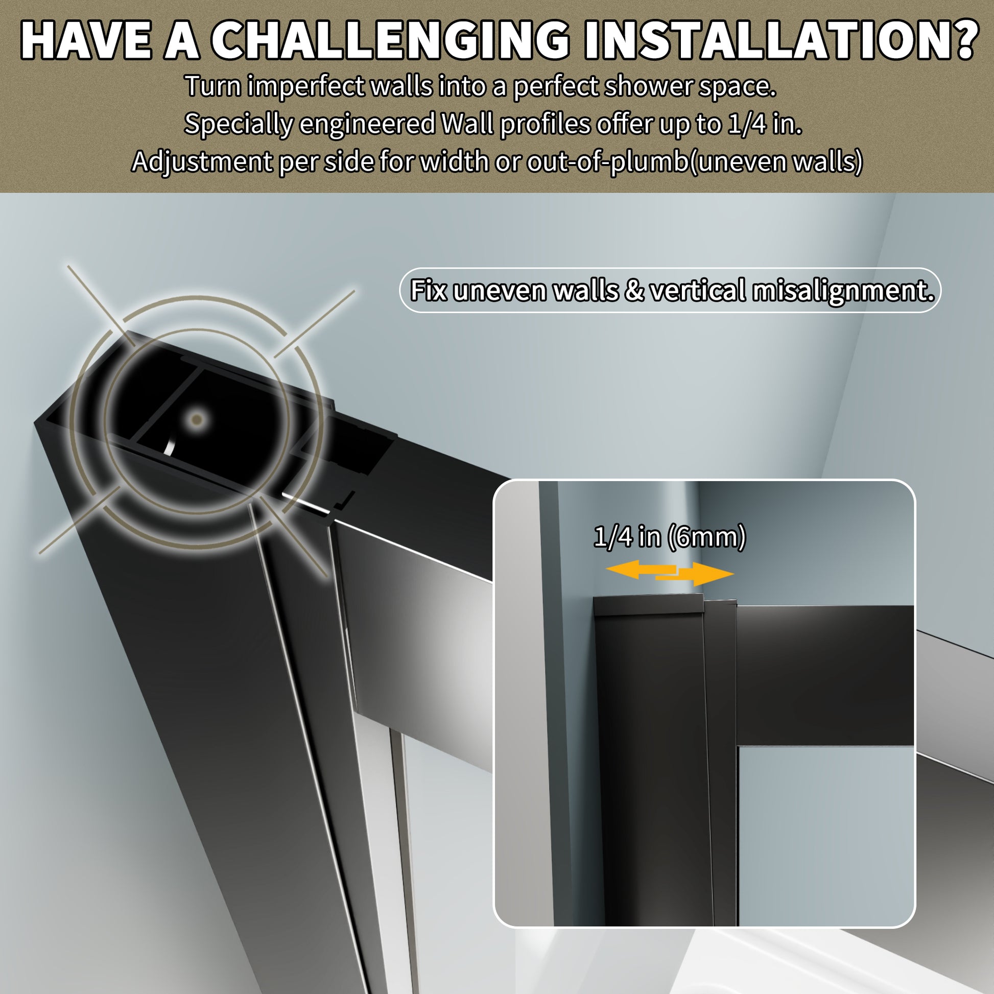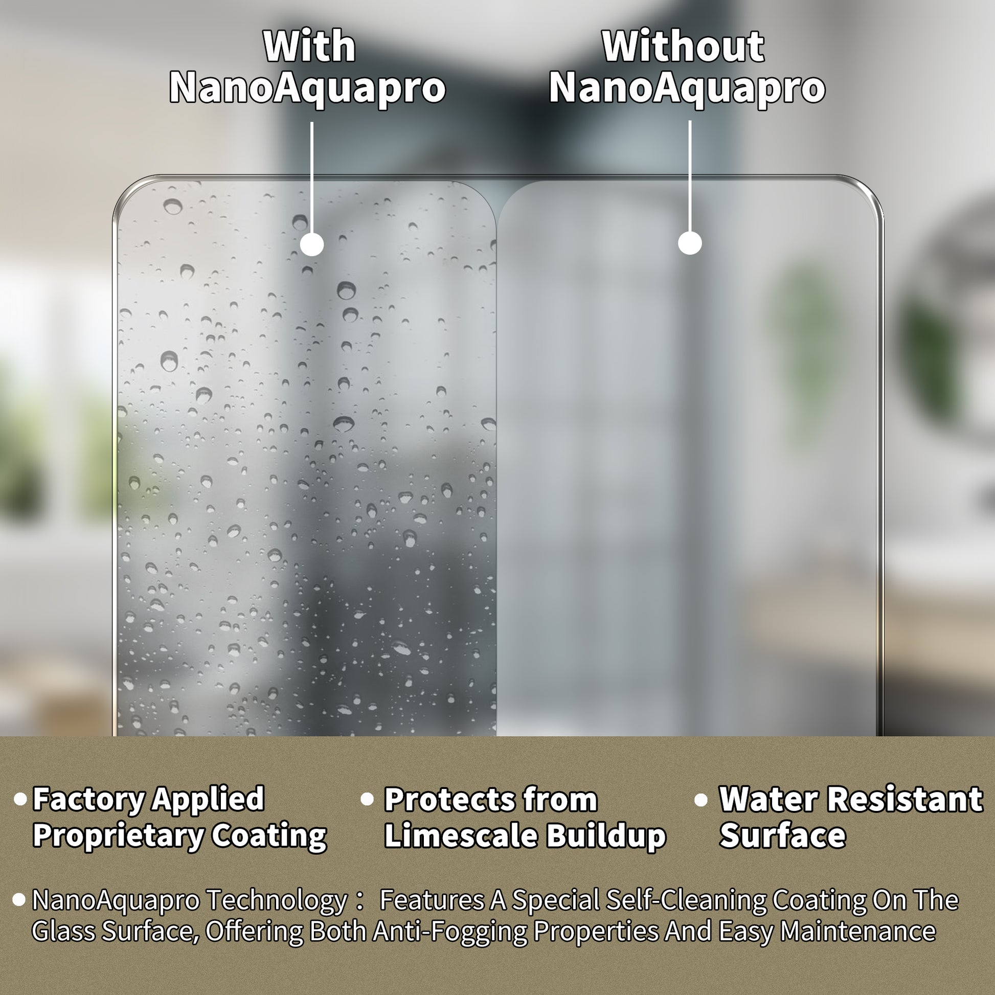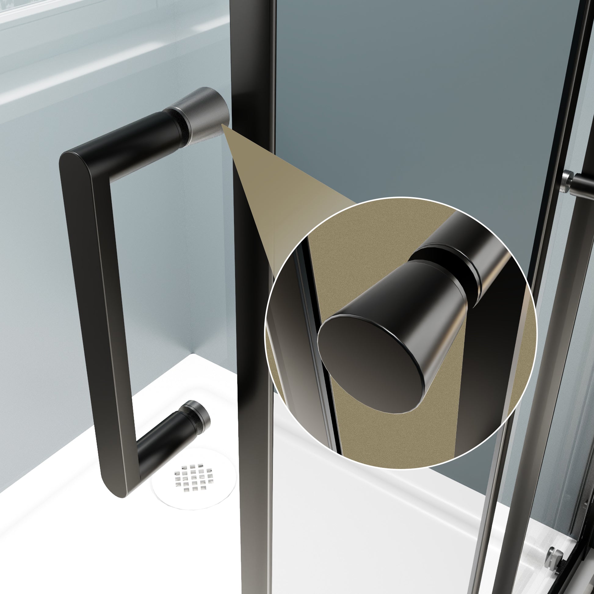 This shower door features 6mm clear tempered glass with a full-frame design, equipped with a 304 stainless steel handle. It supports left or right installation and comes with double-sided easy-clean glass for convenience and durability.