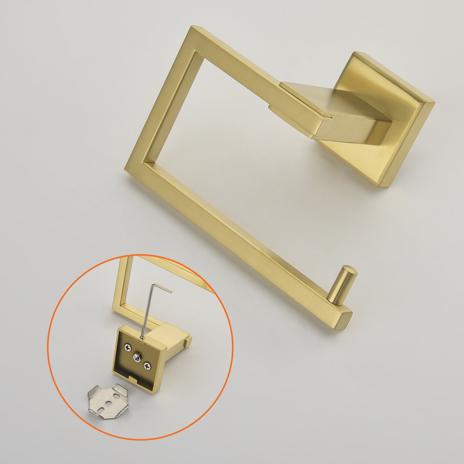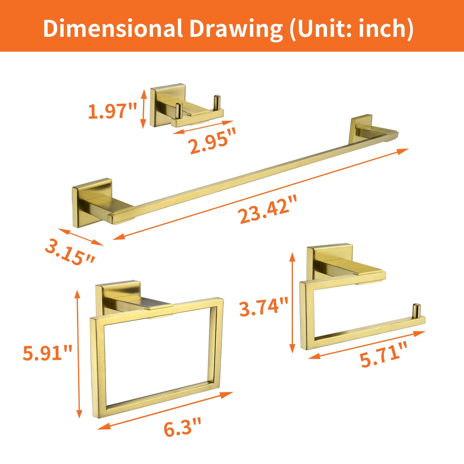 The unique brushed gold surface sealing glaze with anti-fingerprint treatment makes your bathroom look more beautiful and stylish. Made with SUS304 mounting brackets and top-grade stainless steel body, it effectively prevents corrosion and rust in daily use. The 4-piece bathroom hardware set includes a 23.42 in. towel bar, toilet paper holder, hand towel holder, and towel hook. Featuring clean lines and a modern appearance, it stands out from most towel rack sets on the market. The package comes with all necessary hardware and an installation guide for easy DIY setup, including premium stainless steel screws for firm wall mounting, while the concealed screws ensure a neat and attractive appearance. The mounting bracket is located at the back of the product; please remove it with the included Allen key before installation.