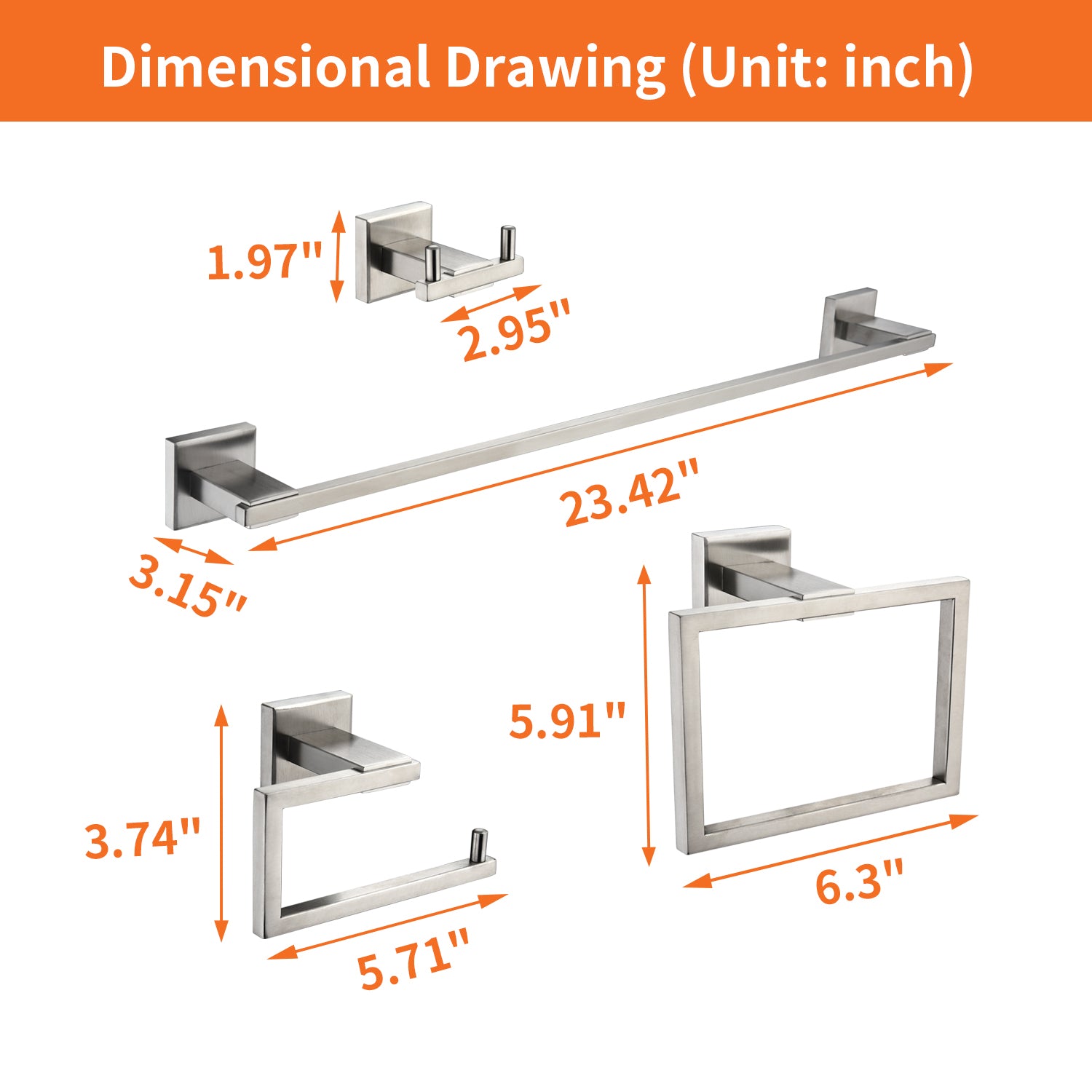 The unique brushed nickel surface sealing glaze with anti-fingerprint treatment makes your bathroom look more beautiful and stylish. Made with SUS304 mounting brackets and top-grade stainless steel body, it effectively prevents corrosion and rust in daily use. The 4-piece bathroom hardware set includes a 23.42 in. towel bar, toilet paper holder, hand towel holder, and towel hook. Featuring clean lines and a modern appearance, it stands out from most towel rack sets on the market. The package comes with all necessary hardware and an installation guide for easy DIY setup, including premium stainless steel screws for firm wall mounting, while the concealed screws ensure a neat and attractive appearance. The mounting bracket is located at the back of the product; please remove it with the included Allen key before installation.