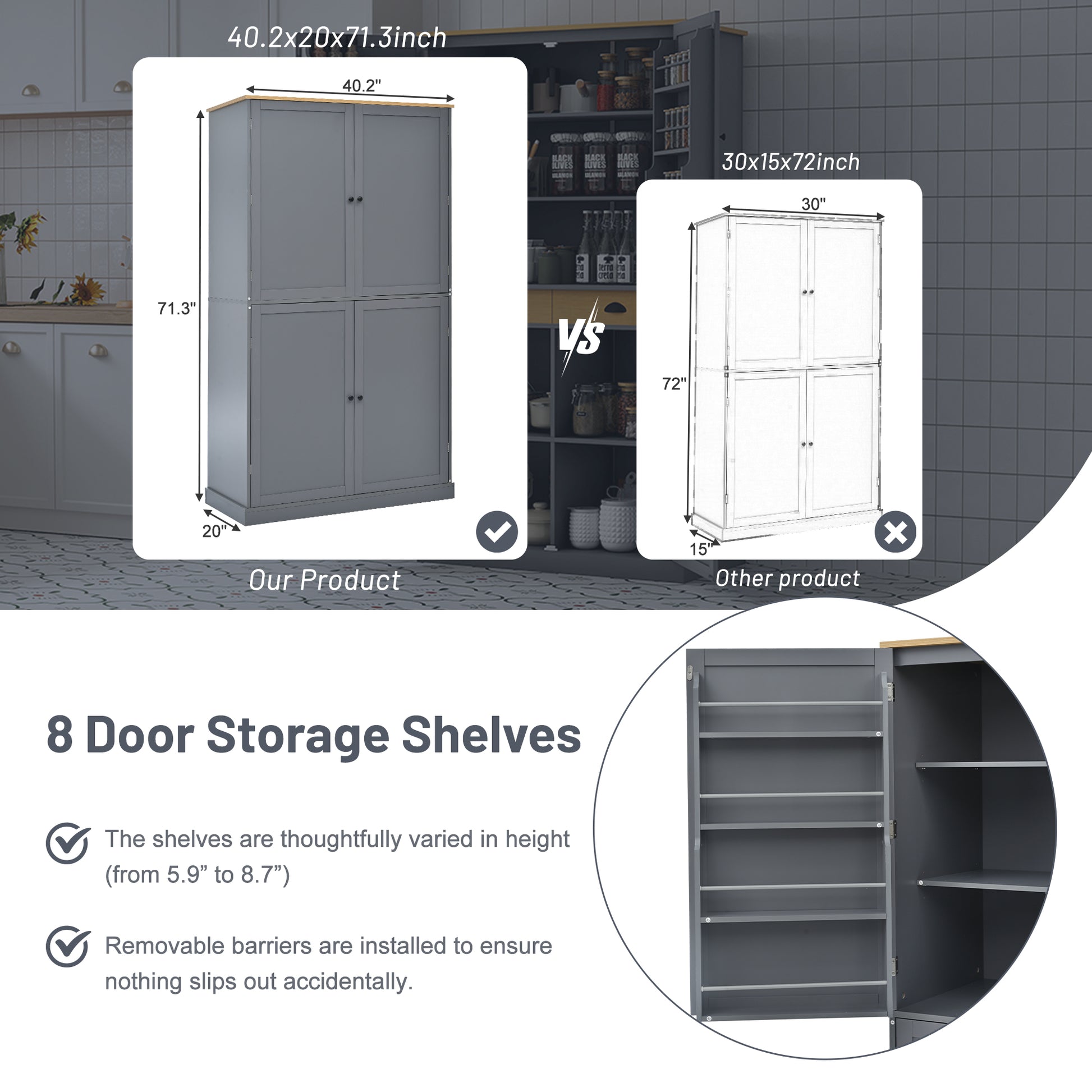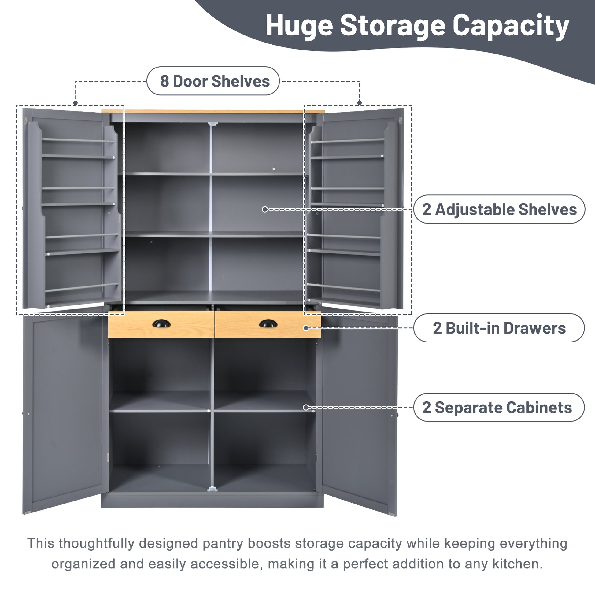 40.2in.W x 20in.D x 71.3in.H Gray Freestanding High Kitchen Pantry and Large Storage Cupboard Featuring 2 Drawers 2 Adjustable Shelves and 8 Door Mounted Shelves Ideal for Kitchens and Dining Rooms