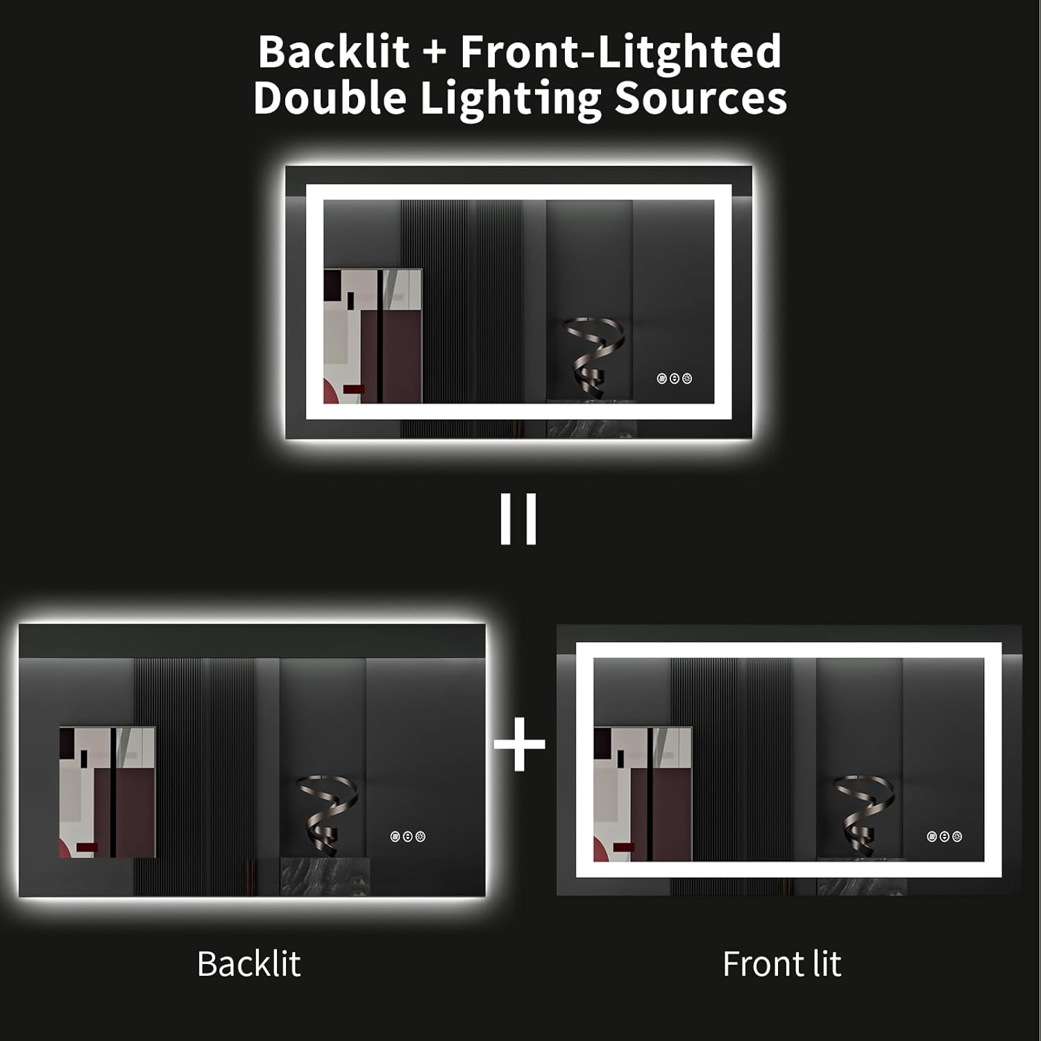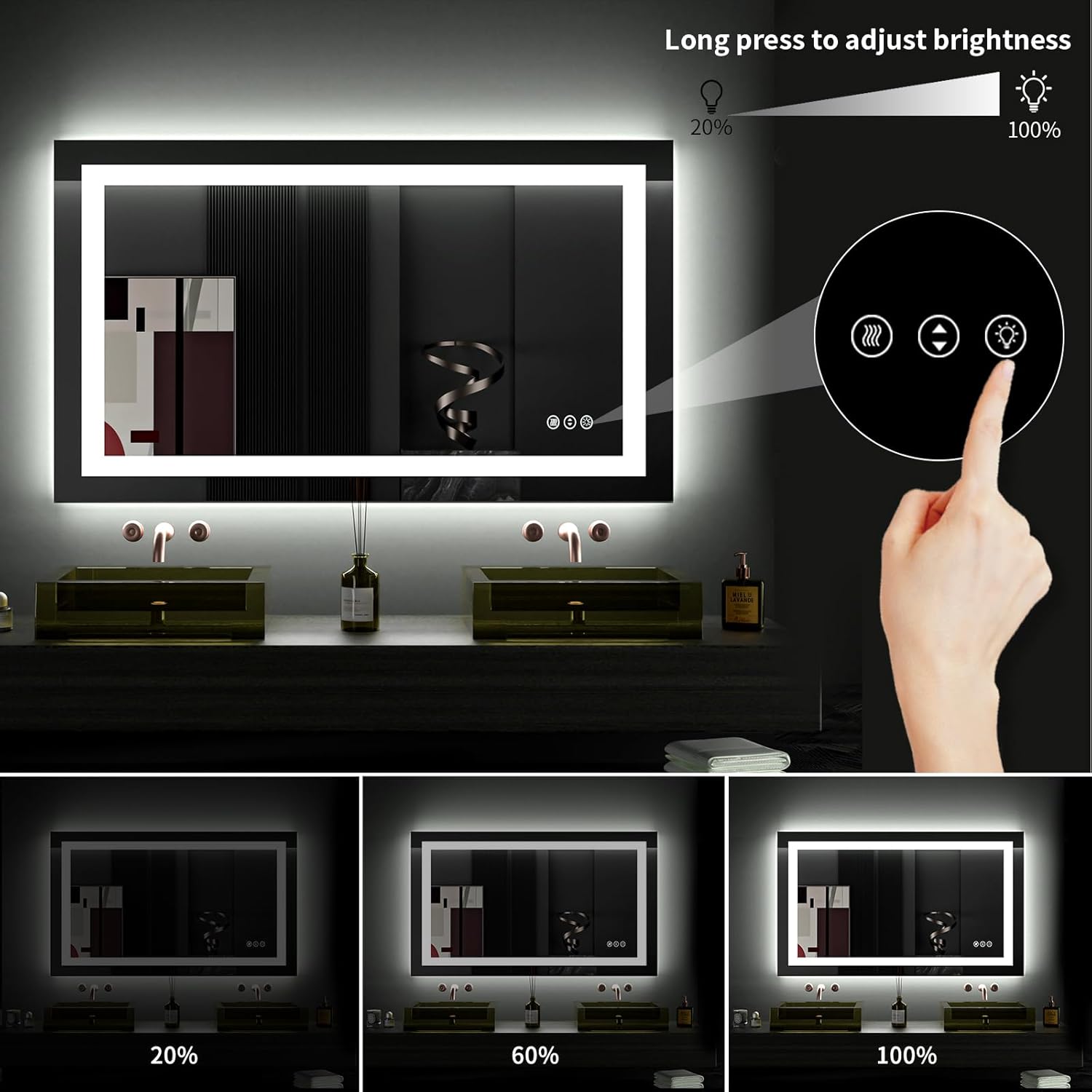 Elevate your bathroom with this 40x24 inch IP54 waterproof vanity mirror, featuring front and backlit LED lighting, intuitive touch controls, and a built-in anti-fog function. Enjoy infinitely dimmable brightness (10%–100%) and three adjustable color temperatures (3000K warm white, 4500K neutral white, 6000K daylight) with high lumen output and CRI 95 for true-to-life clarity. The integrated design combines power and anti-fog switches, supports wall switch control, and includes a memory function for added convenience. Crafted with UL-certified components, copper-free silver glass, and 5mm tempered glass, it offers superior safety, durability, and a 50,000+ hour LED lifespan. Comes with upgraded protective packaging and mounting accessories for easy, worry-free installation.