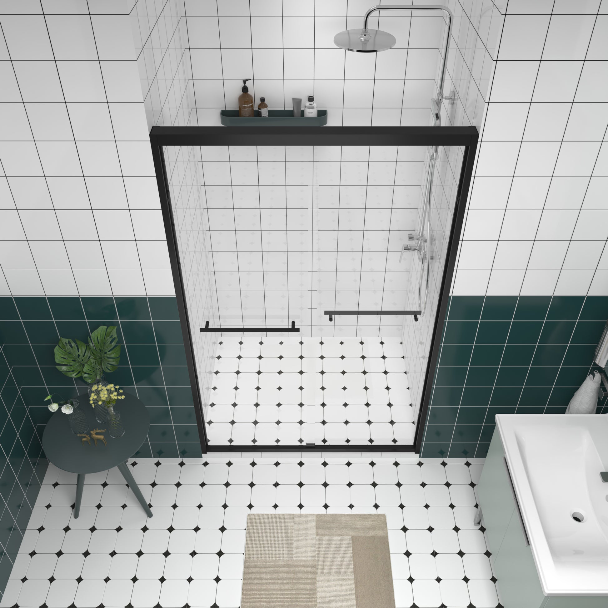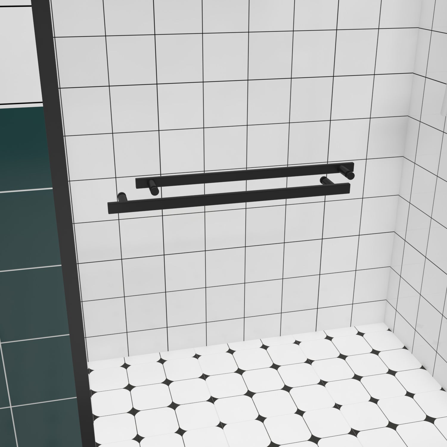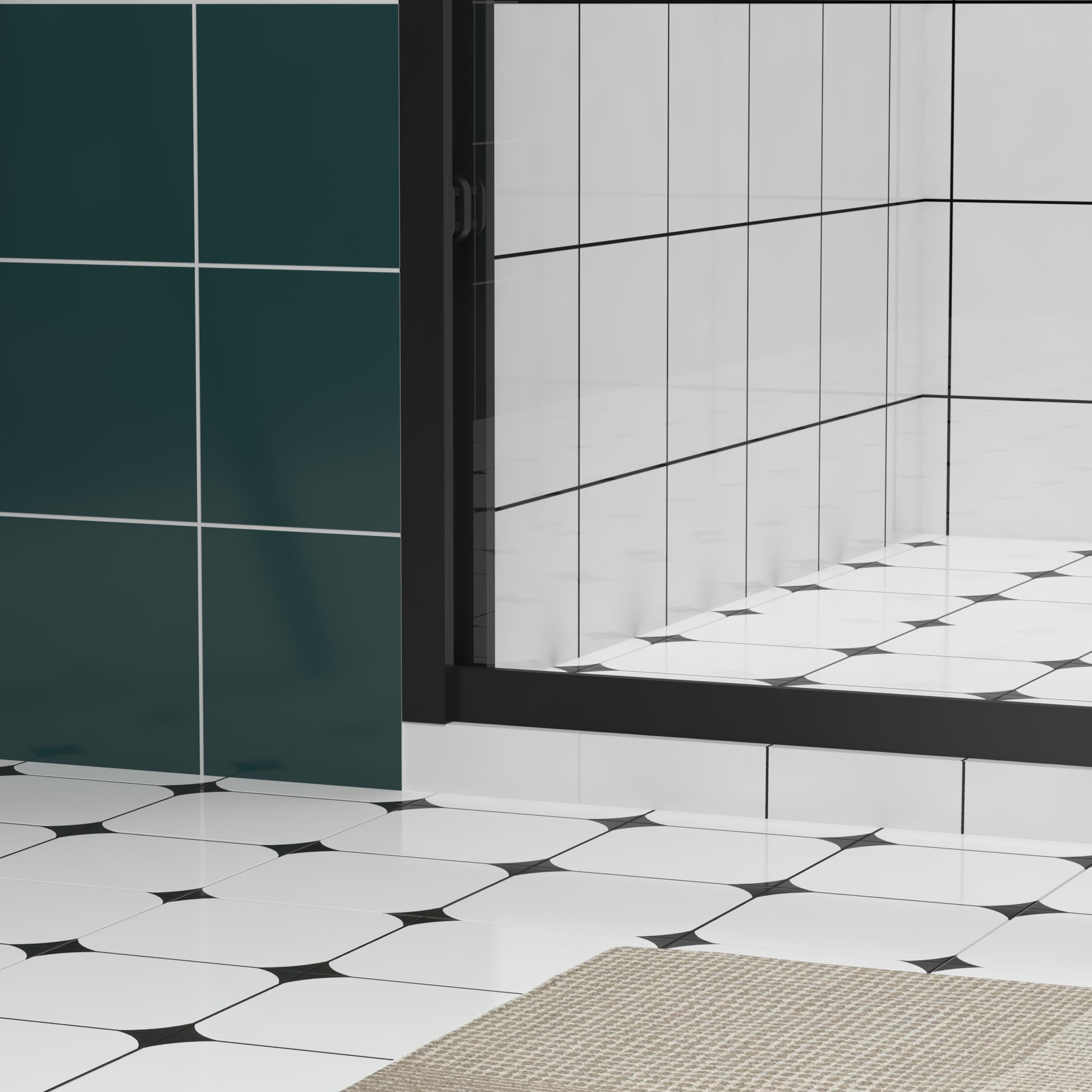Enhance your bathroom with this 44-48" W x 76" H double sliding aluminum frame shower door. Crafted from 1/4" (6mm) SGCC & ANSI certified clear tempered glass with chamfered edges, it ensures safety, durability, and a modern, sleek look. The thickened matte black aluminum frame provides superior stability, while the stainless steel double handle doubles as a towel bar and sliding grip. Mute sliding rollers ensure smooth, quiet operation. The waterproof design seals water inside the shower, keeping your bathroom dry and tidy. Width is adjustable by cutting guide for a perfect fit, with reversible installation for left or right opening. Shipped in reinforced honeycomb packaging to ensure safe delivery. (Shower base not included.)