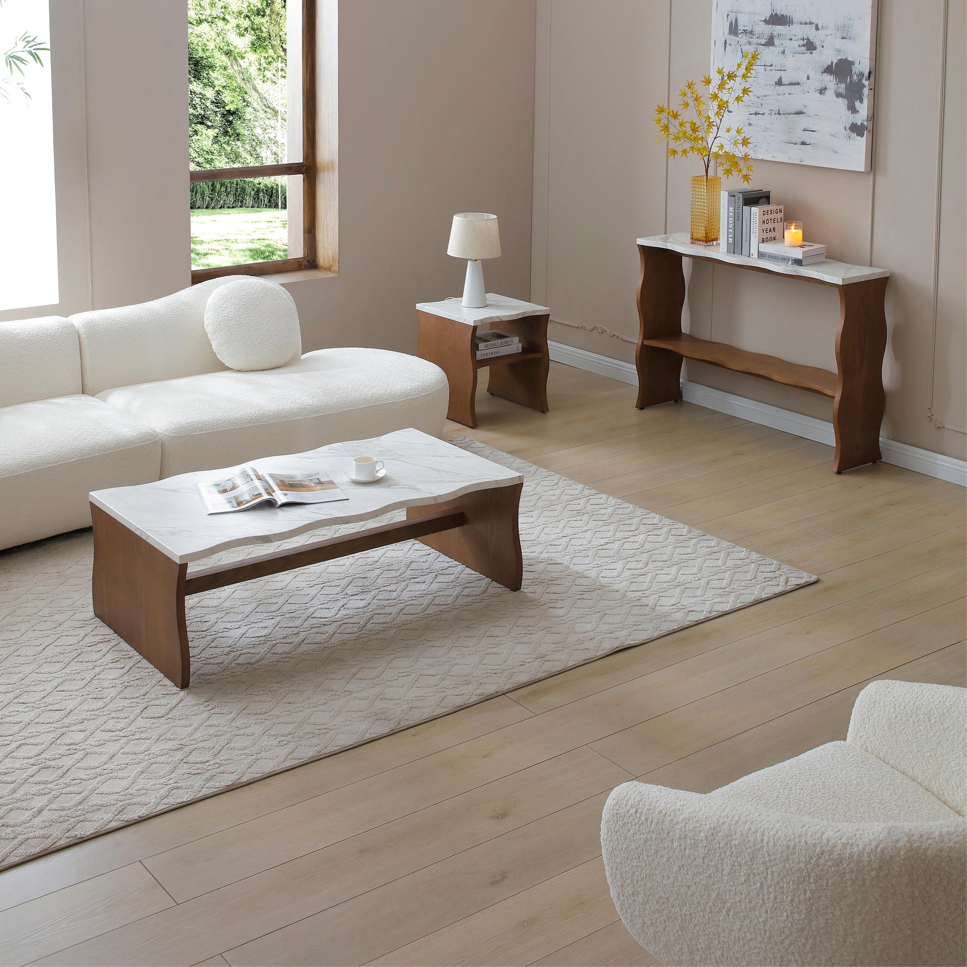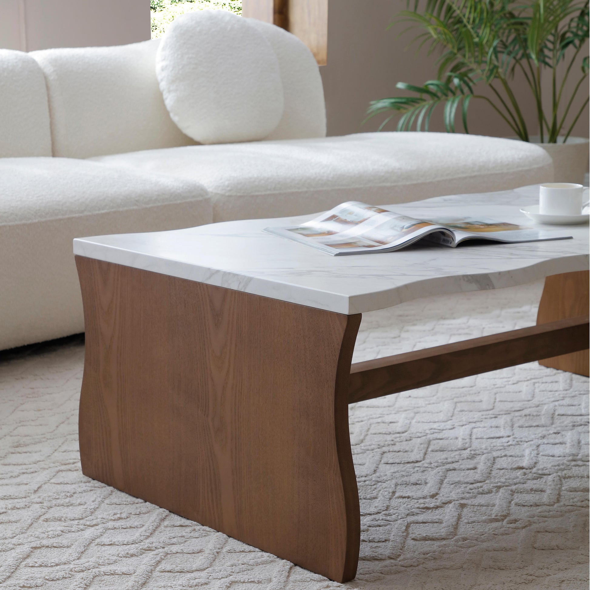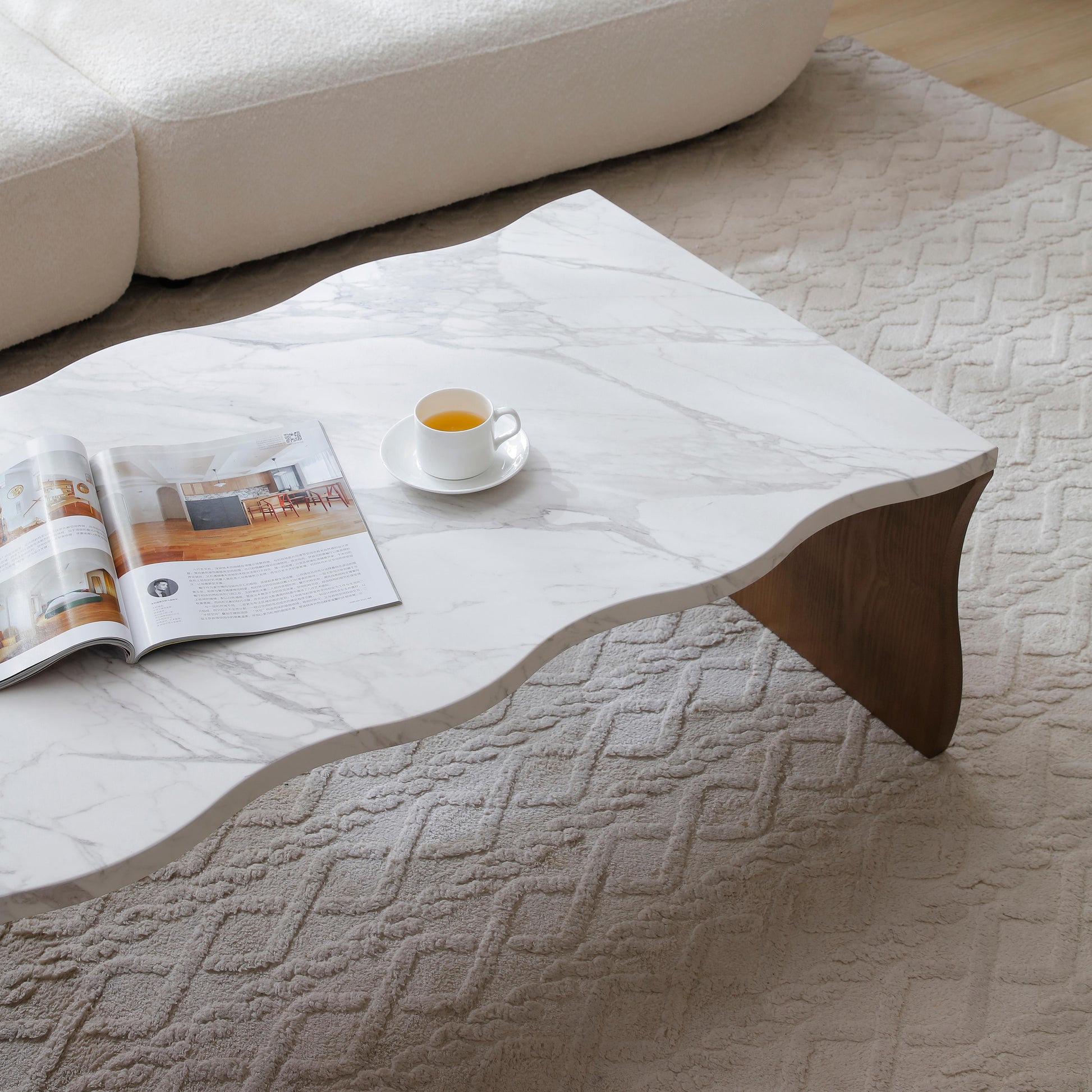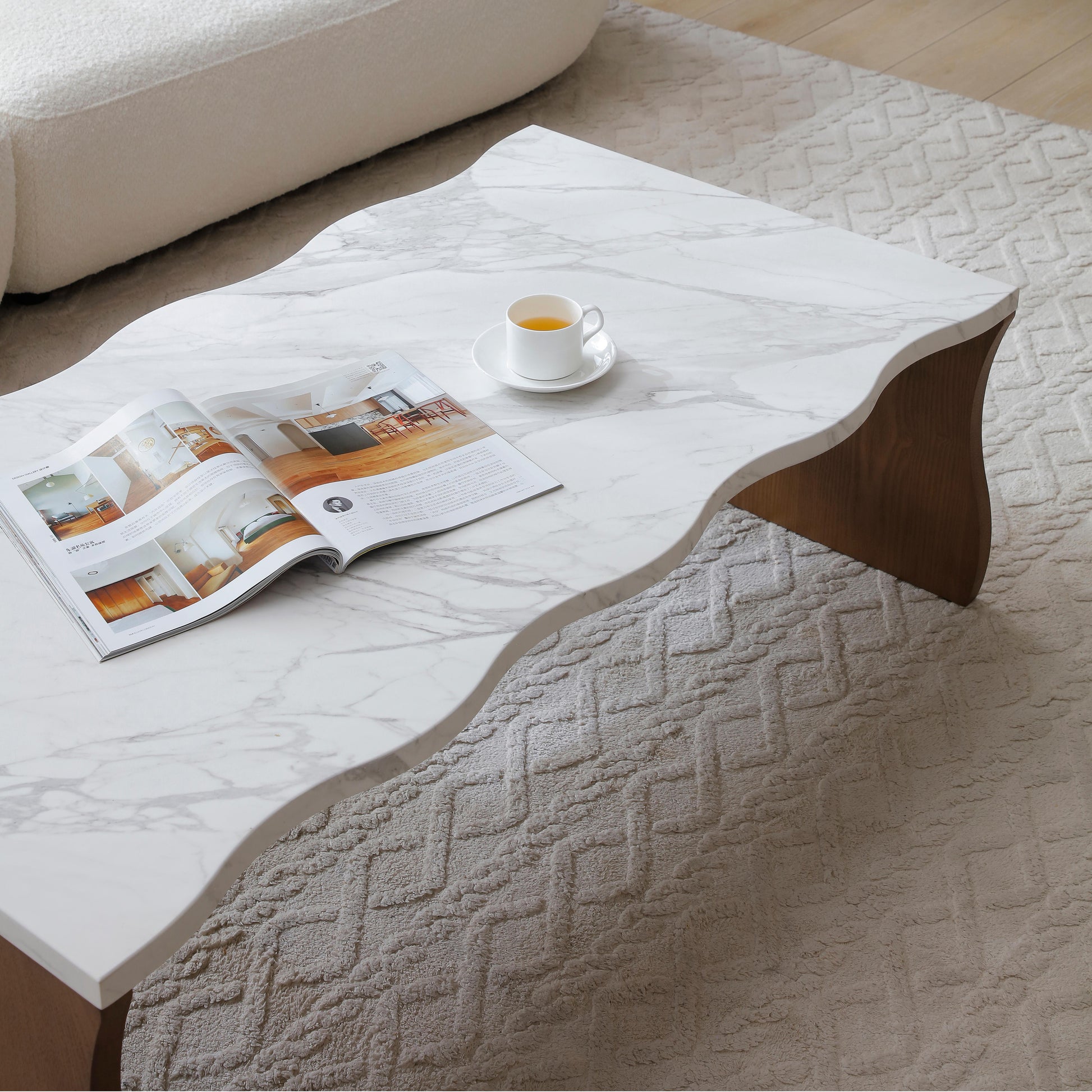 This modern coffee table showcases an organic wave inspired silhouette that blends sculptural artistry with minimalist design. The white faux marble tabletop pairs harmoniously with the rich walnut brown base, achieving a balanced aesthetic that is both contemporary and naturally warm. Crafted from E1 grade MDF with a durable artificial marble finish, the surface offers excellent scratch and moisture resistance, ensuring effortless cleaning and long lasting beauty. The spacious free form tabletop provides ample room for tea sets, books, décor, and daily essentials without feeling cluttered. Designed to complement mid century, Scandinavian, and transitional interiors, it serves as a versatile centerpiece for living rooms, lounges, studies, or bedroom seating areas.