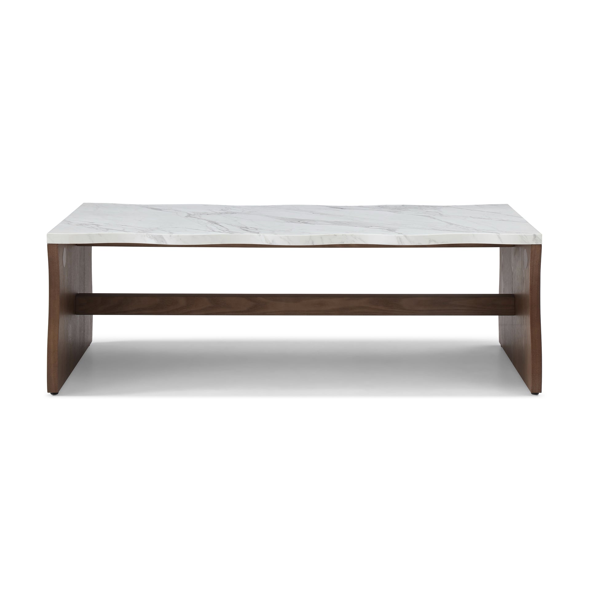 47.24 Inch Whisper of Waves Modern Coffee Table White Faux Marble Top Walnut Brown Base