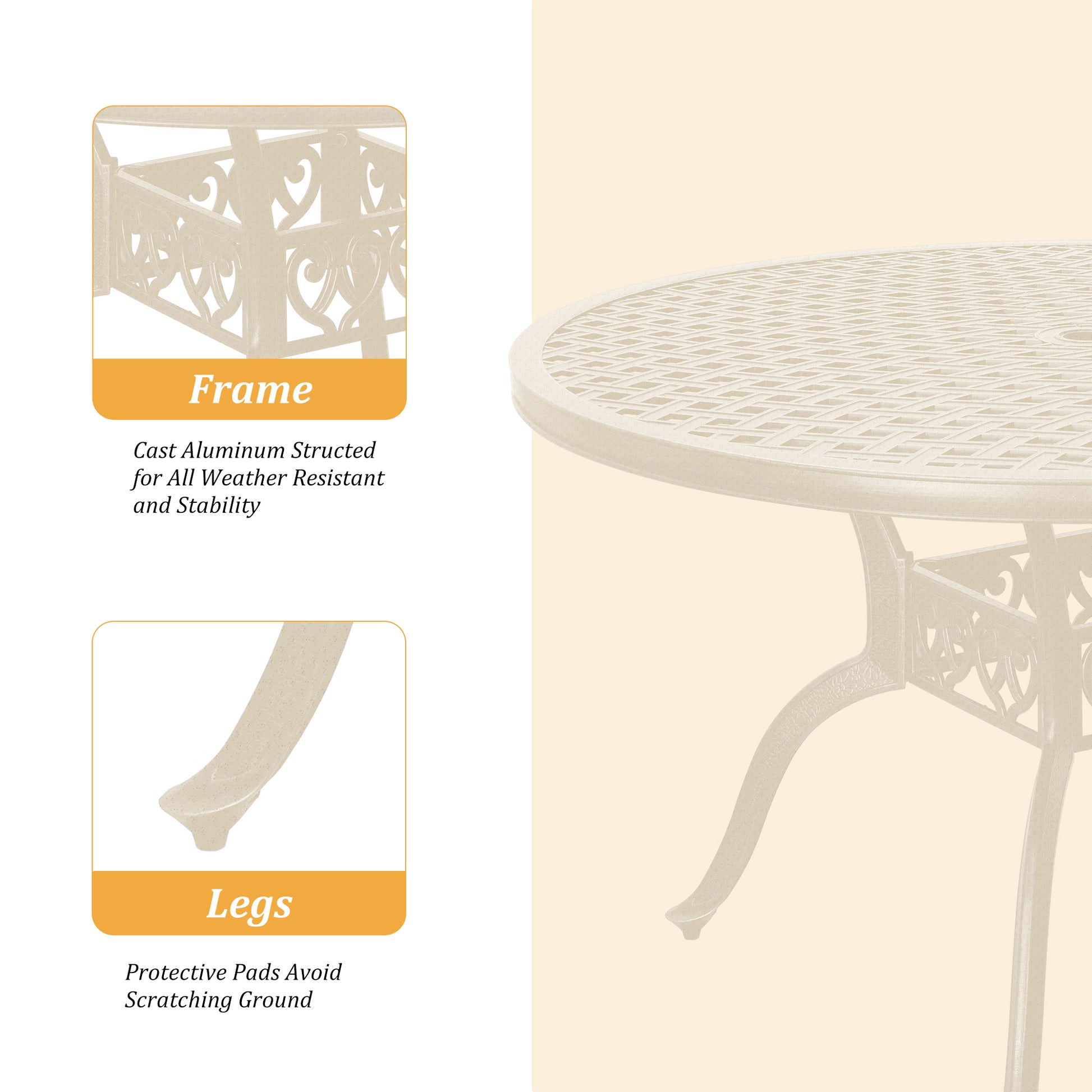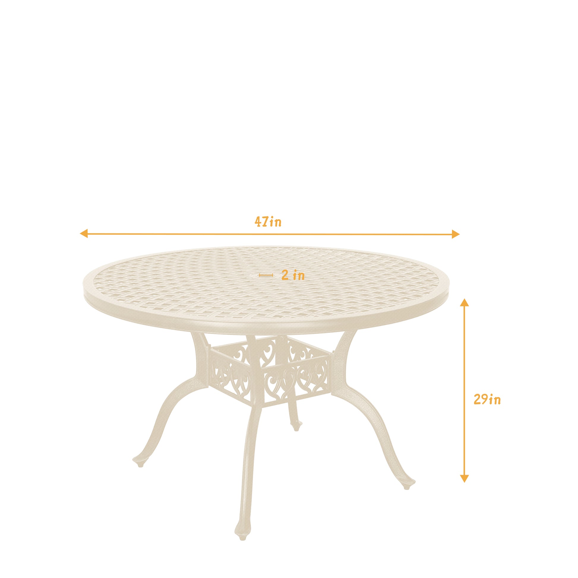 This 47 inches cast aluminum outdoor dining table is a comfortable and stylish outdoor furniture in your courtyard, which can accommodate about 4 people. Relax and enjoy a meal outdoor with this dining table with your family and friends. Crafted from sturdy cast-aluminum with a powder-coated finish, this patio bistro table features an intricate design on its tabletop. Sure to be a focal point this table can be paired with dining chairs or join an eclectic mix of furniture on your patio or deck. It can be used in many occasions and can add decoration to your backyard, pool and more.