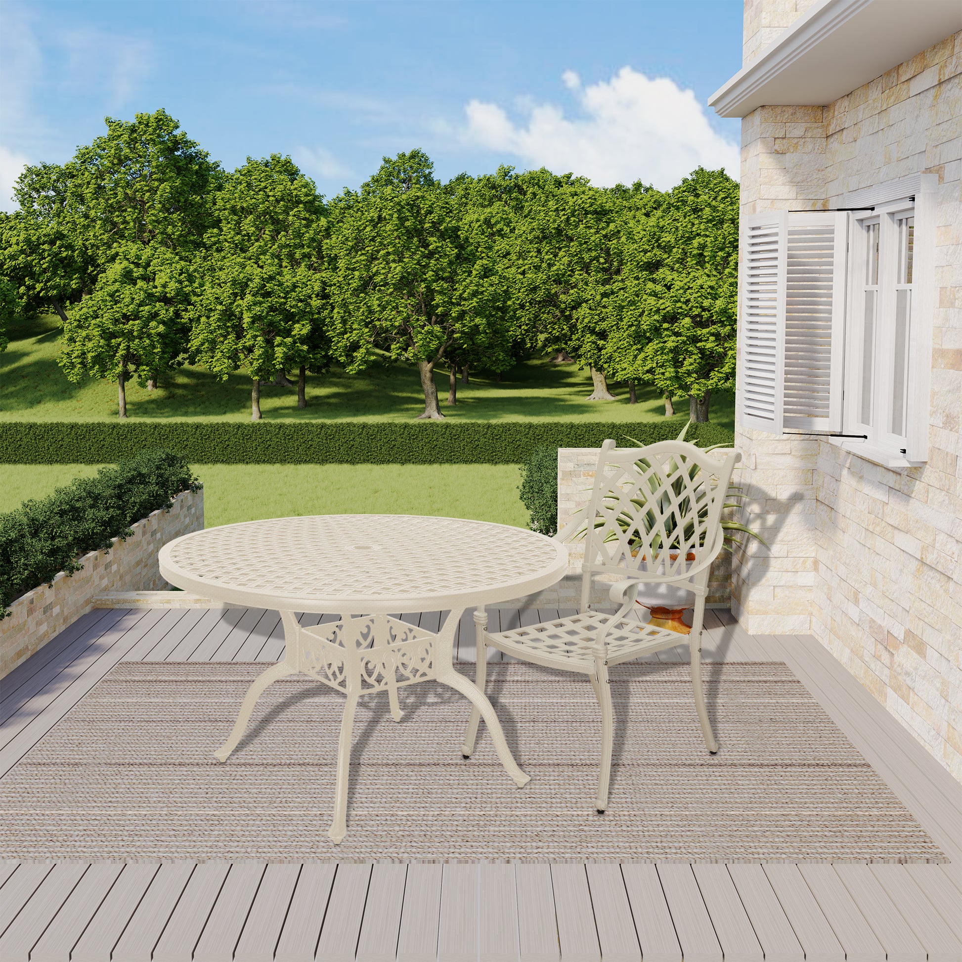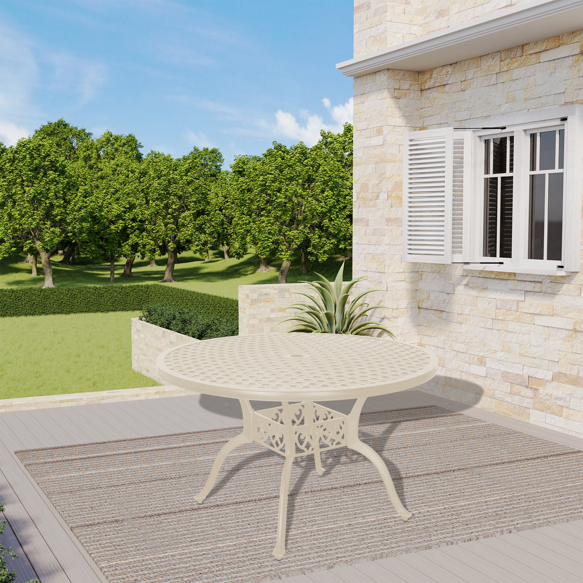 47 Inches Outdoor Dining Table Cast Aluminium Round Table Patio Dining Table with Umbrella Hole All Weather Outdoor Bistro Table for Backyard Garden Patio, White