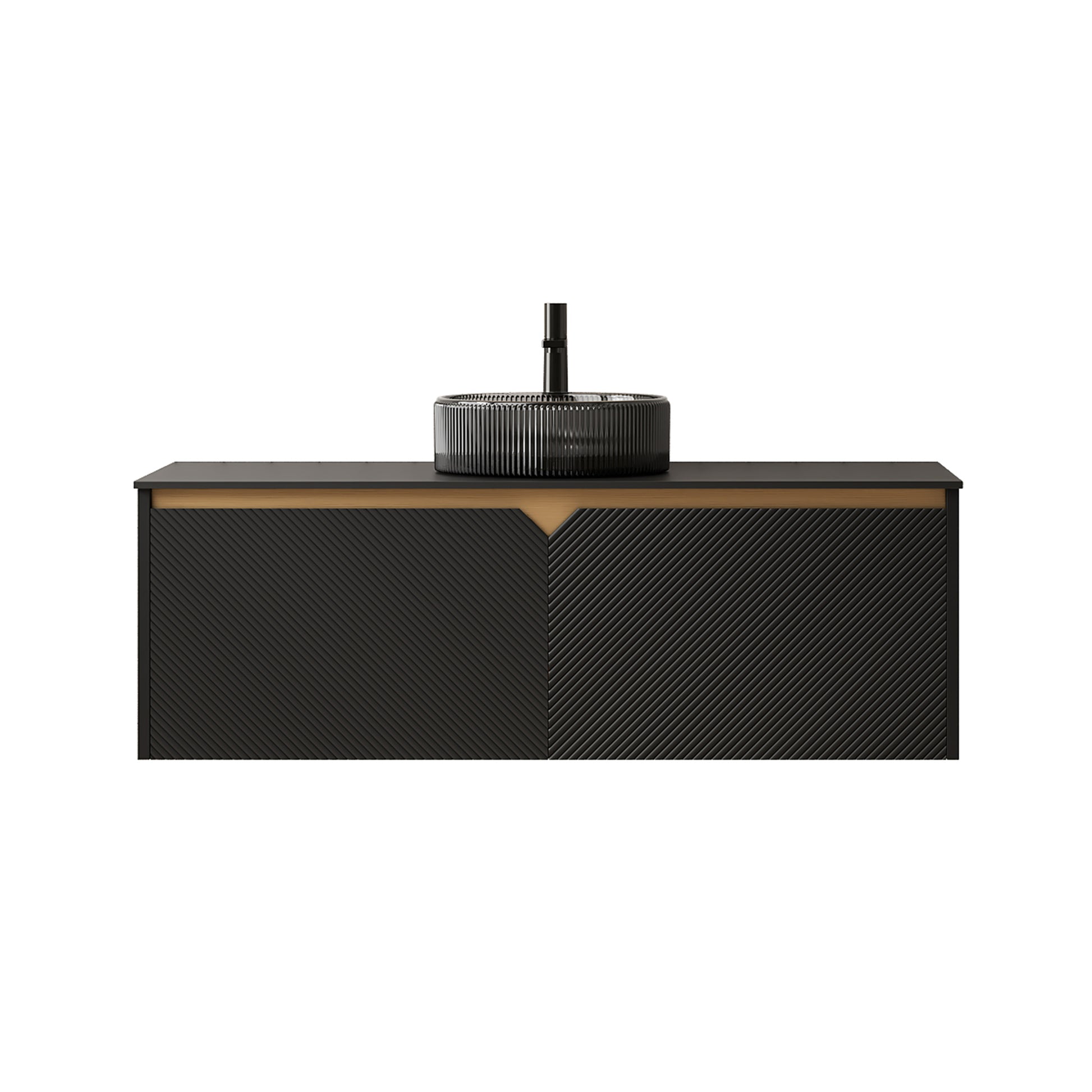 48 Bathroom Vanity with Sink Wall Mounted Floating Plywood Cabinet Twill Double Doors Transparent Black Round Glass Basin Black Sintered Stone