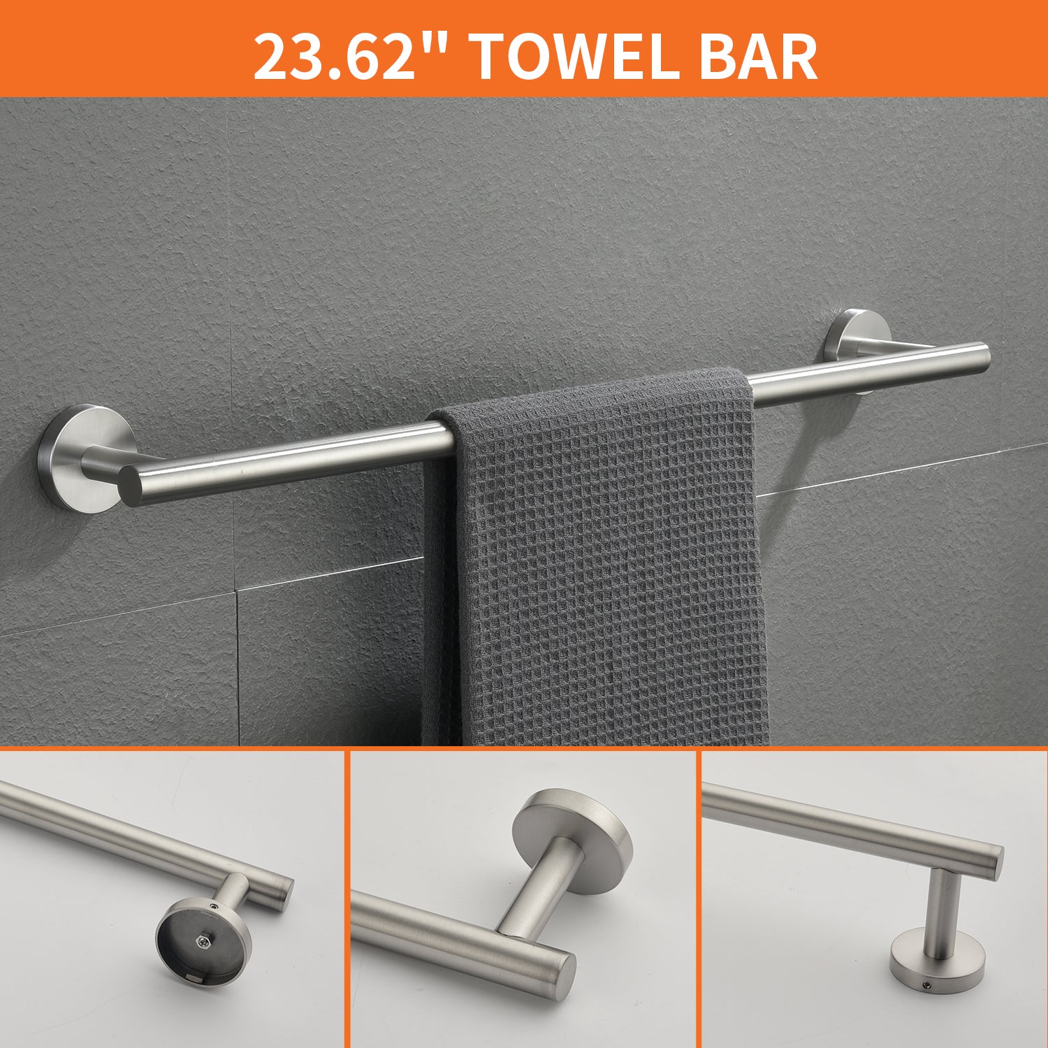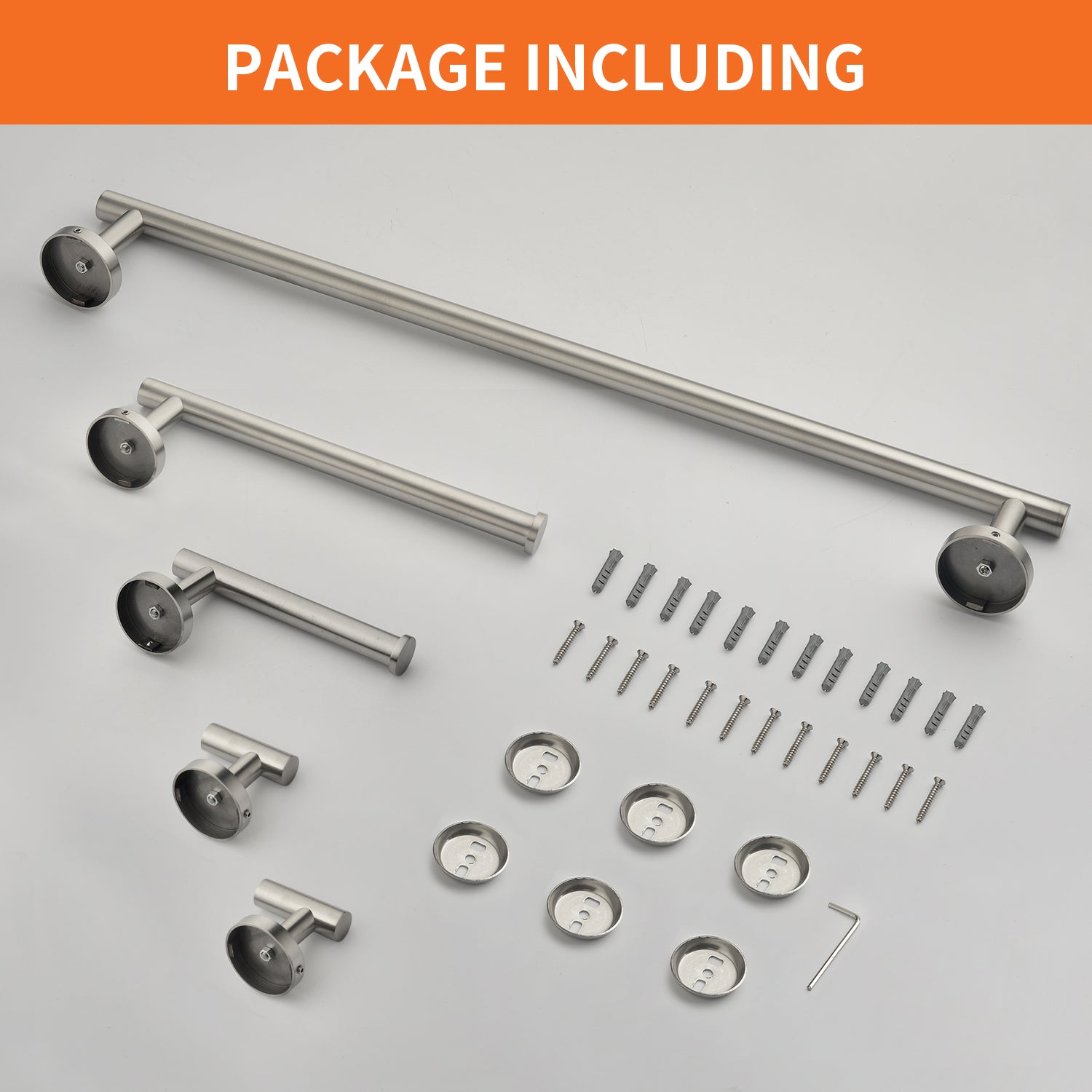 The 5-Piece Bath Hardware Set with Towel Hooks, Towel Bar, Toilet Paper Holder and Hand Towel Holder in Brushed Nickel features a unique surface with sealing glaze and anti-fingerprint treatment, making your bathroom look more beautiful and stylish. Made with SUS304 mounting brackets and a top-grade stainless steel body, it effectively resists corrosion and rust during daily use. The set includes a 23.62 in. towel bar, toilet paper holder, hand towel holder, and 2 towel hooks. With its clean lines and modern design, it stands out from most towel rack sets on the market. The package comes with all necessary hardware and a guide for easy DIY installation, including premium stainless steel screws for firm wall mounting, and concealed screws for a clean, attractive look. The mounting bracket is located on the back of the product, please remove it with the included Allen key before installation.