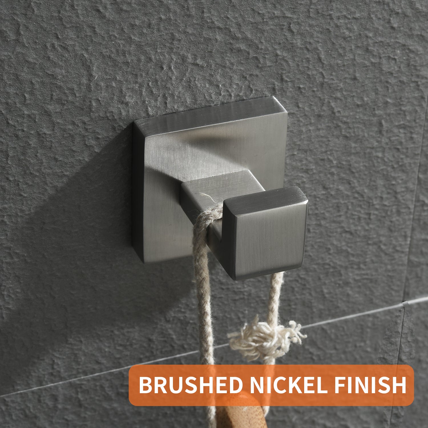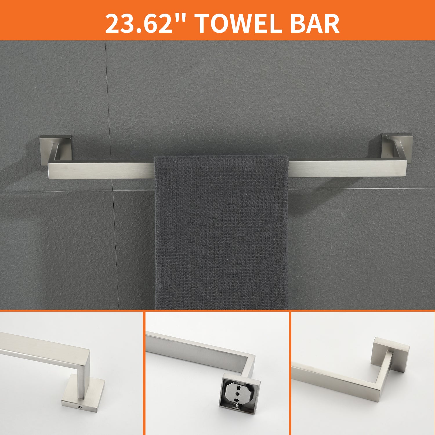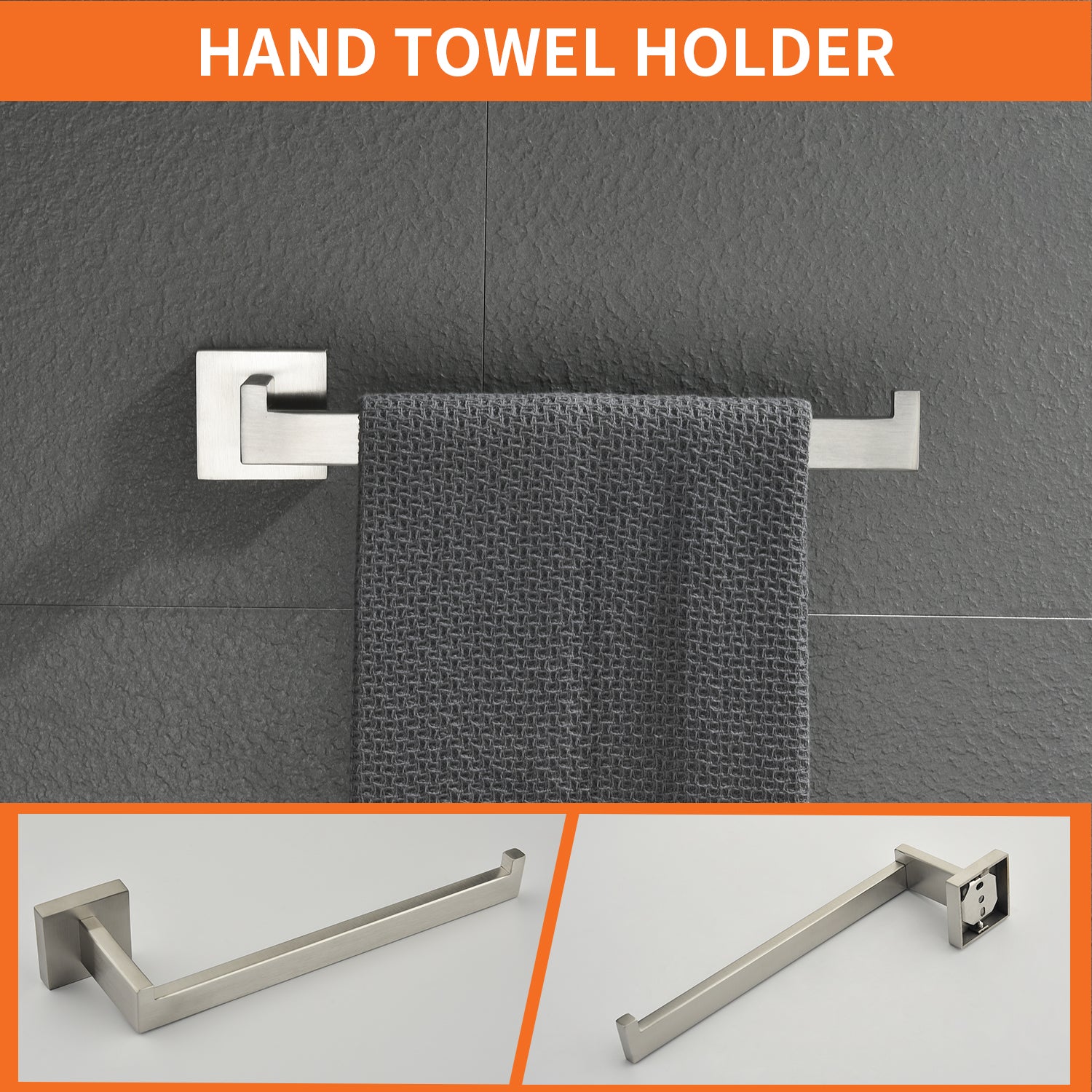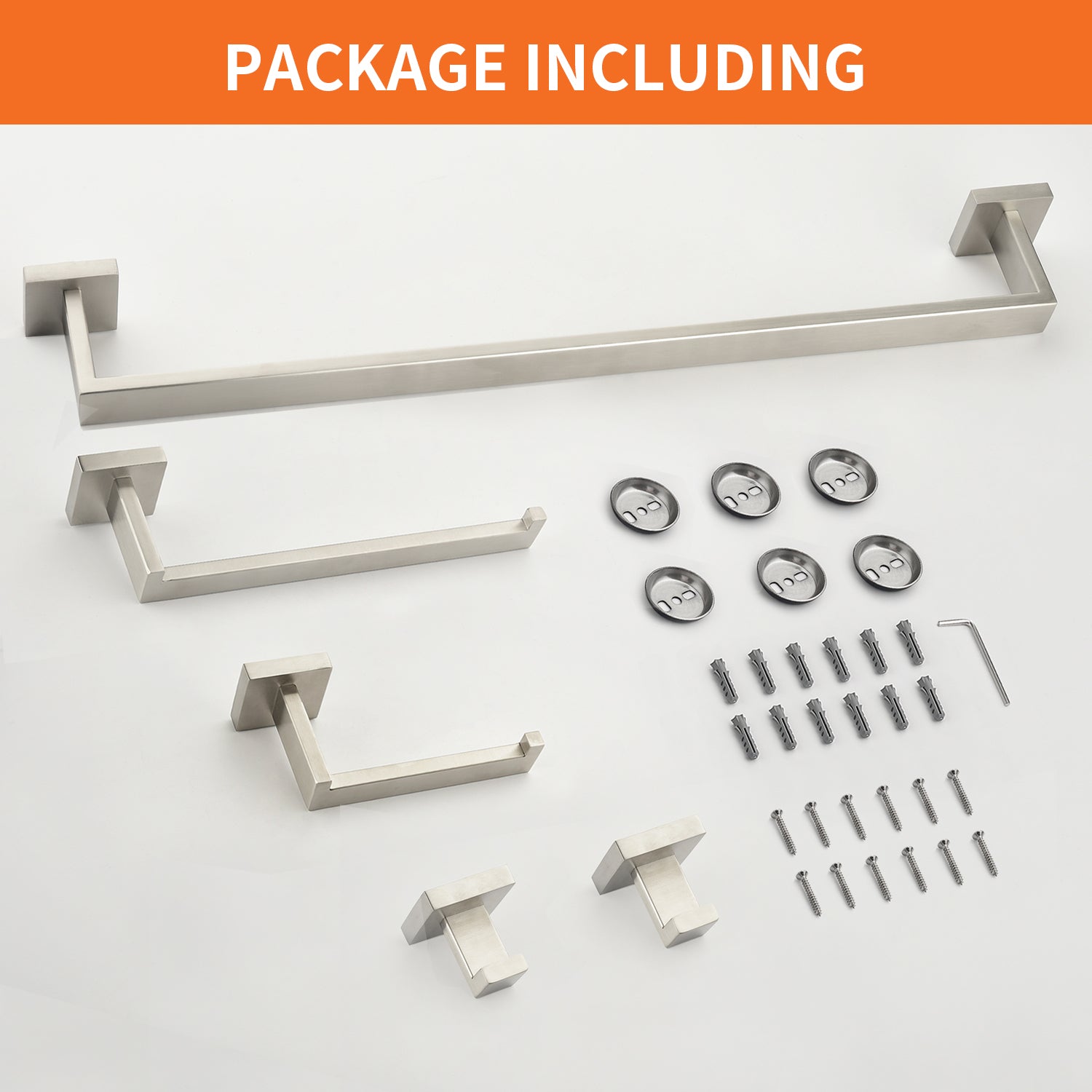 The 5-Piece Bath Hardware Set with Towel Hooks, Towel Bar, Toilet Paper Holder and Hand Towel Holder in Brushed Nickel features a unique brushed nickel surface with sealing glaze and anti-fingerprint treatment that makes your bathroom look more beautiful and stylish. Made with SUS304 mounting brackets and a top-grade stainless steel body, it effectively prevents corrosion and rust in daily use. The set includes a 23.62 in. towel bar, toilet paper holder, hand towel holder, and 2 towel hooks. With its clean lines and modern look, it stands out from most towel rack sets on the market. The package comes with necessary hardware and a guide for easy DIY installation, including premium stainless steel screws for firm wall mounting, while the concealed screws ensure a neat and attractive appearance. The mounting bracket is located at the back of the product, please remove it with the included Allen key before installation.