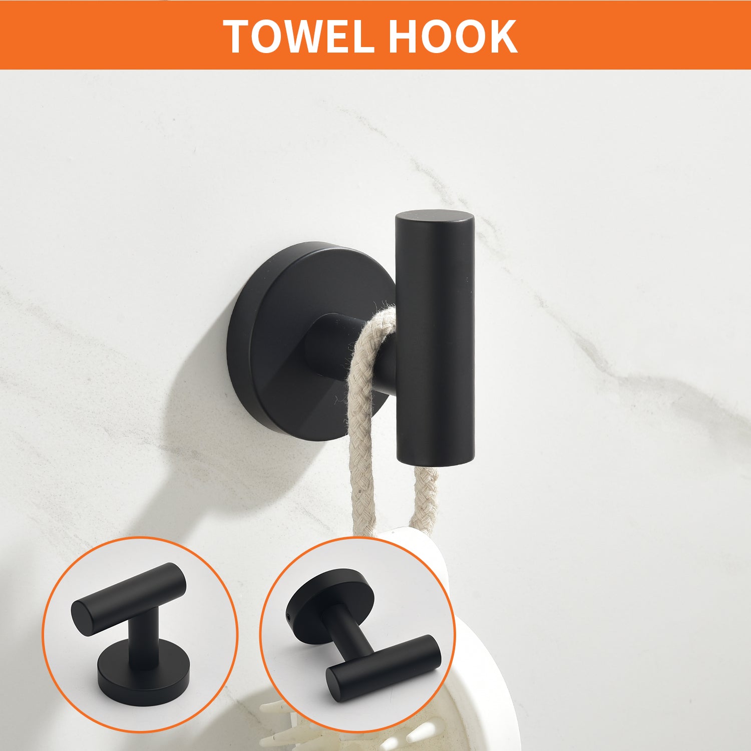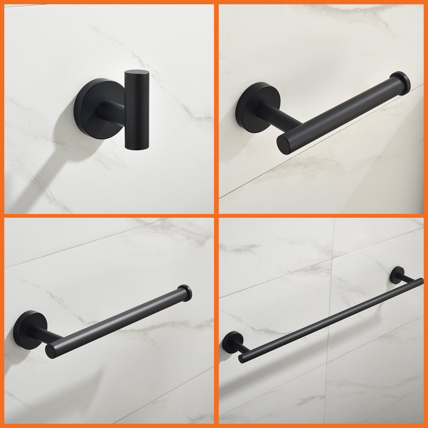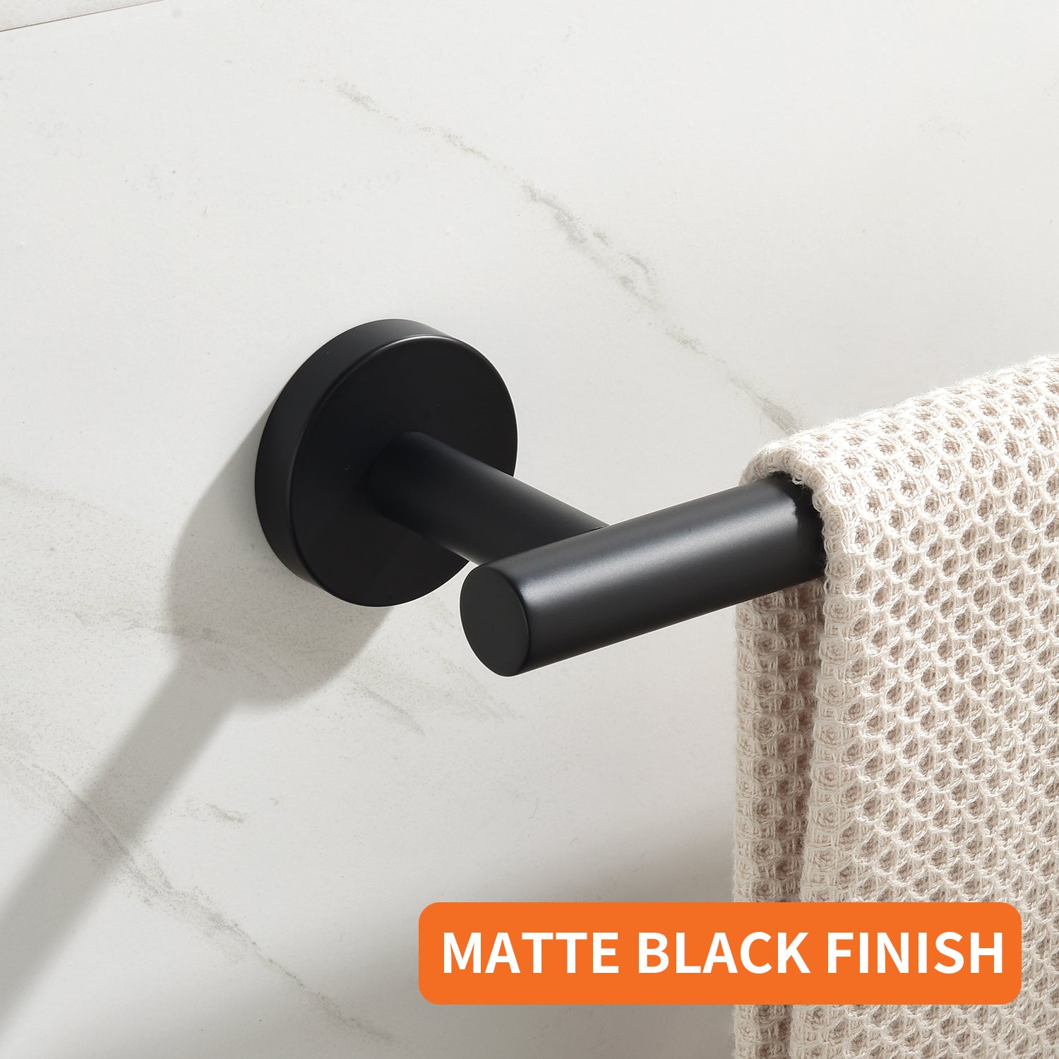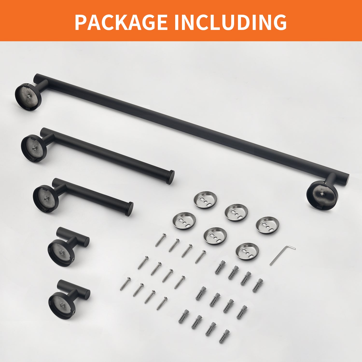 The 5-Piece Bath Hardware Set with Towel Hooks, Towel Bar, Toilet Paper Holder and Hand Towel Holder in Matte Black features an elegant finish that blends perfectly with your bathroom. Made with SUS304 mounting brackets and top-grade stainless steel body, it effectively resists corrosion and rust during daily use. The set includes a 23.62 in. towel bar, toilet paper holder, hand towel holder, and 2 towel hooks. With its clean lines and unique design, it stands out from most towel rack sets on the market. The package comes with all necessary hardware and a guide for easy DIY installation, including premium stainless steel screws for firm wall mounting, and concealed screws for a clean, attractive look. The mounting bracket is located on the back of the product, please remove it with the included Allen key before installation.
