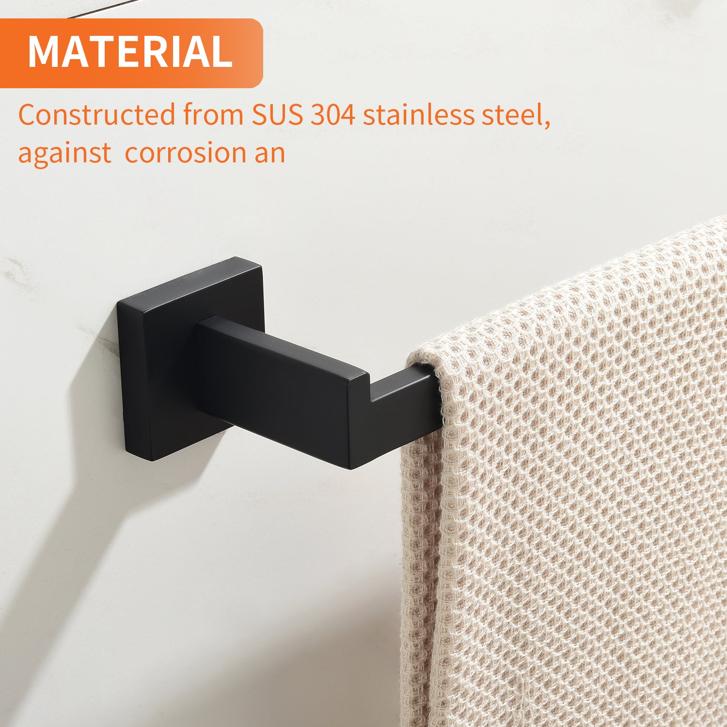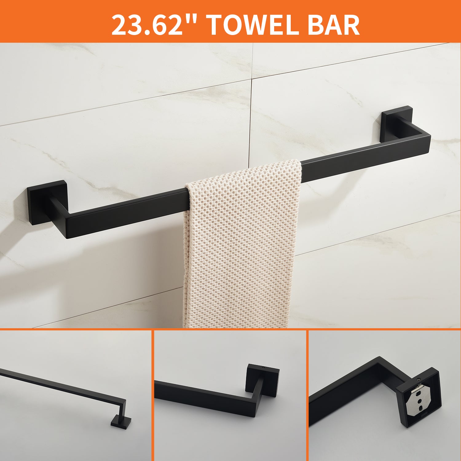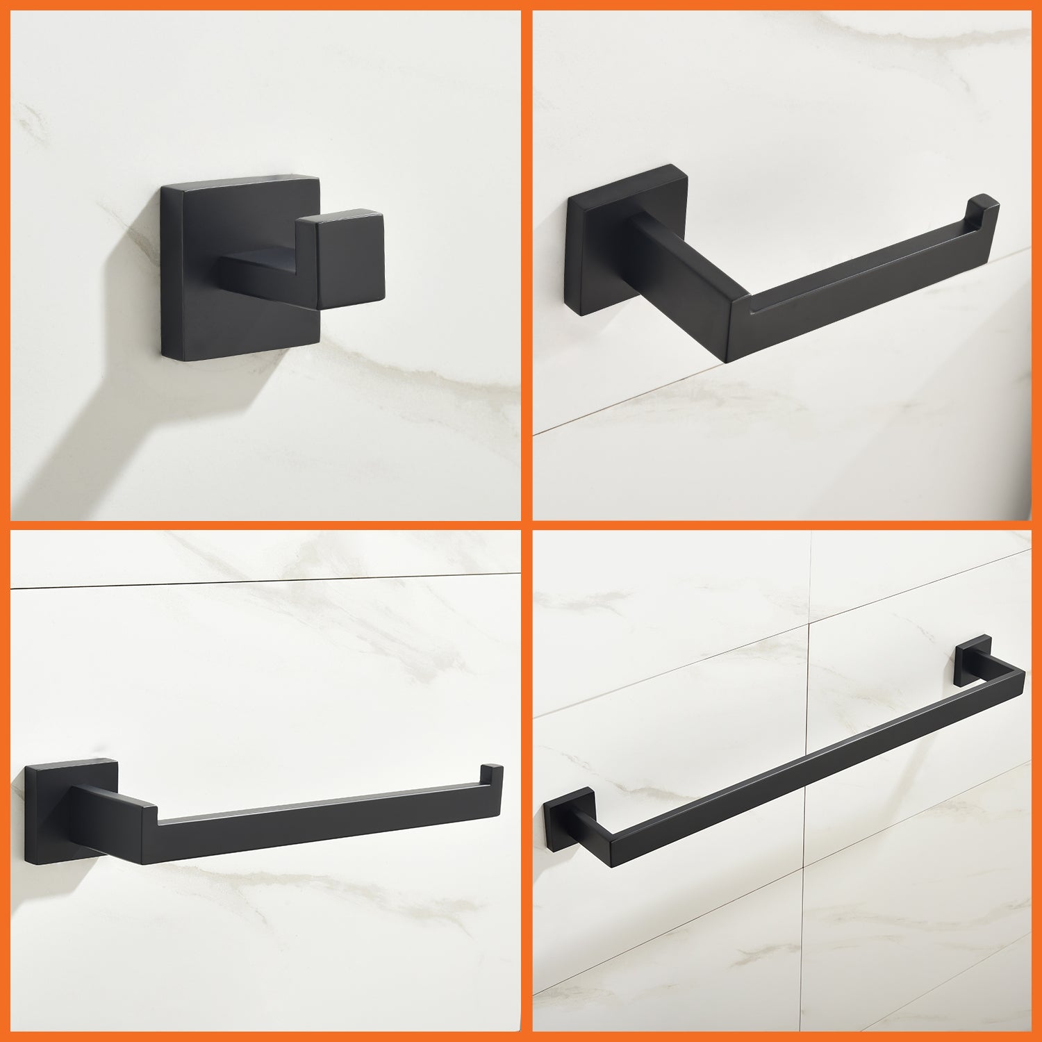The 5-Piece Bath Hardware Set with Towel Hooks, Towel Bar, Toilet Paper Holder and Hand Towel Holder in Matte Black features an elegant finish that blends in perfectly with your bathroom. Made with SUS304 mounting brackets and a top-grade stainless steel body, it effectively prevents corrosion and rust during daily use. The set includes a 23.62 in. towel bar, toilet paper holder, hand towel holder, and 2 towel hooks. With its clean lines and sleek design, it stands out from most towel rack sets on the market. The package comes with all necessary hardware and a guide for easy DIY installation, including premium stainless steel screws for secure wall mounting, and concealed screws for a neat and attractive look. The mounting bracket is located on the back of the product, please remove it with the included Allen key before installation.