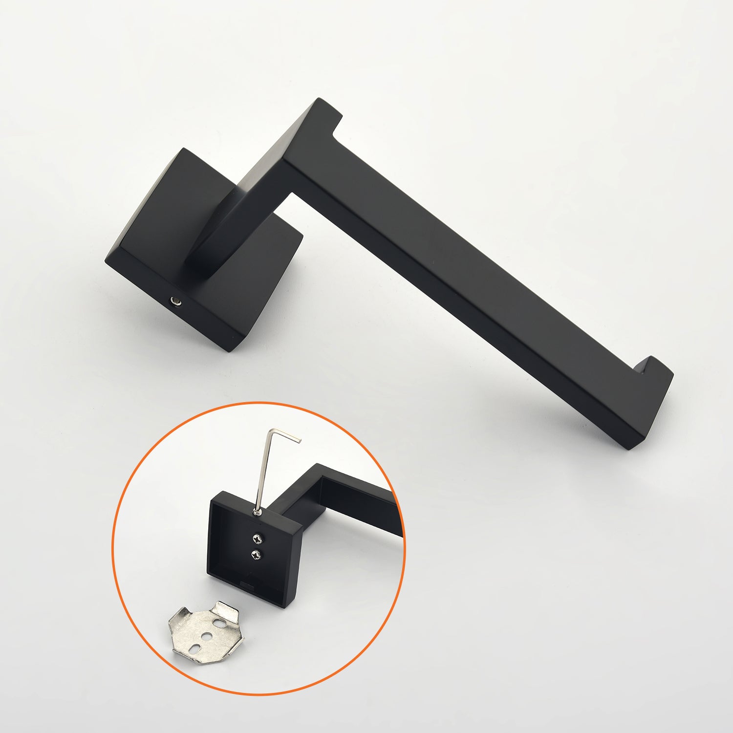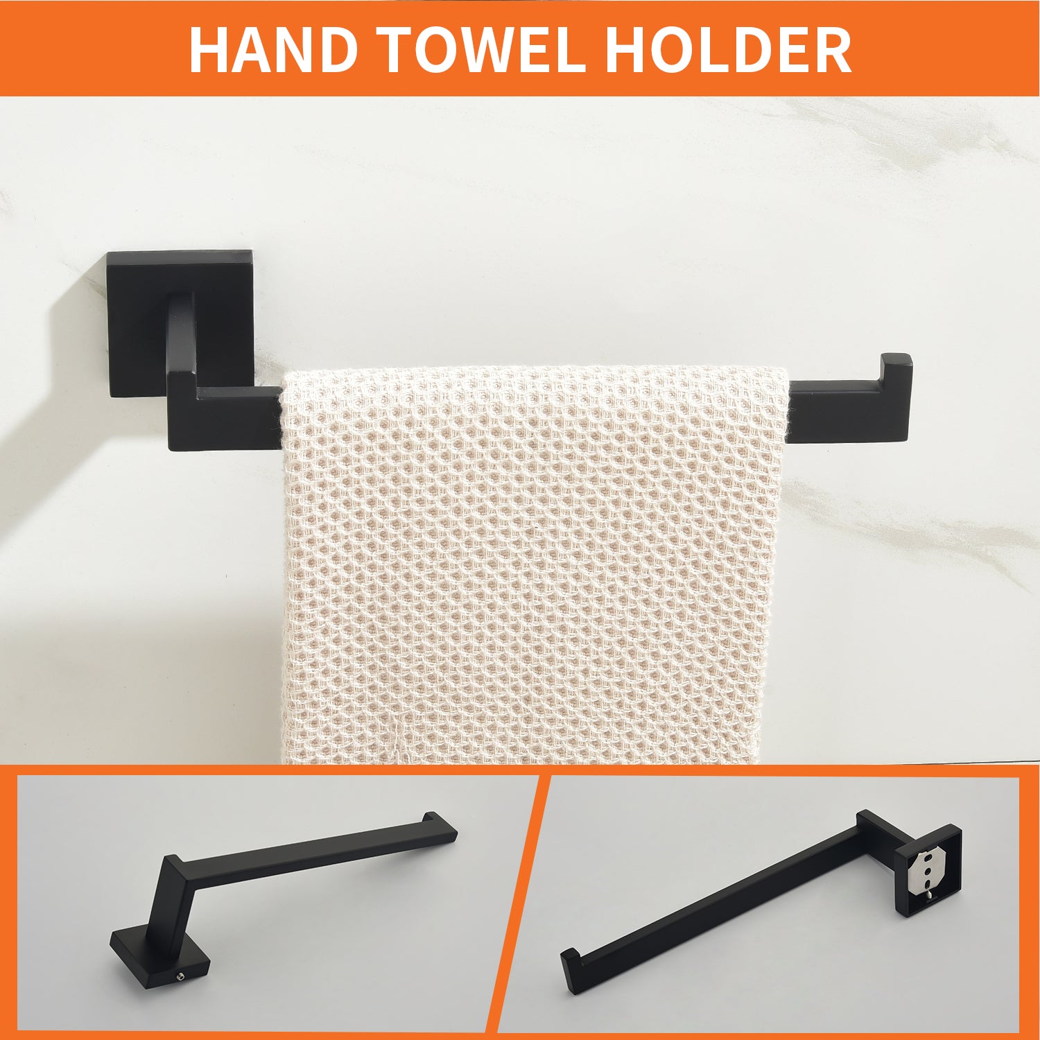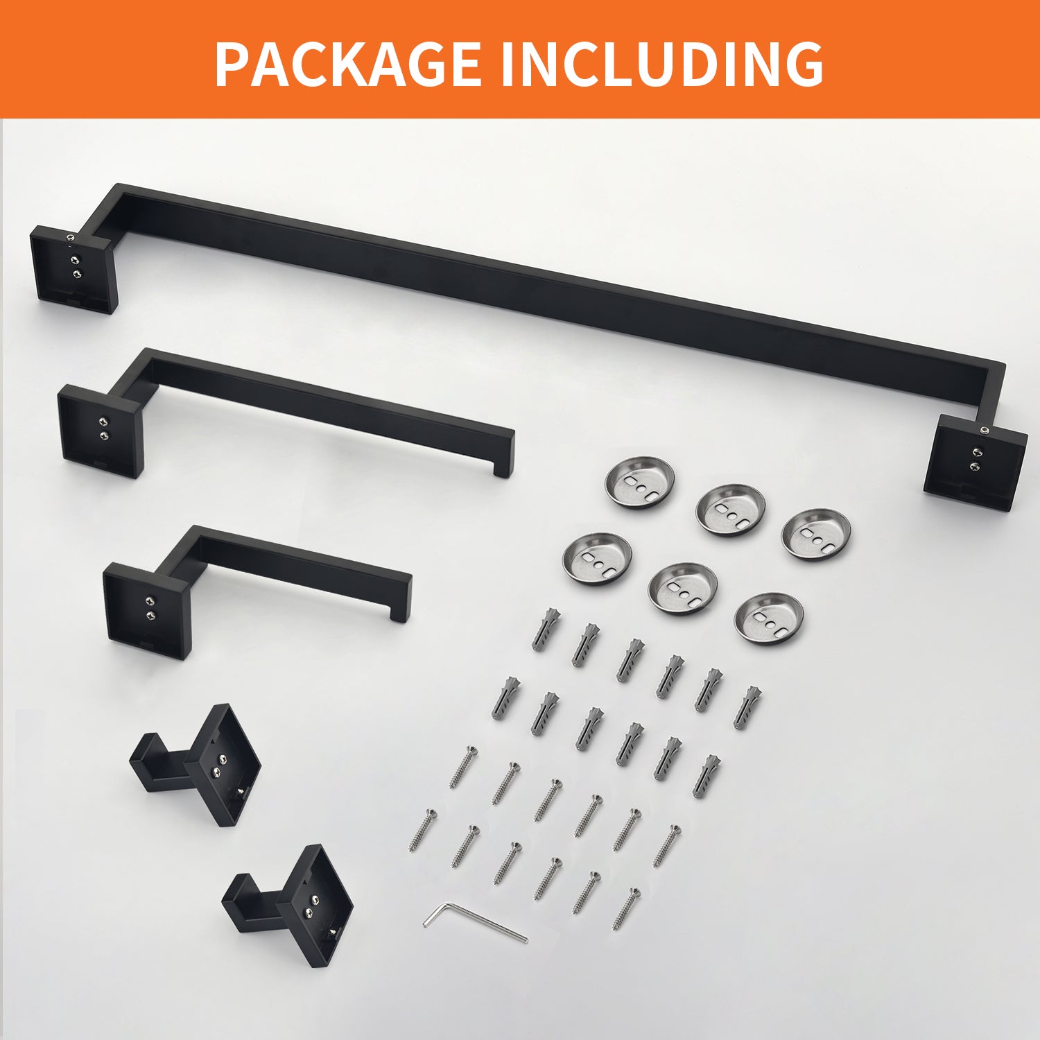 The 5-Piece Bath Hardware Set with Towel Hooks, Towel Bar, Toilet Paper Holder and Hand Towel Holder in Matte Black features an elegant finish that blends in perfectly with your bathroom. Made with SUS304 mounting brackets and a top-grade stainless steel body, it effectively prevents corrosion and rust during daily use. The set includes a 23.62 in. towel bar, toilet paper holder, hand towel holder, and 2 towel hooks. With its clean lines and sleek design, it stands out from most towel rack sets on the market. The package comes with all necessary hardware and a guide for easy DIY installation, including premium stainless steel screws for secure wall mounting, and concealed screws for a neat and attractive look. The mounting bracket is located on the back of the product, please remove it with the included Allen key before installation.