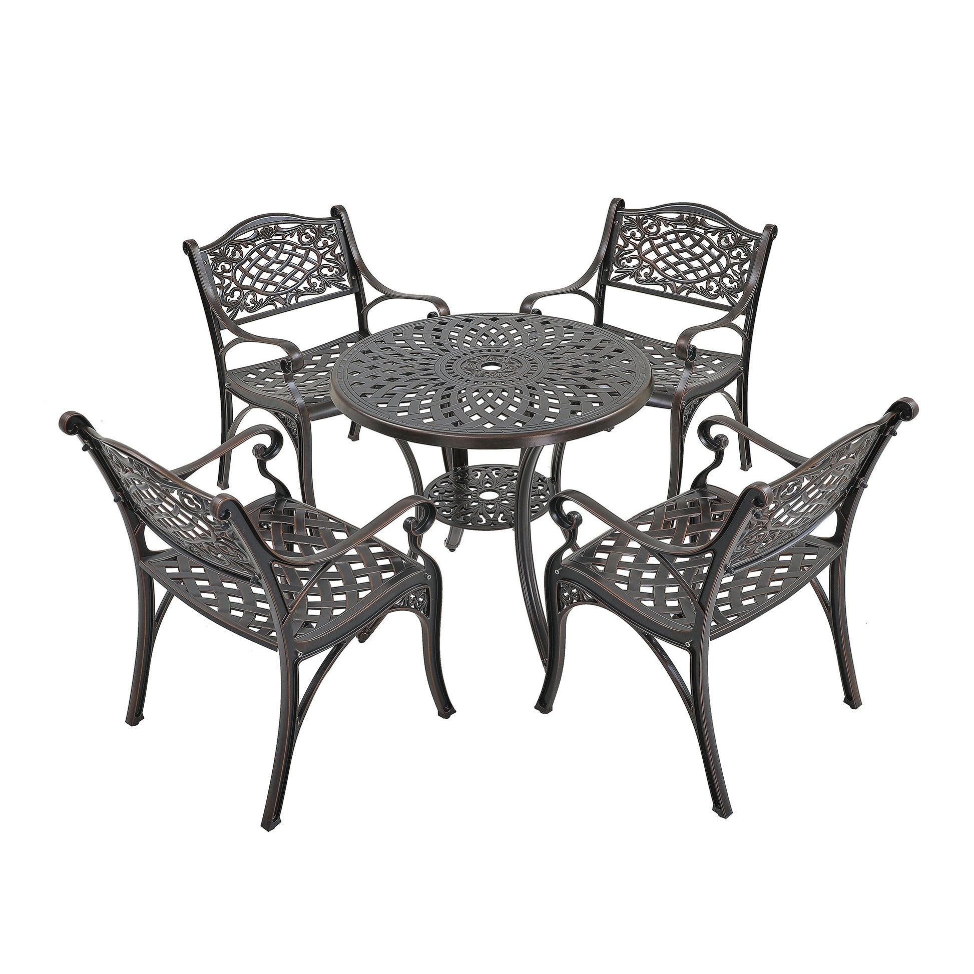 5-Piece Cast Aluminum Outdoor Dining Set Patio Table with Umbrella Hole Patio Dining Chairs in Bronze