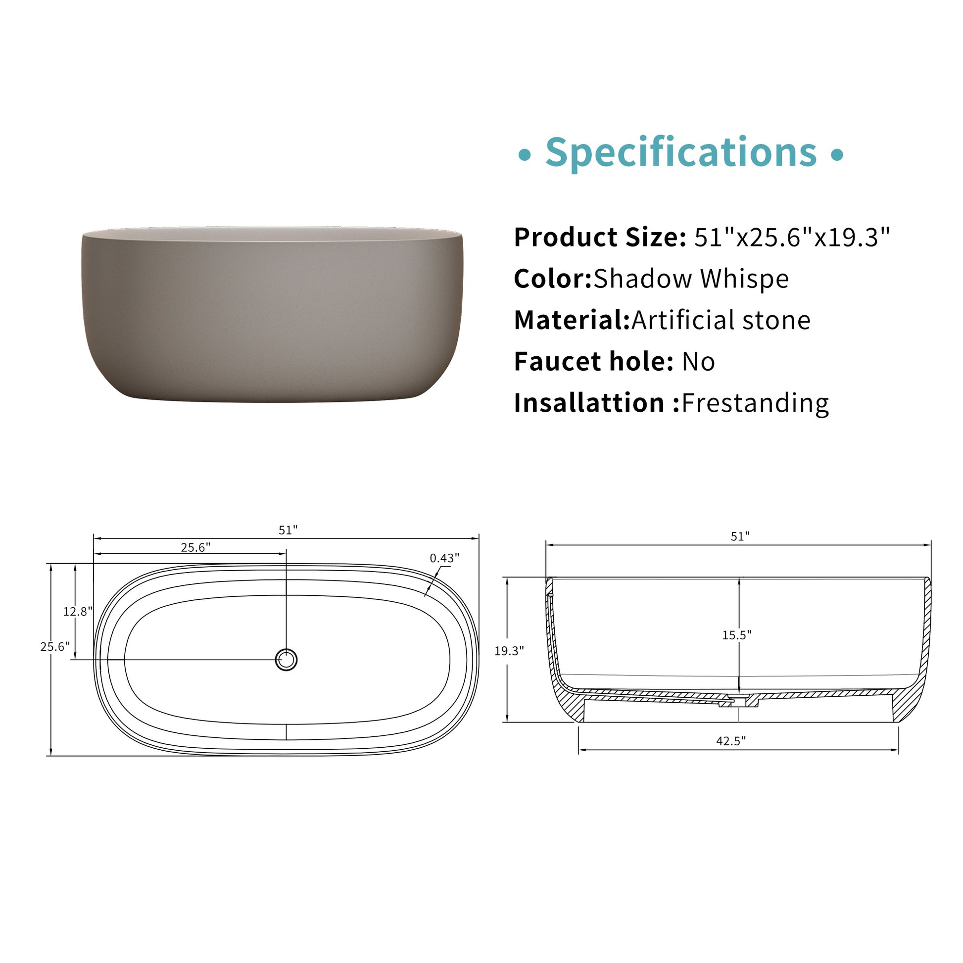 After a long busy day unwind in this 51 inch beige freestanding soaking tub Its solid surface resin stone material retains heat well and the ergonomic curve fits your waist perfectly The smooth hand polished finish and easy installation add warmth to modern bathrooms