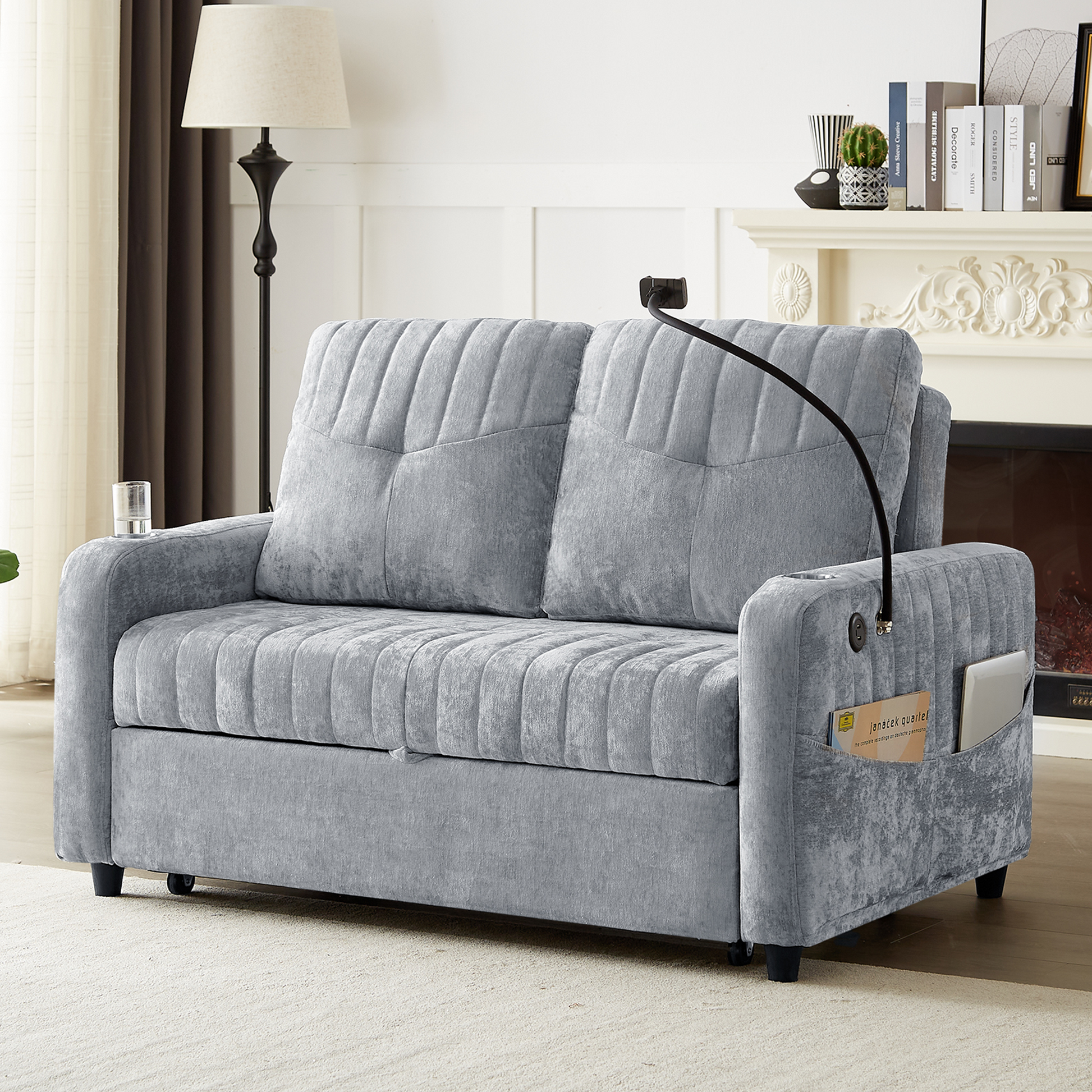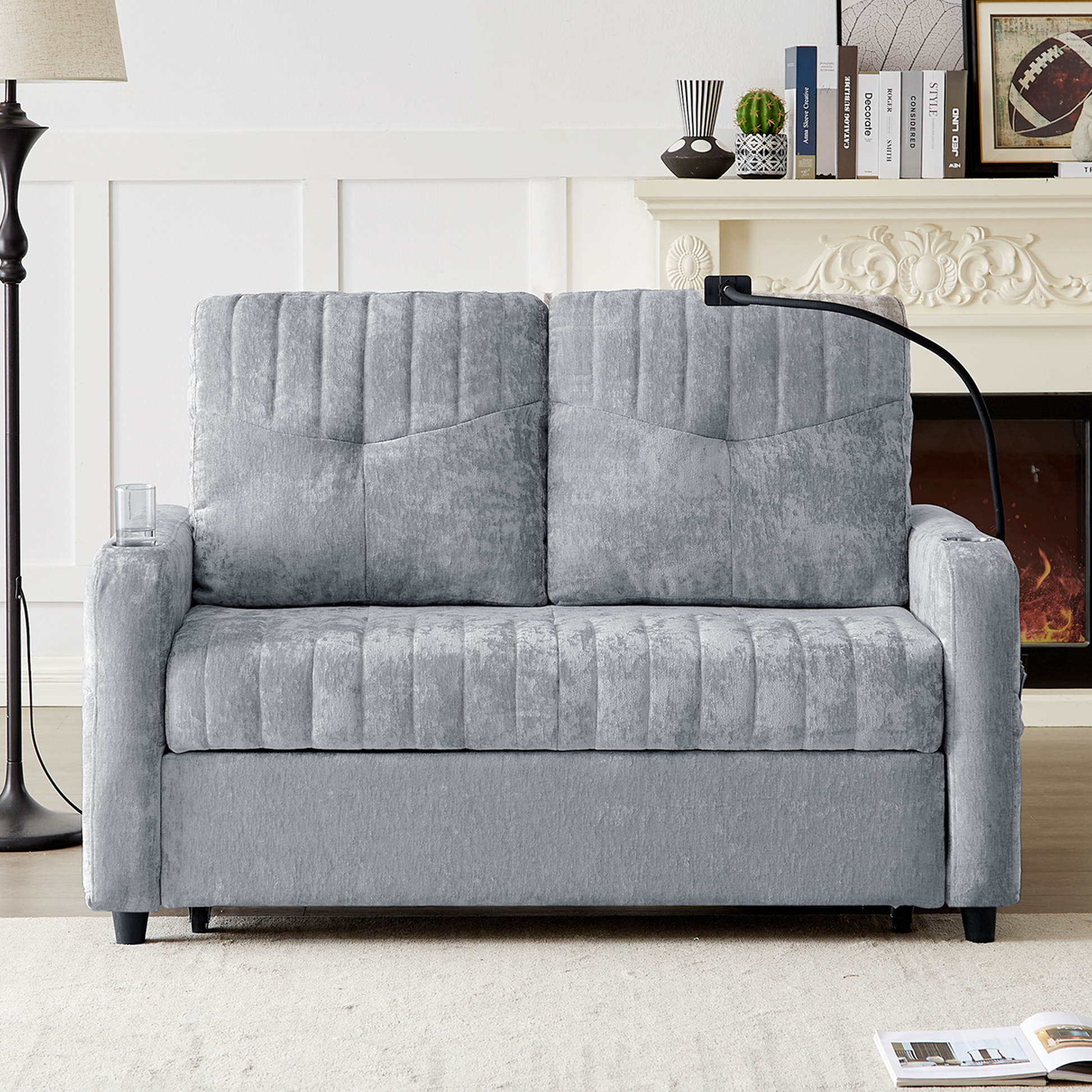 53.9 inch Modern Loveseat Pull-out Sofa Bed with Adjustable Backrest Two Cup Holders a Phone Holder Three Charging Ports and Side Storage Pockets for Living Room Grey
