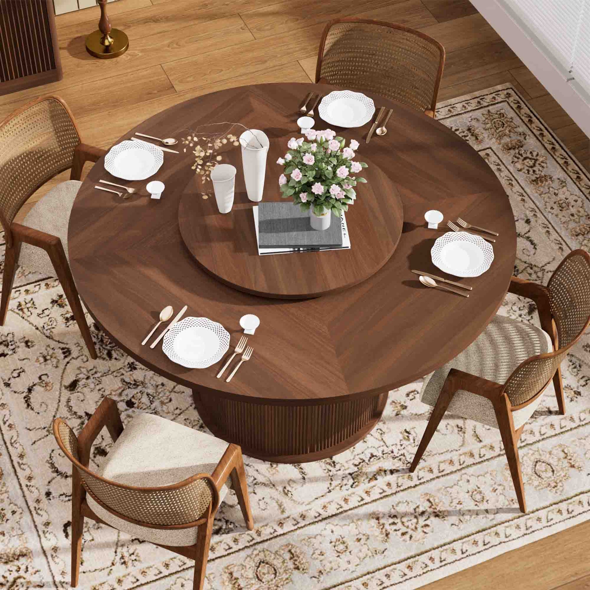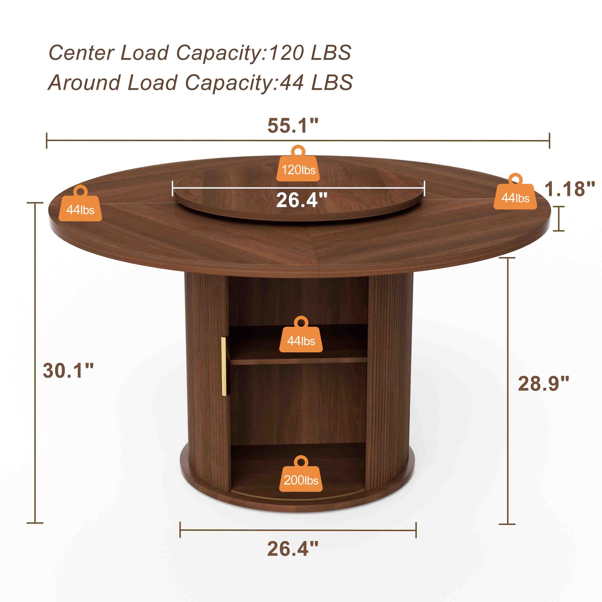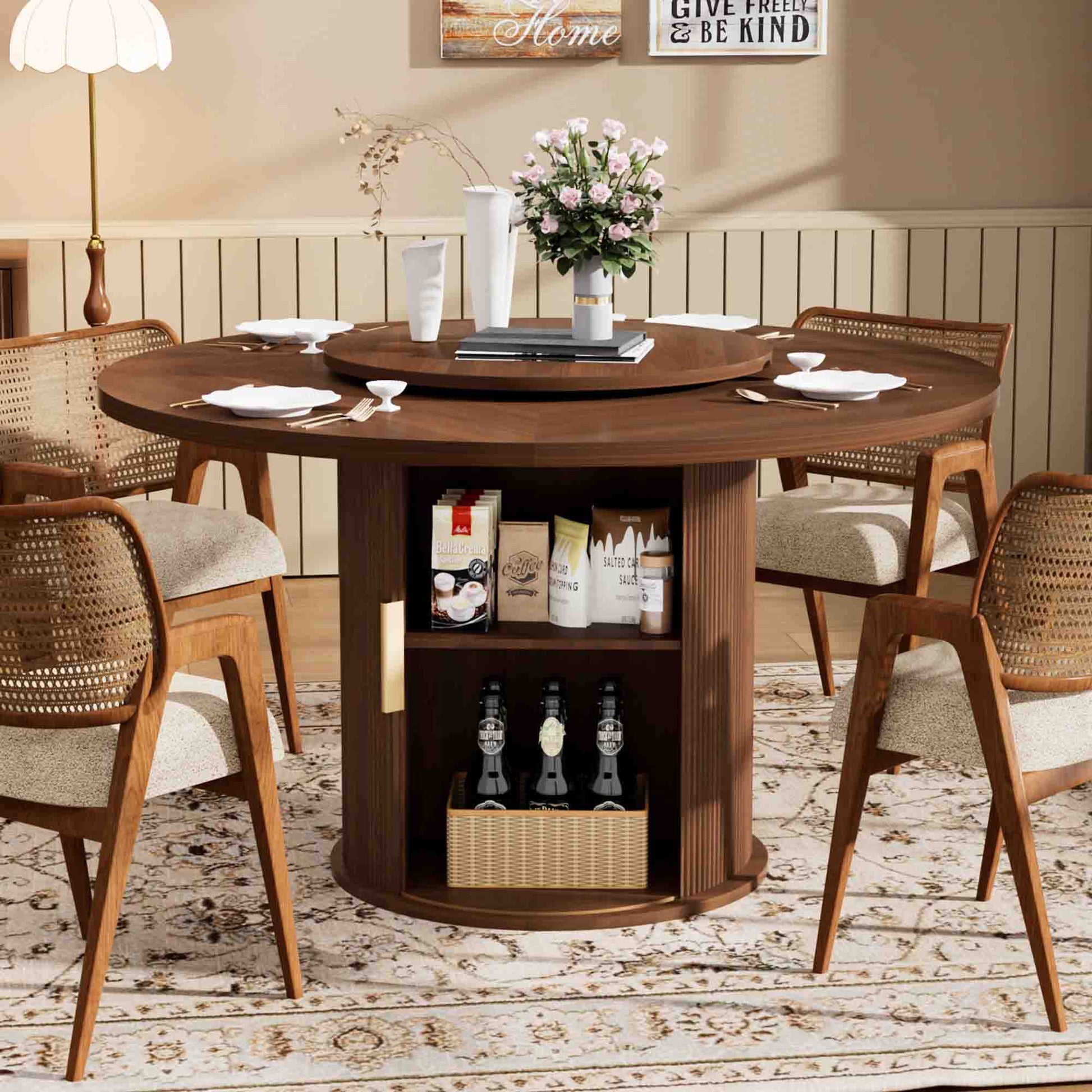 55 Inch Round Dining Table for Six with Rotating Tray and Double Tier Storage Rack Walnut Dining Room Table
