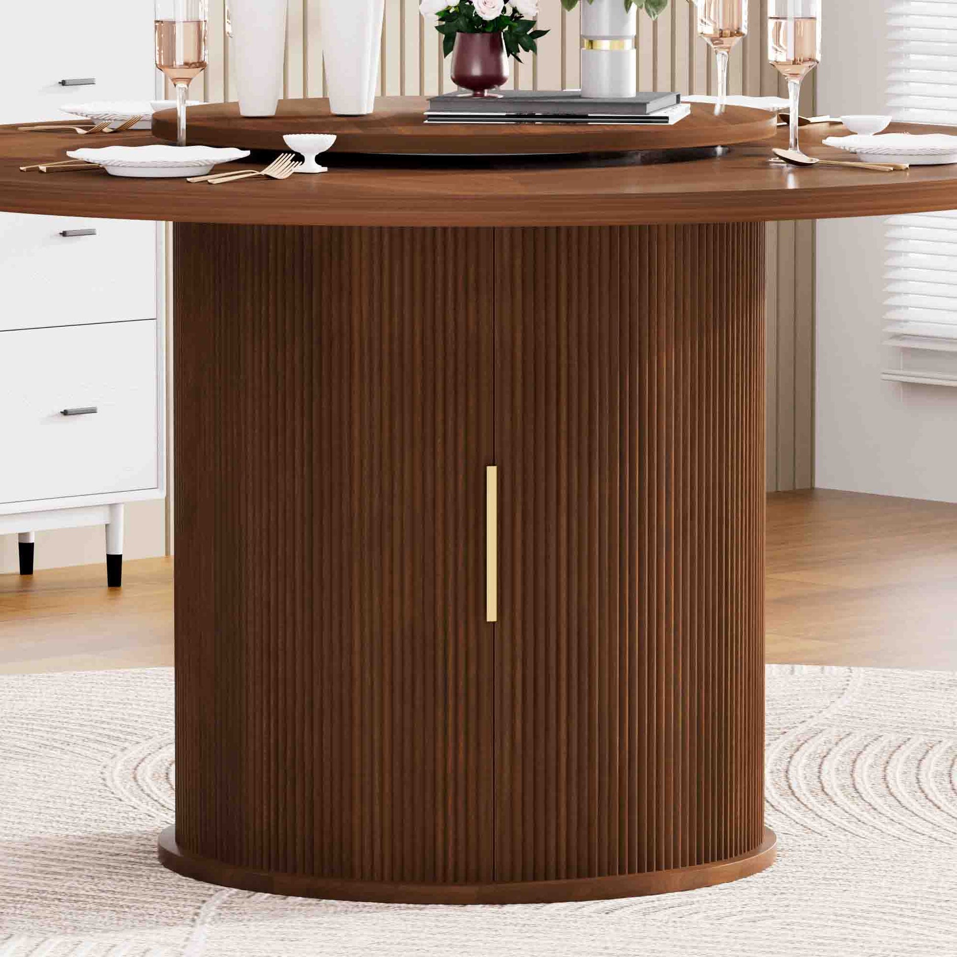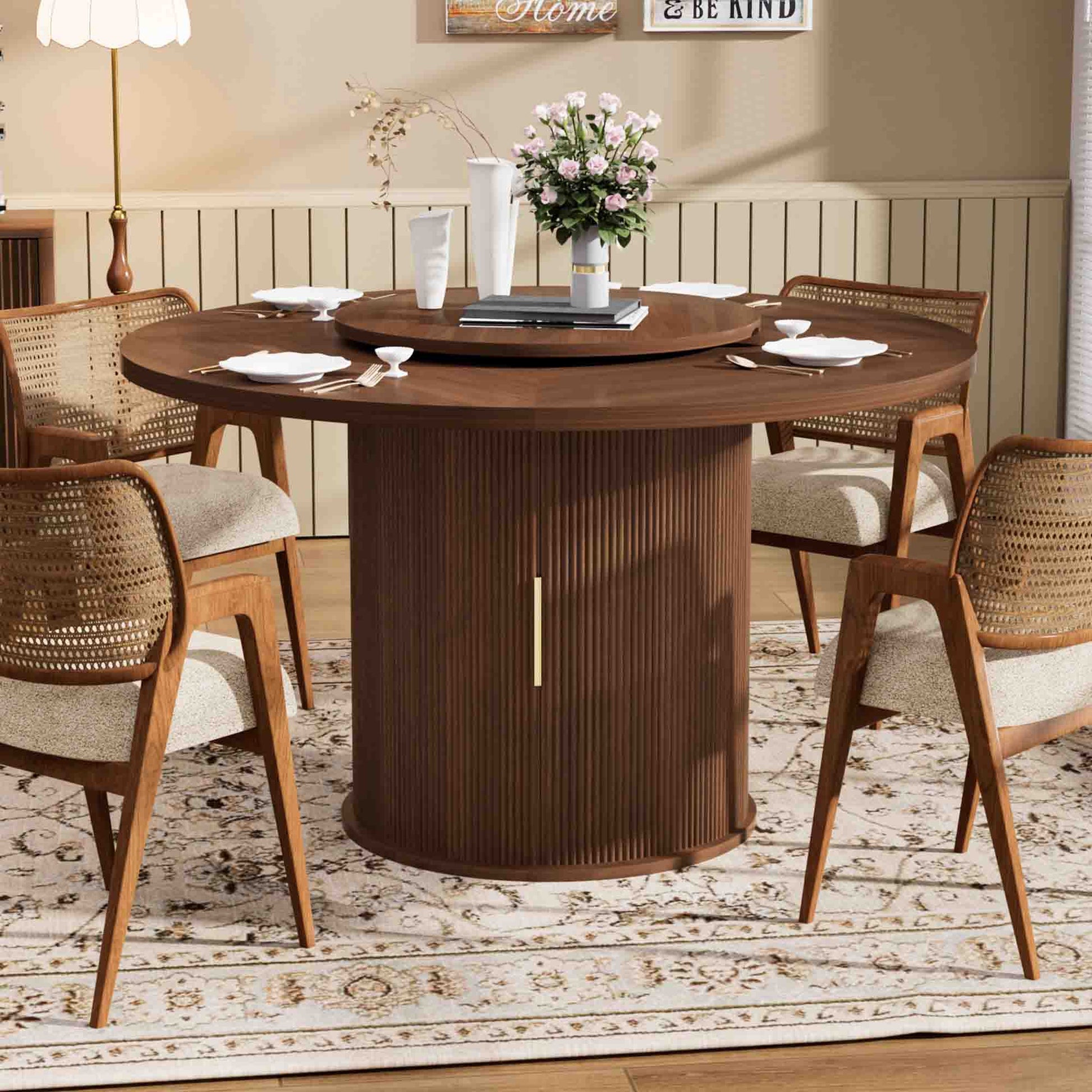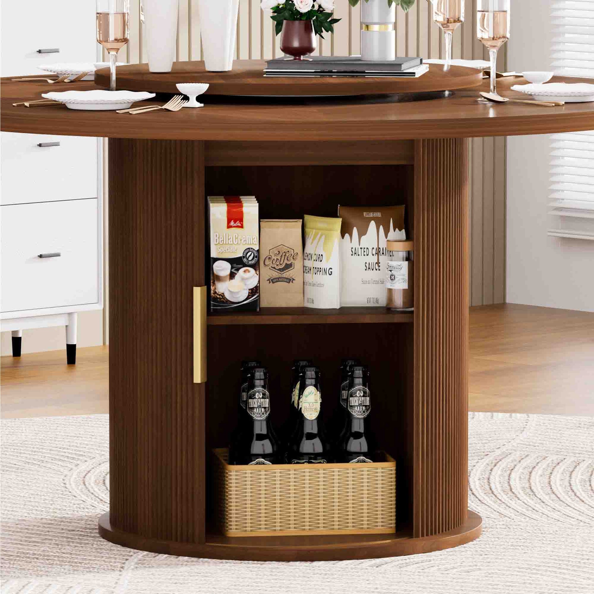 55 Inch Round Dining Table for Six with Rotating Tray and Double Tier Storage Rack Walnut Dining Room Table
