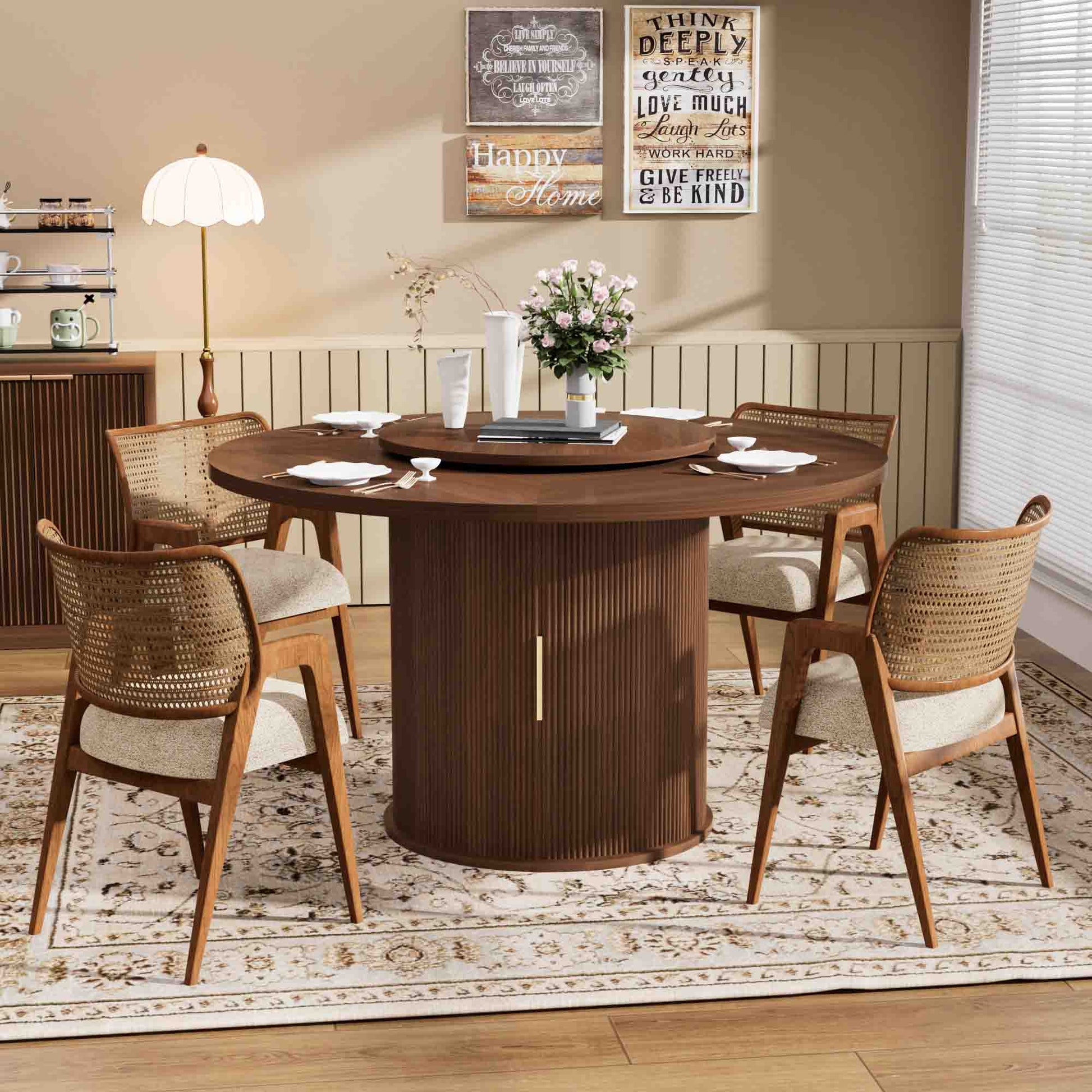 This 55 inch round dining table is designed to comfortably seat six people while maximizing space efficiency in modern dining rooms or living areas. It features a smooth rotating tabletop tray that makes sharing dishes during family meals and gatherings effortless and enjoyable. The integrated double tier storage rack keeps essential tableware nearby, helping maintain a tidy and organized tabletop. Crafted from durable particle board and MDF with a warm walnut finish, this table blends contemporary style with everyday practicality for long lasting use.
