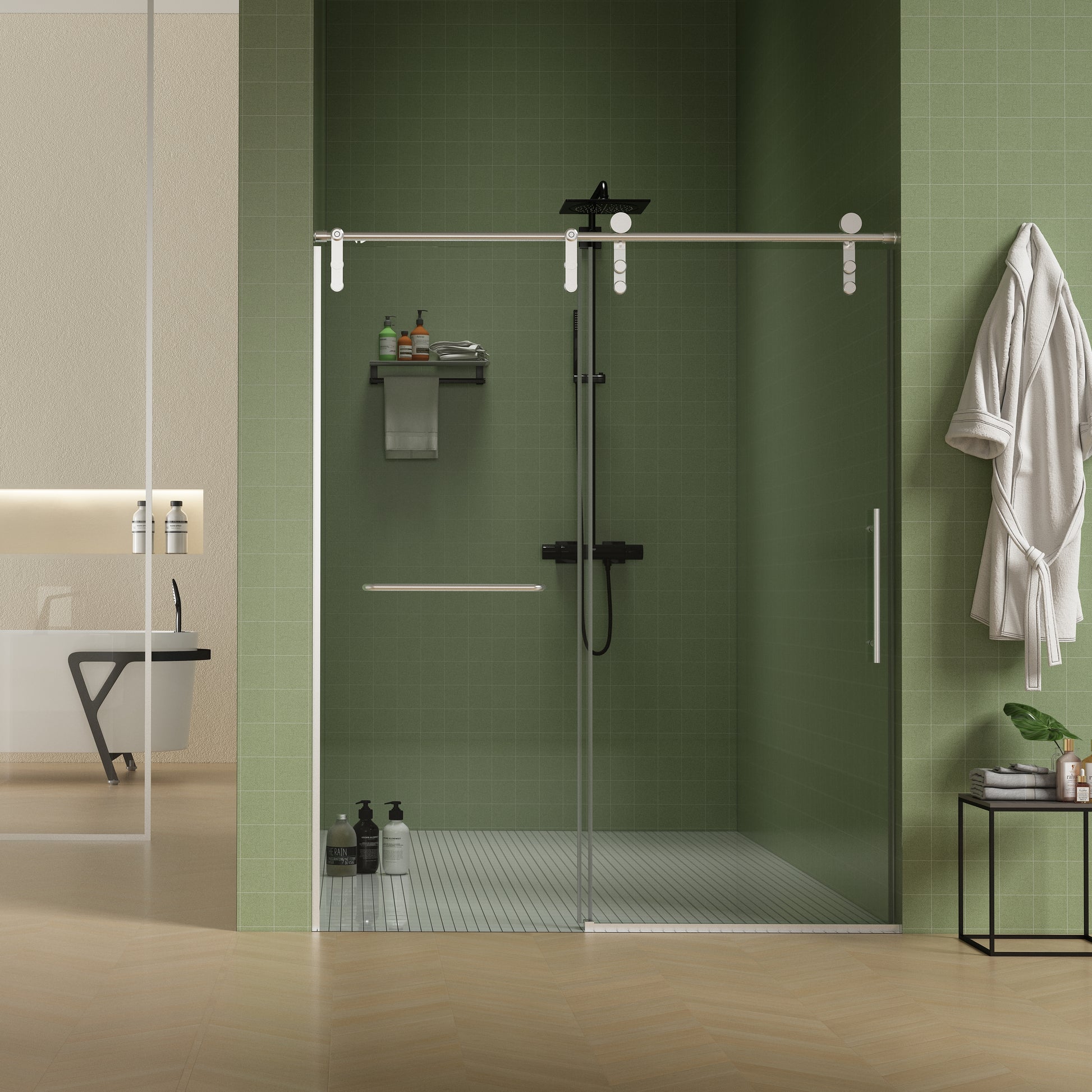 Upgrade your bathroom with this frameless single sliding shower door, designed to fit openings from 56" to 60" wide and standing 70" tall. Made from 5/16" (8mm) SGCC & ANSI-certified tempered safety glass, it combines exceptional durability with a sleek modern look. The brushed nickel stainless steel hardware resists corrosion and rust, while the double-sided easy-clean coating keeps the glass clear and low-maintenance. The integrated towel bar adds convenience, and the precision buffer system ensures smooth, quiet operation while preventing hard collisions. The waterproof threshold system keeps your bathroom floor dry, and the reversible installation supports both left- and right-hand openings for flexible placement.