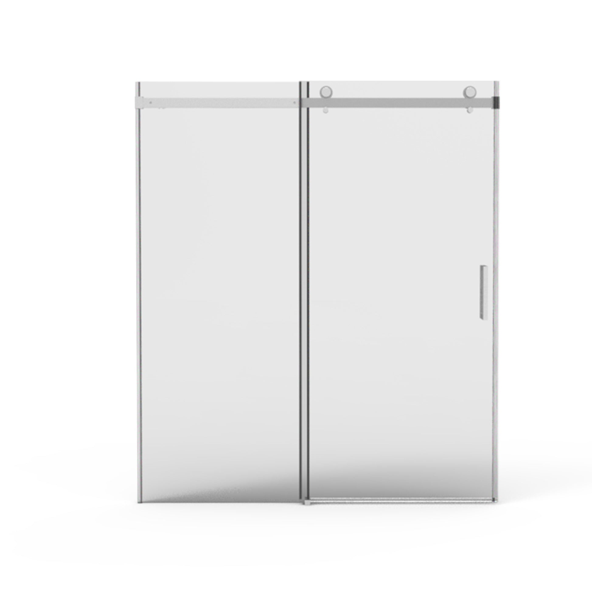 This frameless sliding shower door is designed to fit openings from 56" to 60" wide and stands 70" high, offering a sleek upgrade for modern bathrooms. Crafted from 5/16" (8mm) SGCC & ANSI-certified tempered safety glass, it delivers exceptional durability, shatter resistance, and long-term reliability. The double-sided easy-clean coating repels water stains and minimizes cleaning effort, while the brushed nickel stainless steel hardware adds a sophisticated touch and resists corrosion. Equipped with stainless steel pulleys and a built-in buffer, this shower door glides smoothly and quietly, and its waterproof threshold system keeps your bathroom floor clean and dry.