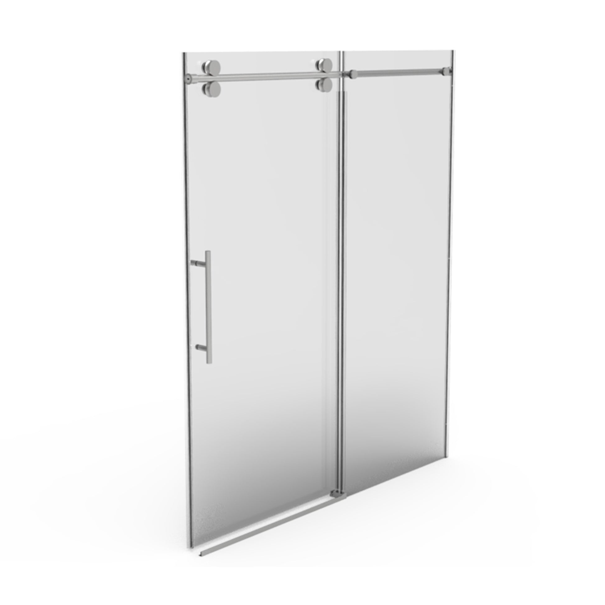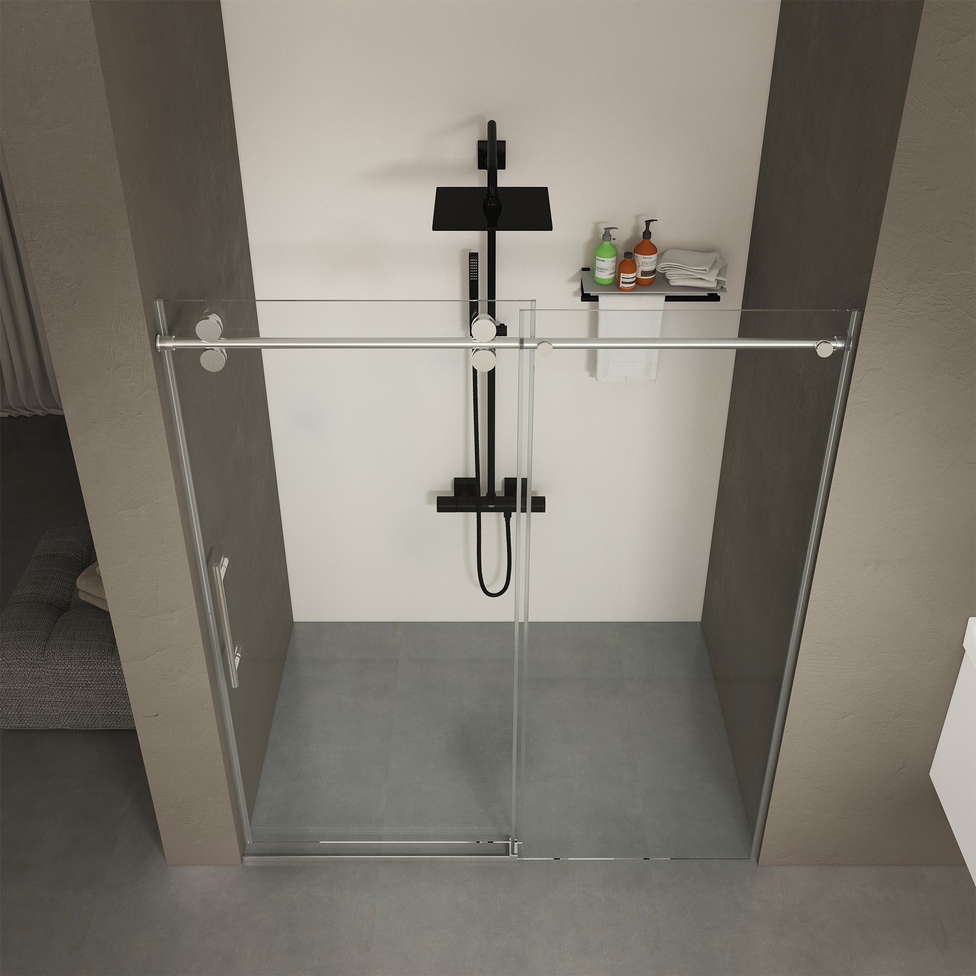 This frameless sliding shower door fits openings from 56" to 60" wide and stands 70" tall, providing a modern upgrade to your bathroom space. Made from 5/16" (8mm) SGCC & ANSI-certified tempered safety glass, it offers outstanding durability, impact resistance, and shatter protection. The double-sided easy-clean coating repels water and stains for low-maintenance beauty, while the chrome-finished stainless steel hardware resists corrosion in humid environments. High-quality stainless steel pulleys and a built-in buffer ensure smooth, quiet sliding, and the waterproof threshold design helps keep your bathroom floor dry and tidy.