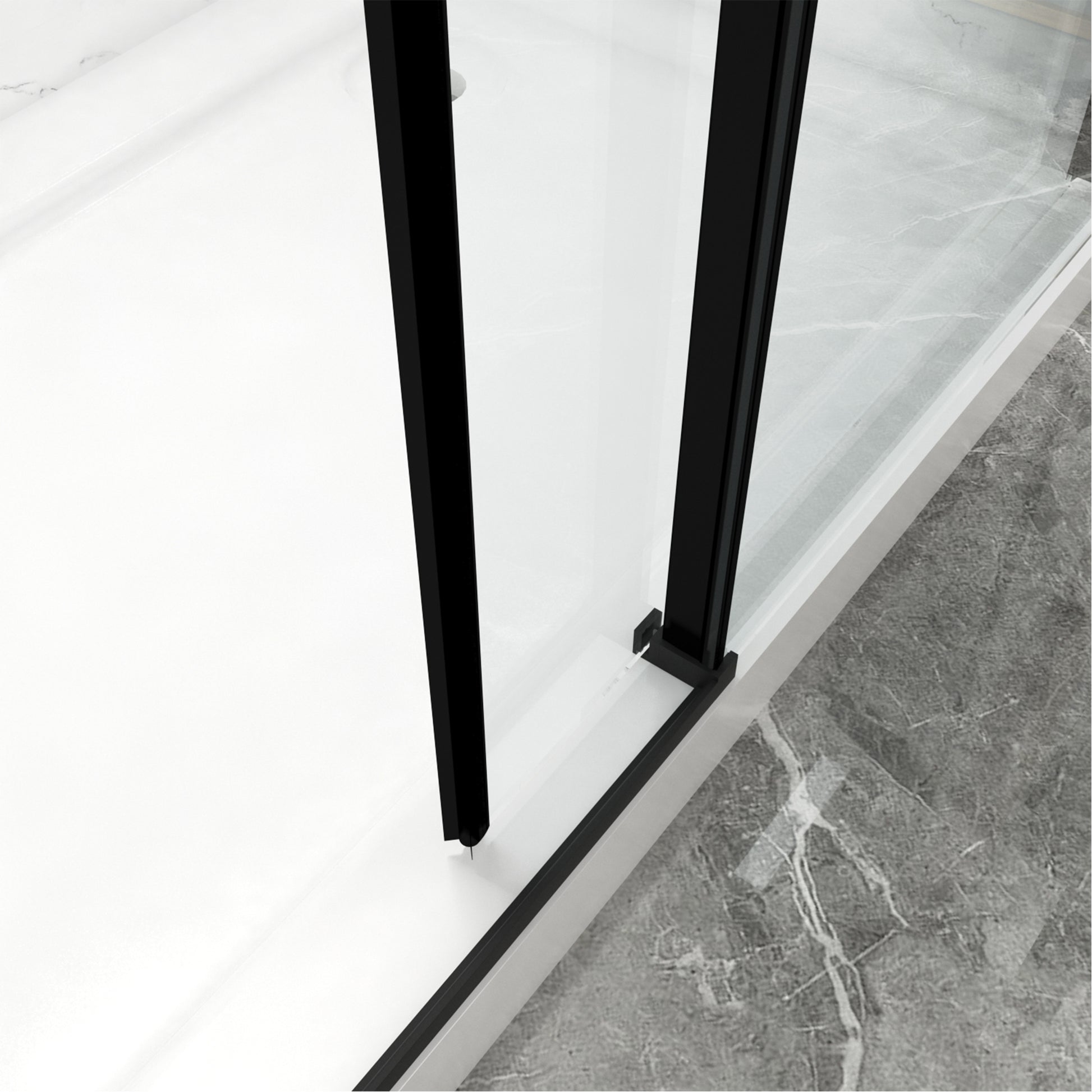 This frameless sliding shower door fits openings from 56" to 60" wide and stands 70" high, offering a sleek and space-saving upgrade for modern bathrooms. Built with 5/16" (8mm) SGCC & ANSI-certified tempered safety glass, it provides exceptional durability, shatter resistance, and a long service life. The double-sided easy-clean coating repels water stains, keeping the glass crystal clear with minimal maintenance. The matte black stainless steel hardware resists corrosion and rust, while the stainless steel pulleys and buffer system ensure smooth, quiet operation. Its waterproof threshold keeps the bathroom floor dry, and the reversible design allows for left or right installation to suit your layout.
